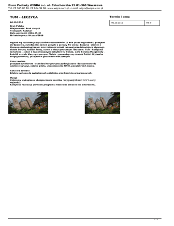 Biuro Podróży WIGRA s.c. ul. Człuchowska 25 01-360 Warszawa Tel. 22 665 06 06, 22 664 94 86, www.wigra.com.pl, e-mail: [email protected] TUM - ŁECZYCA 08.10.2016 Termin i cena 08.10.2016 99 zł Kraj: Polska Miejscowość: Brak danych Transport: Autokar Data ważności: 2016-05-07 Nr katalogowy: Wczasy/2016 wyjazd wg rozkładu jazdy (zbiórka uczestników 15 min przed wyjazdem), przejazd do Oporowa, zwiedzanie: zamek gotycki z połowy XV wieku. Łęczyca - Zamek z Muzeum Archeologicznym oraz zbiorami sztuki ludowej przedstawiające słynnego diabła Borutę, kościół farny, rynek z klasycystycznym ratuszem. Tum - kolegiata romańska - jeden z najcenniejszych zabytków w Polsce. Góra Świętej Małgorzaty kościół w stylu klasycystycznym. Piątek - geometryczny środek Polski. Wyjazd w drogę powrotną, przyjazd w godzinach wieczornych. Cena zawiera przejazd autokarem - standard turystyczny podwyższony (dostosowany do wielkości grupy), opieka pilota, ubezpieczenie NNW, podatek VAT-marża. Cena nie zawiera biletów wstępu do zwiedzanych obiektów oraz kosztów programowych. Uwagi Zalecamy wykupienie ubezpieczenia kosztów rezygnacji (koszt 3,5 % ceny wyjazdu). Kolejność realizacji punktów programu może ulec zmianie lub odwróceniu. 1/1 Powered by TCPDF (www.tcpdf.org)