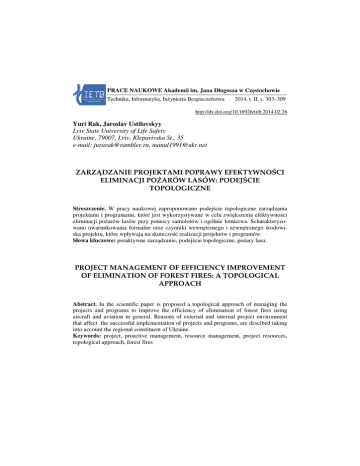 PRACE NAUKOWE Akademii im. Jana Długosza w Częstochowie ęstochowie Technika, Informatyka, Inżynieria In Bezpieczeństwa 2014, t. II, s. 303–309 303 http://dx.doi.org/10.16926/tiib.2014.02.26 Yuri Rak, Jaroslav Ustilovskyy Lviv State University of Life Safety Ukraine, 79007, 9007, Lviv, Kleparivska St., 35 e-mail: [email protected], [email protected] [email protected] ZARZĄDZANIE DZANIE PROJEKTAMI PROJEKTAMI POPRAWY EFEKTYWNOŚCI EFEKTYWNO ELIMINACJI POśARÓW PO LASÓW: PODEJŚCIE CIE TOPOLOGICZNE Streszczenie. W pracy naukowej zaproponowano podejście podej topologiczne pologiczne zarządzania zarz projektami i programami, programami które jest wykorzystywane w celu zwiększeniаа efektywności efektywno eliminacji pożarów arów lasów przy pomocy samolotów i ogólnie lotnictwa. ScharakteryzoScharakteryz wano uwarunkowania formalne oraz czynniki wewnętrznego i zewnętrznego trznego środowiska projektu, tu, które wpływają wpływaj na skuteczość realizacji projektów i programów.. Słowa kluczowe: proaktywne zarządzanie, zarz podejście topologiczne, pożary ary lasu. lasu PROJECT MANAGEMENT OF EFFICIENCY EFFICIENCY IMPROVEMENT OF ELIMINATION OF FOREST FO FIRES: A TOPOLOGICAL GICAL APPROACH Abstract. In the scientific paper is proposed a topological approach of managing the projects and programs to improve the efficiency of elimination of forest fires using aircraft and aviation in general. Reasons of external and internal project oject environment that affect the successful implementation of projects and programs, are descibed taking into account the regional constituent of Ukraine. Keywords: project, proactive management, resource management, project resources, topological ological approach, forest fires