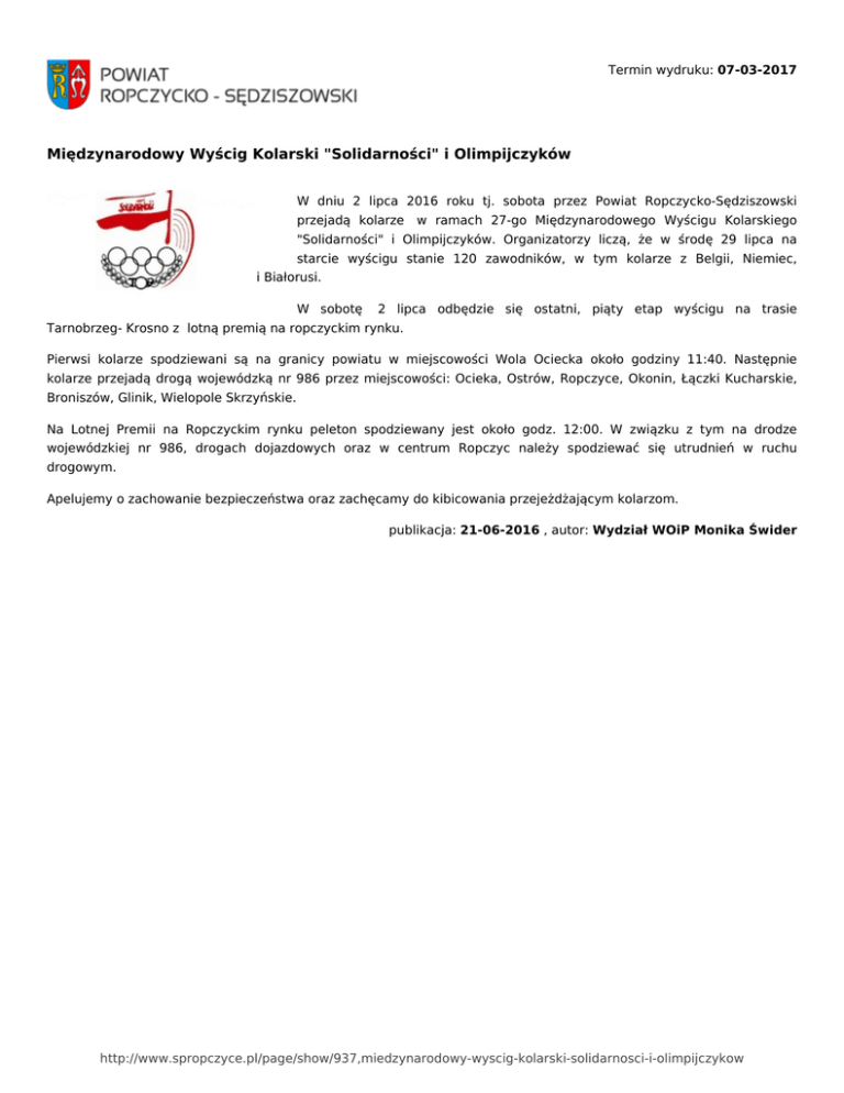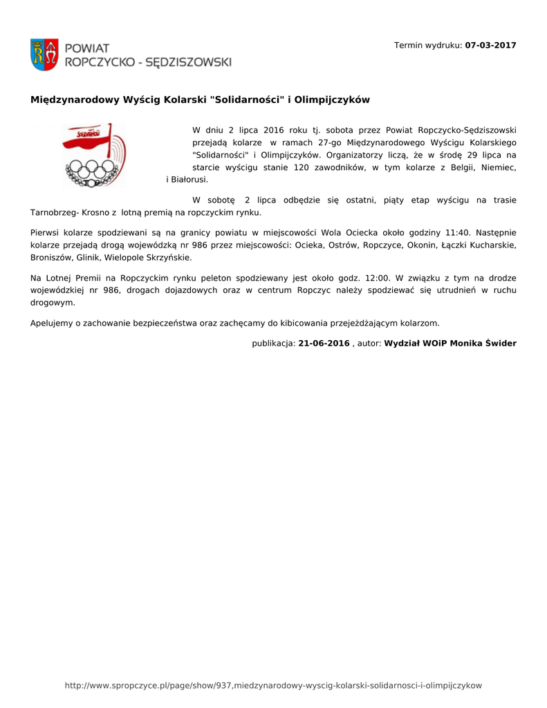 Termin wydruku: 07-03-2017 Międzynarodowy Wyścig Kolarski "Solidarności" i Olimpijczyków W dniu 2 lipca 2016 roku tj. sobota przez Powiat Ropczycko-Sędziszowski przejadą kolarze w ramach 27-go Międzynarodowego Wyścigu Kolarskiego "Solidarności" i Olimpijczyków. Organizatorzy liczą, że w środę 29 lipca na starcie wyścigu stanie 120 zawodników, w tym kolarze z Belgii, Niemiec, Włoch, Hiszpanii, Czech, Słowacji i Białorusi. W sobotę 2 lipca odbędzie się ostatni, piąty etap wyścigu na trasie Tarnobrzeg- Krosno z lotną premią na ropczyckim rynku. Pierwsi kolarze spodziewani są na granicy powiatu w miejscowości Wola Ociecka około godziny 11:40. Następnie kolarze przejadą drogą wojewódzką nr 986 przez miejscowości: Ocieka, Ostrów, Ropczyce, Okonin, Łączki Kucharskie, Broniszów, Glinik, Wielopole Skrzyńskie. Na Lotnej Premii na Ropczyckim rynku peleton spodziewany jest około godz. 12:00. W związku z tym na drodze wojewódzkiej nr 986, drogach dojazdowych oraz w centrum Ropczyc należy spodziewać się utrudnień w ruchu drogowym. Apelujemy o zachowanie bezpieczeństwa oraz zachęcamy do kibicowania przejeżdżającym kolarzom. publikacja: 21-06-2016 , autor: Wydział WOiP Monika Świder http://www.spropczyce.pl/page/show/937,miedzynarodowy-wyscig-kolarski-solidarnosci-i-olimpijczykow