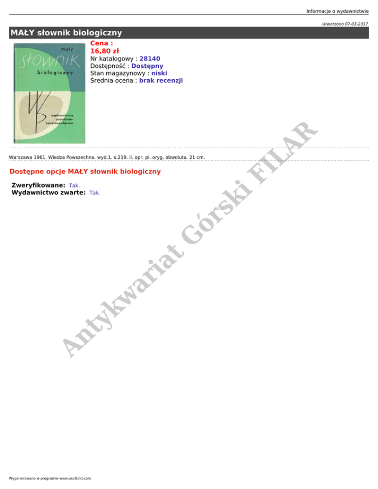 Informacje o wydawnictwie Utworzono 07-03-2017 MAŁY słownik biologiczny Cena : 16,80 zł LA R Nr katalogowy : 28140 Dostępność : Dostępny Stan magazynowy : niski Średnia ocena : brak recenzji FI Warszawa 1961. Wiedza Powszechna. wyd.1. s.219. il. opr. pł. oryg. obwoluta. 21 cm. Dostępne opcje MAŁY słownik biologiczny An ty k w ar ia t G ór sk i Zweryfikowane: Tak. Wydawnictwo zwarte: Tak. Wygenerowano w programie www.oscGold.com