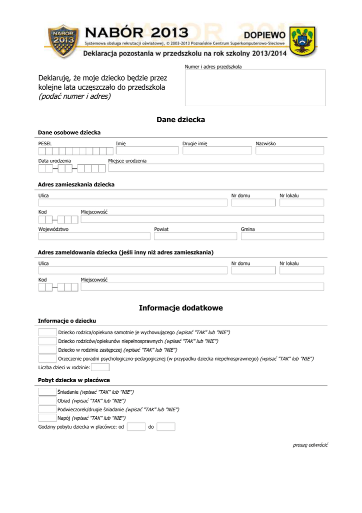 Numer i adres przedszkola Deklaruję, że moje dziecko będzie przez kolejne lata uczęszczało do przedszkola (podać numer i adres) Dane dziecka Dane osobowe dziecka PESEL Imię Data urodzenia — Drugie imię Nazwisko Miejsce urodzenia — Adres zamieszkania dziecka Ulica Nr domu Kod Nr lokalu Miejscowość — Województwo Powiat Gmina Adres zameldowania dziecka (jeśli inny niż adres zamieszkania) Ulica Nr domu Kod Nr lokalu Miejscowość — Informacje dodatkowe Informacje o dziecku Dziecko rodzica/opiekuna samotnie je wychowującego (wpisać "TAK" lub "NIE") Dziecko rodziców/opiekunów niepełnosprawnych (wpisać "TAK" lub "NIE") Dziecko w rodzinie zastępczej (wpisać "TAK" lub "NIE") Orzeczenie poradni psychologiczno-pedagogicznej (w przypadku dziecka niepełnosprawnego) (wpisać "TAK" lub "NIE") Liczba dzieci w rodzinie: Pobyt dziecka w placówce Śniadanie (wpisać "TAK" lub "NIE") Obiad (wpisać "TAK" lub "NIE") Podwieczorek/drugie śniadanie (wpisać "TAK" lub "NIE") Napój (wpisać "TAK" lub "NIE") Godziny pobytu dziecka w placówce: od do proszę odwrócić Zapis do klasy I szkoły podstawowej Wypełniają rodzice dzieci pięcioletnich i sześcioletnich Szkoła obwodowa Preferowana szkoła (jeśli inna niż szkoła obwodowa) Dane rodziców/prawnych opiekunów Dane matki/prawnej opiekunki dziecka Dane ojca/prawnego opiekuna dziecka Imię Imię Nazwisko (obecne) Nazwisko Telefon kontaktowy Telefon kontaktowy Adres zamieszkania matki/opiekunki (jeśli inny niż adres zamieszkania dziecka) Adres zamieszkania ojca/opiekuna (jeśli inny niż adres zamieszkania dziecka) Ulica Ulica Nr domu Kod Miejscowość — Nr lokalu Nr domu Kod Nr lokalu Miejscowość — Zakład pracy matki/opiekunki Zakład pracy ojca/opiekuna Nazwa i adres zakładu pracy Nazwa i adres zakładu pracy Dodatkowe informacje o dziecku Inne telefony kontaktowe Oświadczam, że dane przedłożone w niniejszym podaniu są zgodne ze stanem faktycznym. Niniejszym przyjmuję do wiadomosci i wyrażam zgodę na przetwarzanie danych osobowych zawartych w niniejszym podaniu, w systemach informatycznych w celu przeprowadzenia procedury rekrutacji do przedszkola/oddziału przedszkolnego w szkole podstawowej. Przetwarzanie danych odbywać się będzie zgodnie z ustawą o ochronie danych osobowych (Dz. U. z 2002 r. Nr 101, poz. 926 z późniejszymi zmianami). Podpis rodzica/opiekuna Data przyjęcia deklaracji (wypełnia placówka) Uwaga! Wydrukowaną i podpisaną deklarację należy oddać w przedszkolu.