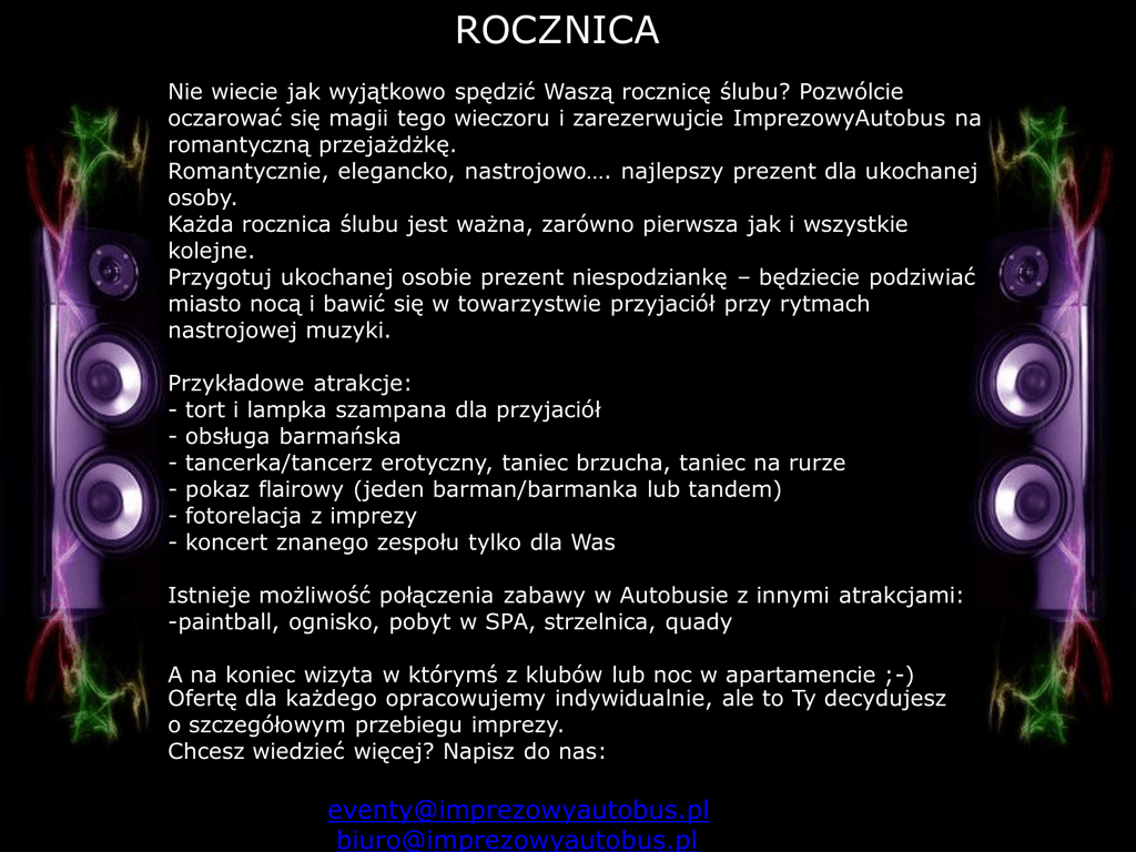 ROCZNICA Nie wiecie jak wyjątkowo spędzić Waszą rocznicę ślubu? Pozwólcie oczarować się magii tego wieczoru i zarezerwujcie ImprezowyAutobus na romantyczną przejażdżkę. Romantycznie, elegancko, nastrojowo…. najlepszy prezent dla ukochanej osoby. Każda rocznica ślubu jest ważna, zarówno pierwsza jak i wszystkie kolejne. Przygotuj ukochanej osobie prezent niespodziankę – będziecie podziwiać miasto nocą i bawić się w towarzystwie przyjaciół przy rytmach nastrojowej muzyki. Przykładowe atrakcje: - tort i lampka szampana dla przyjaciół - obsługa barmańska - tancerka/tancerz erotyczny, taniec brzucha, taniec na rurze - pokaz flairowy (jeden barman/barmanka lub tandem) - fotorelacja z imprezy - koncert znanego zespołu tylko dla Was Istnieje możliwość połączenia zabawy w Autobusie z innymi atrakcjami: -paintball, ognisko, pobyt w SPA, strzelnica, quady A na koniec wizyta w którymś z klubów lub noc w apartamencie ;-) Ofertę dla każdego opracowujemy indywidualnie, ale to Ty decydujesz o szczegółowym przebiegu imprezy. Chcesz wiedzieć więcej? Napisz do nas: [email protected] [email protected]