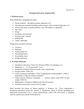 Załącznik nr 2 Przygotowanie pracy magisterskiej 1. Struktura pracy. Praca składa się z następujących części: Strona tytułowa – decyduje uczelnia( załącznik nr 4) Oświadczenie promotora/studenta (autora pracy)- tekst uczelnia (załącznik nr 5) Streszczenie pracy w języku polskim ( max 300 znaków ze spacjami) Spis treści Wstęp Rozdziały merytoryczne Posumowanie- wnioski Bibliografia Aneks- załączniki Wstęp pracy powinien zawierać: Cel pracy Hipotezę Pytania badawcze Metodologia pracy Konstrukcję pracy Źródła informacji 2. Wymogi redakcyjne Zasadniczy tekst pracy Times New Roman (TNR) (12) interlinia (1,5) Marginesy: L. - 3.5 cm pozostałe 2.5 cm Pojedyncza kolumna tekstu na stronie, tekst wyjustowany Przypisy dolne -TNR (10) Tytuł i numeracja rozdziałów ( TNR 14 pogrubiona) i podrozdziałów ( TNR 12 pogrubiona) wyłącznie cyframi arabskimi Tabele, Ryciny, Wykresy, Fotografie…….. numery własne, tytuł (TNR 12) oraz źródło (TNR 10) Bibliografia w kolejności alfabetycznej nazwisk autorów Numeracja stron pracy zaczyna się od wstępu Prace powinna być pisana na białym papierze, w formacie A4. Praca magisterska z akceptacją promotora winna być złożona w Dziekanacie szkoły w dwóch egzemplarzach, drukowane dwustronnie wraz z wersją elektroniczną ( płyta CD), dwie prace w miękkiej oprawie, grzbiet pracy płaski (termooprawa)
