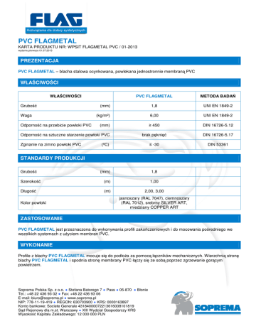 PVC FLAGMETAL KARTA PRODUKTU NR: WPSIT FLAGMETAL PVC / 01-2013 wydanie pierwsze 01.07.2013 PREZENTACJA PVC FLAGMETAL – blacha stalowa ocynkowana, powlekana jednostronnie membraną PVC WŁAŚCIWOŚCI PVC FLAGMETAL METODA BADAŃ (mm) 1,8 UNI EN 1849-2 (kg/m²) 6,00 UNI EN 1849-2 (mm) ≥ 450 DIN 16726-5.12 brak pęknięć DIN 16726-5.17 (ºC) ≤ -30 DIN 53361 (mm) 1,8 Szerokość (m) 1,00 Długość (m) 2,00, 3,00 WŁAŚCIWOŚCI Grubość Waga Odporność na przebicie powłoki PVC Odporność na sztuczne starzenie powłoki PVC Zginanie na zimno powłoki PVC STANDARDY PRODUKCJI Grubość Kolor powłoki jasnoszary (RAL 7047), ciemnoszary (RAL 7012), srebrny SILVER ART, miedziany COPPER ART ZASTOSOWANIE PVC FLAGMETAL jest przeznaczona do wykonywania profili zakończeniowych i do mocowania pośredniego we wszelkich systemach z użyciem membran PVC. WYKONANIE Profile z blachy PVC FLAGMETAL mocuje się do podłoża za pomocą łączników mechanicznych. Wierzchnią stronę blachy PVC FLAGMETAL i spodnia stronę membrany PVC łączy się ze sobą poprzez zgrzewanie gorącym powietrzem. Soprema Polska Sp. z o.o. ● Stefana Batorego 7 ● Pass ● 05-870 ● Błonie Tel.: +48 22 436 93 02 ● Fax: +48 22 436 93 06 E-mail: [email protected] ● www.soprema.pl NIP: 778-11-19-419 ● REGON: 630703900 ● KRS: 0000163897 Konto bankowe: Societe Generale 43184000072213616008101819 Sąd Rejonowy dla m.st. Warszawy ● XIII Wydział Gospodarczy KRS Wysokość Kapitału Zakładowego: 12 000 000 PLN FORMA DOSTAWY I MAGAZYNOWANIE Blacha jest dostarczana w arkuszach. Arkusze blachy i wykonane z niej profile należy przechowywać w suchych pomieszczeniach. CERTYFIKATY Wyrób przeznaczony jest jako element uzupełniający dla elastycznych wyrobów wodochronnych z tworzyw sztucznych. Dla takiego zastosowania nie ma opracowanej normy zharmonizowanej, w związku z czym nie jest wymagane oznakowanie znakiem CE. Zakłady produkcyjne spełniają wymogi certyfikatów: UNI EN ISO 9001 UNI EN ISO 14001 UWAGI W związku z własnościami membrany, NIE podlega wymaganiom EEC 79/831 regulującym niebezpieczne substancje. Jeśli produkt będzie w formie odpadu, zalecamy wysłanie go do autoryzowanych wysypisk lub do spalarni z piecem do spalania śmieci wyposażonym w komorę i system oczyszczania spalin. Kolory membran mają barwę zbliżoną do palety RAL. Poszczególne partie produkcyjne wyrobów w standardowych kolorach mogą się nieznacznie różnić odcieniem powierzchni eksponowanej, co nie ma wpywu na ich właściwości użytkowe. W przypadku zamówień membran w kolorach na życzenie, zamówienie dodatkowej partii towaru może wiązać się z różnicami w odcieniach membrany. W sytuacji gdy aspekt estetyczny membrany ma istotne znaczenie, należy zaznaczyć aby cała zamawiana partia towaru pochodziła z tej samej partii produkcyjnej, ewentualnie w przypadku gdy materiał pochodzi z różnych partii produkcyjnych, należy porównać odcienie materiału przed jego zamontowaniem. Powyższe różnice odcieni nie mogą być podstawą do złożenia reklamacji. Soprema Polska Sp. z o.o. ● Stefana Batorego 7 ● Pass ● 05-870 ● Błonie Tel.: +48 22 436 93 02 ● Fax: +48 22 436 93 06 E-mail: [email protected] ● www.soprema.pl NIP: 778-11-19-419 ● REGON: 630703900 ● KRS: 0000163897 Konto bankowe: Societe Generale 43184000072213616008101819 Sąd Rejonowy dla m.st. Warszawy ● XIII Wydział Gospodarczy KRS Wysokość Kapitału Zakładowego: 12 000 000 PLN