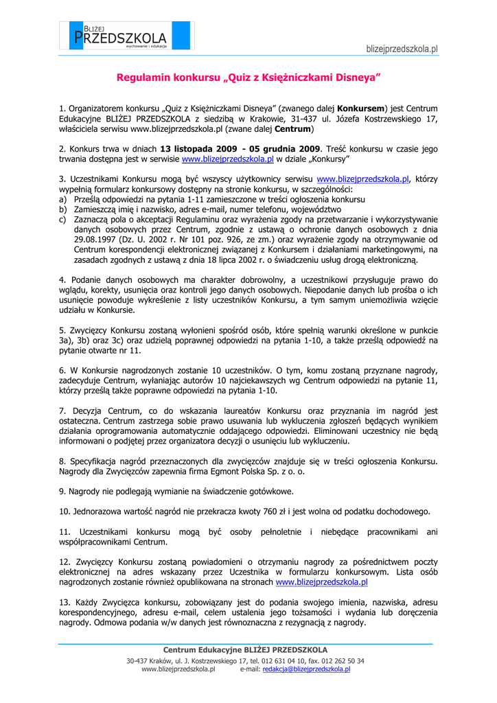 blizejprzedszkola.pl Regulamin konkursu „Quiz z KsięŜniczkami Disneya” 1. Organizatorem konkursu „Quiz z KsięŜniczkami Disneya” (zwanego dalej Konkursem) jest Centrum Edukacyjne BLIśEJ PRZEDSZKOLA z siedzibą w Krakowie, 31-437 ul. Józefa Kostrzewskiego 17, właściciela serwisu www.blizejprzedszkola.pl (zwane dalej Centrum) 2. Konkurs trwa w dniach 13 listopada 2009 - 05 grudnia 2009. Treść konkursu w czasie jego trwania dostępna jest w serwisie www.blizejprzedszkola.pl w dziale „Konkursy” 3. Uczestnikami Konkursu mogą być wszyscy uŜytkownicy serwisu www.blizejprzedszkola.pl, którzy wypełnią formularz konkursowy dostępny na stronie konkursu, w szczególności: a) Prześlą odpowiedzi na pytania 1-11 zamieszczone w treści ogłoszenia konkursu b) Zamieszczą imię i nazwisko, adres e-mail, numer telefonu, województwo c) Zaznaczą pola o akceptacji Regulaminu oraz wyraŜenia zgody na przetwarzanie i wykorzystywanie danych osobowych przez Centrum, zgodnie z ustawą o ochronie danych osobowych z dnia 29.08.1997 (Dz. U. 2002 r. Nr 101 poz. 926, ze zm.) oraz wyraŜenie zgody na otrzymywanie od Centrum korespondencji elektronicznej związanej z Konkursem i działaniami marketingowymi, na zasadach zgodnych z ustawą z dnia 18 lipca 2002 r. o świadczeniu usług drogą elektroniczną. 4. Podanie danych osobowych ma charakter dobrowolny, a uczestnikowi przysługuje prawo do wglądu, korekty, usunięcia oraz kontroli jego danych osobowych. Niepodanie danych lub prośba o ich usunięcie powoduje wykreślenie z listy uczestników Konkursu, a tym samym uniemoŜliwia wzięcie udziału w Konkursie. 5. Zwycięzcy Konkursu zostaną wyłonieni spośród osób, które spełnią warunki określone w punkcie 3a), 3b) oraz 3c) oraz udzielą poprawnej odpowiedzi na pytania 1-10, a takŜe prześlą odpowiedź na pytanie otwarte nr 11. 6. W Konkursie nagrodzonych zostanie 10 uczestników. O tym, komu zostaną przyznane nagrody, zadecyduje Centrum, wyłaniając autorów 10 najciekawszych wg Centrum odpowiedzi na pytanie 11, którzy prześlą takŜe poprawne odpowiedzi na pytania 1-10. 7. Decyzja Centrum, co do wskazania laureatów Konkursu oraz przyznania im nagród jest ostateczna. Centrum zastrzega sobie prawo usuwania lub wykluczenia zgłoszeń będących wynikiem działania oprogramowania automatycznie oddającego odpowiedzi. Eliminowani uczestnicy nie będą informowani o podjętej przez organizatora decyzji o usunięciu lub wykluczeniu. 8. Specyfikacja nagród przeznaczonych dla zwycięzców znajduje się w treści ogłoszenia Konkursu. Nagrody dla Zwycięzców zapewnia firma Egmont Polska Sp. z o. o. 9. Nagrody nie podlegają wymianie na świadczenie gotówkowe. 10. Jednorazowa wartość nagród nie przekracza kwoty 760 zł i jest wolna od podatku dochodowego. 11. Uczestnikami konkursu współpracownikami Centrum. mogą być osoby pełnoletnie i niebędące pracownikami ani 12. Zwycięzcy Konkursu zostaną powiadomieni o otrzymaniu nagrody za pośrednictwem poczty elektronicznej na adres wskazany przez Uczestnika w formularzu konkursowym. Lista osób nagrodzonych zostanie równieŜ opublikowana na stronach www.blizejprzedszkola.pl 13. KaŜdy Zwycięzca konkursu, zobowiązany jest do podania swojego imienia, nazwiska, adresu korespondencyjnego, adresu e-mail, celem ustalenia jego toŜsamości i wydania lub doręczenia nagrody. Odmowa podania w/w danych jest równoznaczna z rezygnacją z nagrody. Centrum Edukacyjne BLIśEJ PRZEDSZKOLA 30-437 Kraków, ul. J. Kostrzewskiego 17, tel. 012 631 04 10, fax. 012 262 50 34 www.blizejprzedszkola.pl e-mail: [email protected] blizejprzedszkola.pl 14. Nagrody przesłane zostaną pocztą na adres korespondencyjny otrzymany od Zwycięzców. 15. W przypadku nie otrzymania przez Centrum potwierdzenia gotowości przyjęcia nagrody Zwycięzcą zostanie kolejna osoba wyznaczona przez Centrum, która spełni warunki opisane w punkcie 5. 16. Centrum nie ponosi odpowiedzialności za prawidłowość i terminowość doręczenia przez pocztę przesyłek wysyłanych w jego imieniu w związku z Konkursem. 17. Organizator nie ponosi odpowiedzialności za podanie przez Uczestnika niewłaściwych lub nieprawdziwych danych uniemoŜliwiających lub opóźniających wręczenie nagrody. 18. Wszelkie reklamacje dotyczące Konkursu mogą być składane przez Uczestników w formie pisemnej, listem poleconym na adres: Centrum Edukacyjne BLIśEJ PRZEDSZKOLA, z siedzibą ul. J.Kostrzewskiego 17, 30-437 Kraków z dopiskiem „Konkurs: Quiz z KsięŜniczkami Disneya”: a) Reklamacja powinna zawierać imię i nazwisko Uczestnika, adres do korespondencji, nr tel. oraz dokładny powód reklamacji b) Reklamacje rozpatrywane będą przez Organizatora w terminie 21 dni od dnia otrzymania. c) W razie negatywnego dla Uczestnika rozstrzygnięcia reklamacji o wyniku tego postępowania Uczestnik zostanie powiadomiony listem poleconym. Stanowisko Organizatora zajęte po rozpatrzeniu Reklamacji będzie ostateczne. d) Roszczenia z tytułu udziału w Konkursie nie mogą być zgłaszane po upływie 14 dni od dnia zakończenia Konkursu. 19. Wszelkie spory wynikłe z tytułu wykonania zobowiązań związanych z Konkursem będą rozstrzygane przez sąd właściwy dla siedziby Organizatora. 20. Regulamin wchodzi w Ŝycie z dniem 13 listopada 2009 i obowiązuje do dnia 05 grudnia 2009r. 21. Udział w Konkursie oznacza zgodę Uczestnika na warunki Regulaminu Konkursu 22. Organizator zastrzega sobie prawo zmiany Regulaminu w trakcie trwania Konkursu, o czym bezzwłocznie poinformuje Uczestników umieszczając nową jego wersję na stronach serwisu www.blizejprzedszkola.pl 23. Niniejszy regulamin stanowi jedyny dokument określający zasady Konkursu i jest udostępniony wszystkim potencjalnym Uczestnikom Konkursu na stronach internetowych portalu www.blizejprzedszkola.pl oraz w siedzibie Centrum. 24. Wszelkie pytania dotyczące [email protected] Konkursu naleŜy kierować na Centrum Edukacyjne 