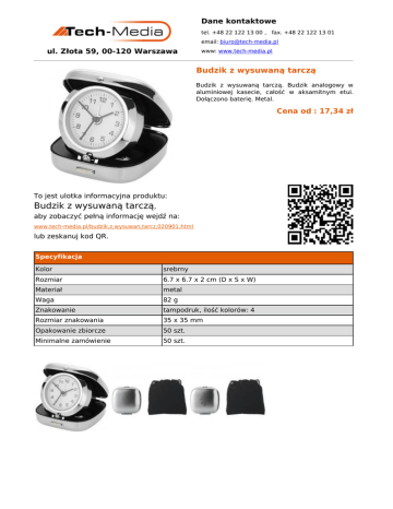 Dane kontaktowe tel. +48 22 122 13 00 , fax. +48 22 122 13 01 email: [email protected] ul. Złota 59, 00-120 Warszawa www: www.tech-media.pl Budzik z wysuwaną tarczą Budzik z wysuwaną tarczą. Budzik analogowy w aluminiowej kasecie, całość w aksamitnym etui. Dołączono baterię. Metal. Cena od : 17,34 zł To jest ulotka informacyjna produktu: Budzik z wysuwaną tarczą, aby zobaczyć pełną informację wejdź na: www.tech-media.pl/budzik,z,wysuwan,tarcz,020901.html lub zeskanuj kod QR. Specyfikacja Kolor srebrny Rozmiar 6.7 x 6.7 x 2 cm (D x S x W) Materiał metal Waga 82 g Znakowanie tampodruk, ilość kolorów: 4 Rozmiar znakowania 35 x 35 mm Opakowanie zbiorcze 50 szt. Minimalne zamówienie 50 szt.