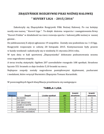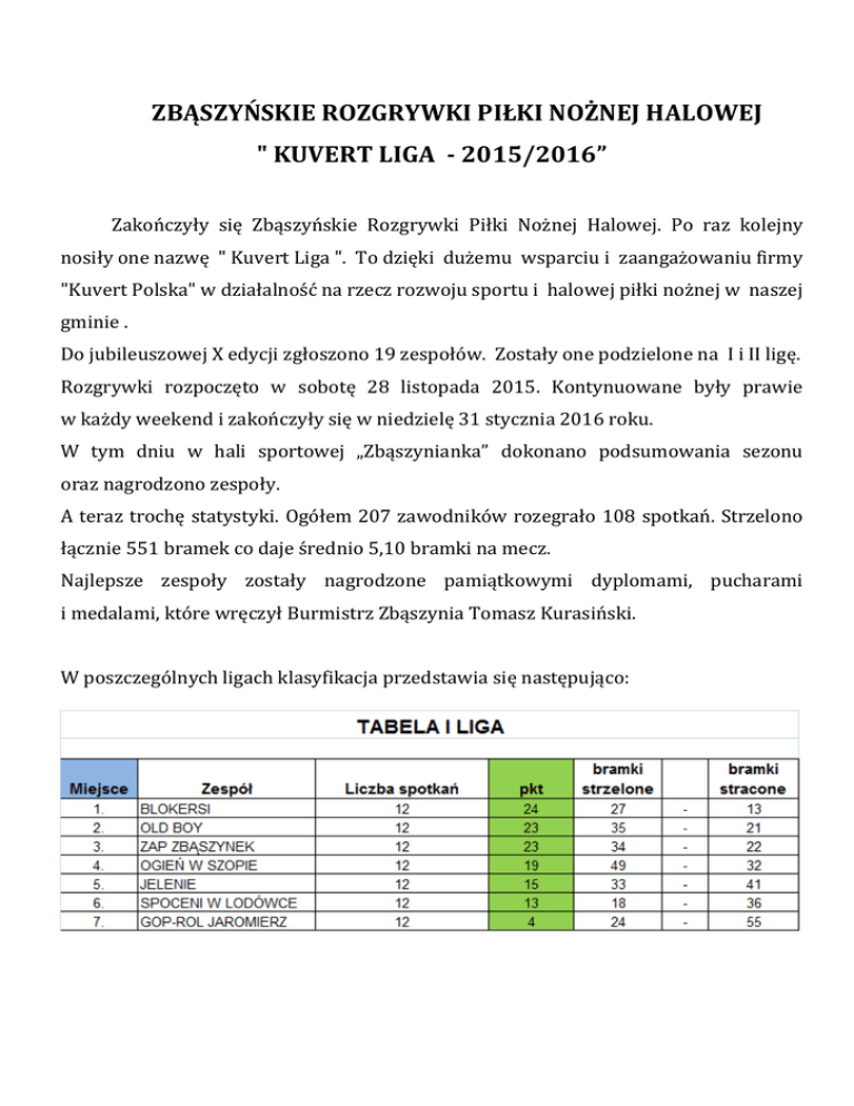 ZBĄSZYŃSKIE ROZGRYWKI PIŁKI NOŻNEJ HALOWEJ " KUVERT LIGA - 2015/2016” Zakończyły się Zbąszyńskie Rozgrywki Piłki Nożnej Halowej. Po raz kolejny nosiły one nazwę " Kuvert Liga ". To dzięki dużemu wsparciu i zaangażowaniu firmy "Kuvert Polska" w działalność na rzecz rozwoju sportu i halowej piłki nożnej w naszej gminie . Do jubileuszowej X edycji zgłoszono 19 zespołów. Zostały one podzielone na I i II ligę. Rozgrywki rozpoczęto w sobotę 28 listopada 2015. Kontynuowane były prawie w każdy weekend i zakończyły się w niedzielę 31 stycznia 2016 roku. W tym dniu w hali sportowej „Zbąszynianka” dokonano podsumowania sezonu oraz nagrodzono zespoły. A teraz trochę statystyki. Ogółem 207 zawodników rozegrało 108 spotkań. Strzelono łącznie 551 bramek co daje średnio 5,10 bramki na mecz. Najlepsze zespoły zostały nagrodzone pamiątkowymi dyplomami, pucharami i medalami, które wręczył Burmistrz Zbąszynia Tomasz Kurasiński. W poszczególnych ligach klasyfikacja przedstawia się następująco: Wyróżniono także zawodników w klasyfikacjach indywidualnych. Najskuteczniejszymi strzelcami okazali się kolejno w lidze I Łukasz Masiorek – Gop-Rol Jaromierz, w lidze II Tomasz Tratwal – Euro- Płyta. Najlepszymi bramkarzami zostali wybrani w lidze I Bartosz Markiewicz – Blokersi, w lidze II Krzysztof Kubaś – Patriotyczny Zbąszyń. Najbardziej wartościowymi zawodnikami wybrano w lidze I Pawła Kamyszka – Zap Zbąszynek, w lidze II Mariusza Połomkę – Extaler Logistic. Sędziami rozgrywek byli: Mikołaj Opic, Przemysław Woźniak, Tomasz Siedlarz, natomiast obsługę techniczną zapewnili: Wiktoria Klimek oraz Jakub Puchacz. Organizatorami zawodów byli: Zbąszyńskie Centrum Sportu, Turystyki i Rekreacji, Międzyszkolny Uczniowski Klub Sportowy „Gimnazjon” i firma "Kuvert Polska".