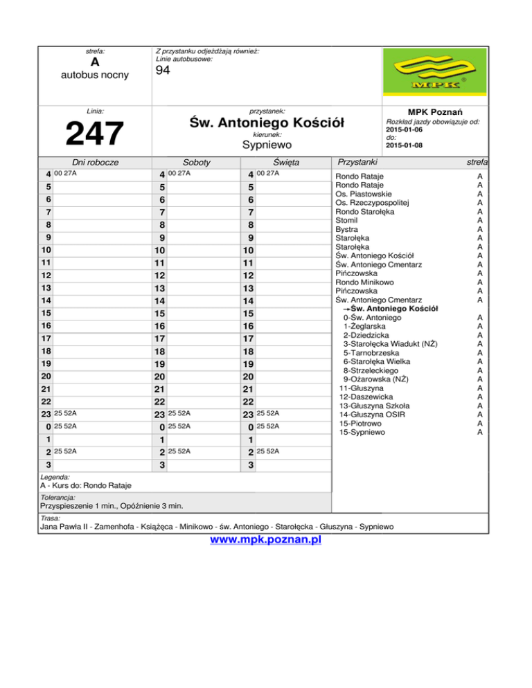 strefa: A autobus nocny Z przystanku odjeżdżają również: Linie autobusowe: 94 Linia: przystanek: 247 4 Dni robocze 00 27A 5 6 7 8 9 10 11 12 13 14 15 16 17 18 19 20 21 22 23 25 52A 0 25 52A 1 2 25 52A 3 Św. Antoniego Kościół kierunek: Sypniewo 4 5 6 7 8 9 10 11 12 13 14 15 16 17 18 19 20 21 22 23 0 1 2 3 Soboty 00 27A 25 52A 25 52A 25 52A 4 5 6 7 8 9 10 11 12 13 14 15 16 17 18 19 20 21 22 23 0 1 2 3 Święta 00 27A 25 52A 25 52A Przystanki Rondo Rataje Rondo Rataje Os. Piastowskie Os. Rzeczypospolitej Rondo Starołęka Stomil Bystra Starołęka Starołęka Św. Antoniego Kościół Św. Antoniego Cmentarz Pińczowska Rondo Minikowo Pińczowska Św. Antoniego Cmentarz →Św. Antoniego Kościół 0-Św. Antoniego 1-Żeglarska 2-Dziedzicka 3-Starołęcka Wiadukt (NŻ) 5-Tarnobrzeska 6-Starołęka Wielka 8-Strzeleckiego 9-Ożarowska (NŻ) 11-Głuszyna 12-Daszewicka 13-Głuszyna Szkoła 14-Głuszyna OSIR 15-Piotrowo 15-Sypniewo 25 52A Legenda: A - Kurs do: Rondo Rataje Tolerancja: Przyspieszenie 1 min., Opóźnienie 3 min. Trasa: Jana Pawła II - Zamenhofa - Książęca - Minikowo - św. Antoniego - Starołęcka - Głuszyna - Sypniewo www.mpk.poznan.pl MPK Poznań Rozkład jazdy obowiązuje od: 2015-01-06 do: 2015-01-08 strefa A A A A A A A A A A A A A A A A A A A A A A A A A A A A A