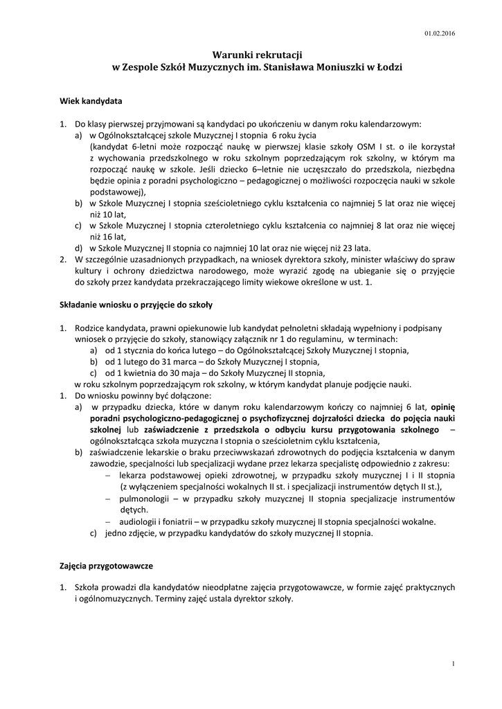 01.02.2016 Warunki rekrutacji w Zespole Szkół Muzycznych im. Stanisława Moniuszki w Łodzi Wiek kandydata 1. Do klasy pierwszej przyjmowani są kandydaci po ukończeniu w danym roku kalendarzowym: a) w Ogólnokształcącej szkole Muzycznej I stopnia 6 roku życia (kandydat 6-letni może rozpocząć naukę w pierwszej klasie szkoły OSM I st. o ile korzystał z wychowania przedszkolnego w roku szkolnym poprzedzającym rok szkolny, w którym ma rozpocząć naukę w szkole. Jeśli dziecko 6–letnie nie uczęszczało do przedszkola, niezbędna będzie opinia z poradni psychologiczno – pedagogicznej o możliwości rozpoczęcia nauki w szkole podstawowej), b) w Szkole Muzycznej I stopnia sześcioletniego cyklu kształcenia co najmniej 5 lat oraz nie więcej niż 10 lat, c) w Szkole Muzycznej I stopnia czteroletniego cyklu kształcenia co najmniej 8 lat oraz nie więcej niż 16 lat, d) w Szkole Muzycznej II stopnia co najmniej 10 lat oraz nie więcej niż 23 lata. 2. W szczególnie uzasadnionych przypadkach, na wniosek dyrektora szkoły, minister właściwy do spraw kultury i ochrony dziedzictwa narodowego, może wyrazić zgodę na ubieganie się o przyjęcie do szkoły przez kandydata przekraczającego limity wiekowe określone w ust. 1. Składanie wniosku o przyjęcie do szkoły 1. Rodzice kandydata, prawni opiekunowie lub kandydat pełnoletni składają wypełniony i podpisany wniosek o przyjęcie do szkoły, stanowiący załącznik nr 1 do regulaminu, w terminach: a) od 1 stycznia do końca lutego – do Ogólnokształcącej Szkoły Muzycznej I stopnia, b) od 1 lutego do 31 marca – do Szkoły Muzycznej I stopnia, c) od 1 kwietnia do 30 maja – do Szkoły Muzycznej II stopnia, w roku szkolnym poprzedzającym rok szkolny, w którym kandydat planuje podjęcie nauki. 1. Do wniosku powinny być dołączone: a) w przypadku dziecka, które w danym roku kalendarzowym kończy co najmniej 6 lat, opinię poradni psychologiczno-pedagogicznej o psychofizycznej dojrzałości dziecka do pojęcia nauki szkolnej lub zaświadczenie z przedszkola o odbyciu kursu przygotowania szkolnego – ogólnokształcąca szkoła muzyczna I stopnia o sześcioletnim cyklu kształcenia, b) zaświadczenie lekarskie o braku przeciwwskazań zdrowotnych do podjęcia kształcenia w danym zawodzie, specjalności lub specjalizacji wydane przez lekarza specjalistę odpowiednio z zakresu: lekarza podstawowej opieki zdrowotnej, w przypadku szkoły muzycznej I i II stopnia (z wyłączeniem specjalności wokalnych II st. i specjalizacji instrumentów dętych II st.), pulmonologii – w przypadku szkoły muzycznej II stopnia specjalizacje instrumentów dętych. audiologii i foniatrii – w przypadku szkoły muzycznej II stopnia specjalności wokalne. c) jedno zdjęcie, w przypadku kandydatów do szkoły muzycznej II stopnia. Zajęcia przygotowawcze 1. Szkoła prowadzi dla kandydatów nieodpłatne zajęcia przygotowawcze, w formie zajęć praktycznych i ogólnomuzycznych. Terminy zajęć ustala dyrektor szkoły. 1 01.02.2016 Badanie przydatności do kształcenia 1. Badanie przydatności w ogólnokształcącej szkole muzycznej I stopnia i szkole muzycznej I stopnia – polega na sprawdzeniu uzdolnień i predyspozycji do nauki gry na określonym instrumencie. Przykładowy wykaz ćwiczeń słuchowych zawarty jest w załączniku nr 2 do regulaminu. 2. Badanie predyspozycji do kształcenia muzycznego przeprowadzane jest w terminie: a) od 1 marca do zakończenia zajęć dydaktycznych dla kandydatów do Ogólnokształcącej Szkoły Muzycznej I stopnia, b) od 1 kwietnia do zakończenia zajęć dydaktycznych dla kandydatów do Szkoły Muzycznej I stopnia. 3. Terminy ustala dyrektor szkoły. 4. Terminy podawane są do publicznej wiadomości poprzez umieszczenie w widocznym miejscu w siedzibie szkoły, co najmniej na 30 dni przed terminem ich przeprowadzenia. Egzamin wstępny 1. Dla kandydatów do Szkoły Muzycznej II stopnia przeprowadza się egzamin wstępny. 2. Do klasy pierwszej Szkoły Muzycznej II stopnia wydziału instrumentalnego przyjmowani są uczniowie 3. 4. 5. 6. 7. 8. którzy ukończyli szkołę muzyczną I stopnia lub posiadają umiejętności odpowiadające SM I stopnia. Do klasy pierwszej Szkoły Muzycznej II stopnia wydziału wokalnego dopuszcza się możliwość przyjęcia kandydata bez wymogu ukończenia szkoły I stopnia w zakresie kształcenia muzycznego. Egzamin wstępny obejmuje: a) egzamin praktyczny z przygotowanych przez kandydata utworów, b) egzamin ogólnomuzyczny, ze szczególnym uwzględnieniem badania predyspozycji słuchowych: egzamin przeprowadzany jest w formie pisemnej. W szczególnych przypadkach możliwe jest rozszerzenie o egzamin ustny, egzamin dla kandydatów w specjalności wokalnej oraz dla osób niewidomych lub niedowidzących przeprowadzany jest w formie ustnej. Wykaz repertuaru i wymagań zawarty jest w załączniku nr 2 do regulaminu. Egzamin wstępny przeprowadzany jest w terminie od 1 czerwca do zakończenia zajęć dydaktycznych. Termin ustala dyrektor szkoły. Terminy podawane są do publicznej wiadomości poprzez umieszczenie w widocznym miejscu w siedzibie szkoły, co najmniej na 30 dni przed terminem ich przeprowadzenia. Rekrutacja do klas wyższych niż pierwsza 1. Dla kandydata ubiegającego się o przyjęcie do szkoły do klasy wyższej niż pierwsza oraz w przypadku 2. 3. 4. 1. 5. przechodzenia ucznia z innej szkoły muzycznej w trakcie roku szkolnego, przeprowadza się egzamin kwalifikacyjny. Egzamin kwalifikacyjny ma na celu sprawdzenie, czy predyspozycje i poziom umiejętności kandydata odpowiadają programowi klasy, do której kandydat ma być przyjęty. Warunkiem przeprowadzenia egzaminu kwalifikacyjnego jest posiadanie przez szkołę możliwości przyjęcia kandydata. Dyrektor szkoły ustala termin egzaminu kwalifikacyjnego. W skład komisji kwalifikacyjnej wchodzą: a) przewodniczący komisji, b) nauczyciele szkoły. Do zadań komisji kwalifikacyjnej należy w szczególnośc