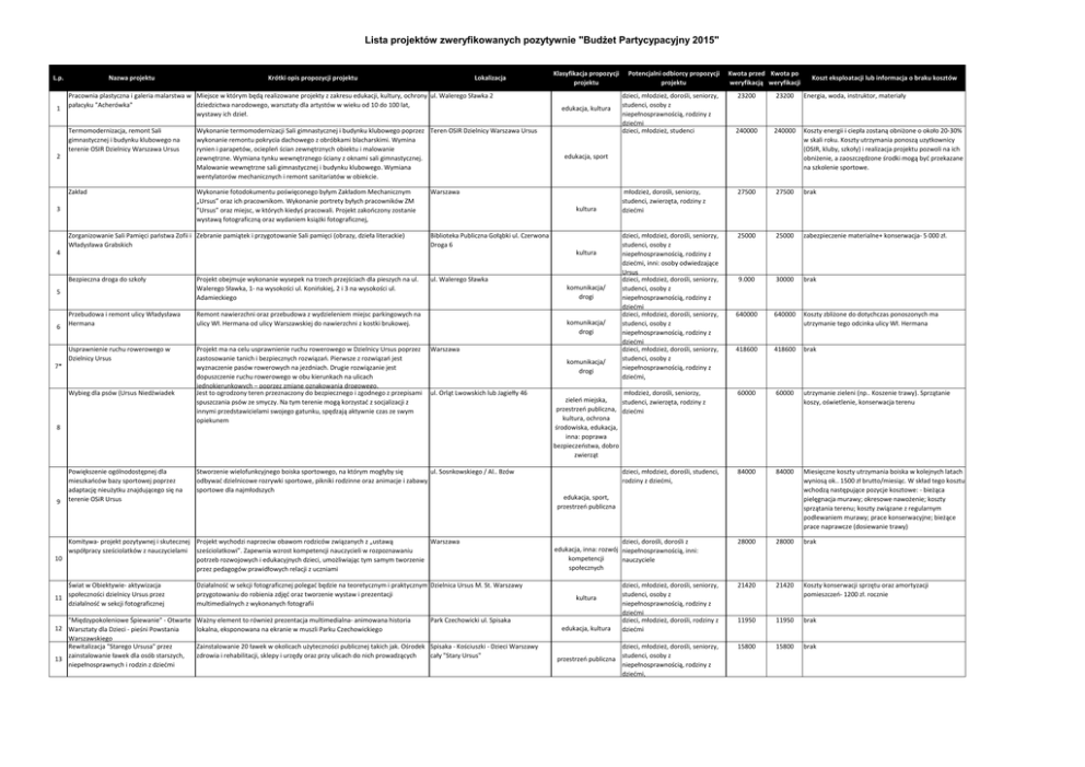 Lista projektów zweryfikowanych pozytywnie "Budżet Partycypacyjny 2015" L.p. 1 Nazwa projektu Krótki opis propozycji projektu Lokalizacja Pracownia plastyczna i galeria malarstwa w Miejsce w którym będą realizowane projekty z zakresu edukacji, kultury, ochrony ul. Walerego Sławka 2 pałacyku "Acherówka" dziedzictwa narodowego, warsztaty dla artystów w wieku od 10 do 100 lat, wystawy ich dzieł. Termomodernizacja, remont Sali gimnastycznej i budynku klubowego na terenie OSIR Dzielnicy Warszawa Ursus 2 Zakład 3 Wykonanie termomodernizacji Sali gimnastycznej i budynku klubowego poprzez Teren OSIR Dzielnicy Warszawa Ursus wykonanie remontu pokrycia dachowego z obróbkami blacharskimi. Wymina rynien i parapetów, ociepleń ścian zewnętrznych obiektu i malowanie zewnętrzne. Wymiana tynku wewnętrznego ściany z oknami sali gimnastycznej. Malowanie wewnętrzne sali gimnastycznej i budynku klubowego. Wymiana wentylatorów mechanicznych i remont sanitariatów w obiekcie. Wykonanie fotodokumentu poświęconego byłym Zakładom Mechanicznym „Ursus” oraz ich pracownikom. Wykonanie portrety byłych pracowników ZM ”Ursus” oraz miejsc, w których kiedyś pracowali. Projekt zakończony zostanie wystawą fotograficzną oraz wydaniem książki fotograficznej, Zorganizowanie Sali Pamięci państwa Zofii i Zebranie pamiątek i przygotowanie Sali pamięci (obrazy, dzieła literackie) Władysława Grabskich Bezpieczna droga do szkoły Projekt obejmuje wykonanie wysepek na trzech przejściach dla pieszych na ul. Walerego Sławka, 1- na wysokości ul. Konińskiej, 2 i 3 na wysokości ul. Adamieckiego Przebudowa i remont ulicy Władysława Hermana Remont nawierzchni oraz przebudowa z wydzieleniem miejsc parkingowych na ulicy Wł. Hermana od ulicy Warszawskiej do nawierzchni z kostki brukowej. Usprawnienie ruchu rowerowego w Dzielnicy Ursus Projekt ma na celu usprawnienie ruchu rowerowego w Dzielnicy Ursus poprzez zastosowanie tanich i bezpiecznych rozwiązań. Pierwsze z rozwiązań jest wyznaczenie pasów rowerowych na jezdniach. Drugie rozwiązanie jest dopuszczenie ruchu rowerowego w obu kierunkach na ulicach jednokierunkowych – poprzez zmianę oznakowania drogowego. Jest to ogrodzony teren przeznaczony do bezpiecznego i zgodnego z przepisami spuszczania psów ze smyczy. Na tym terenie mogą korzystać z socjalizacji z innymi przedstawicielami swojego gatunku, spędzają aktywnie czas ze swym opiekunem 7* Wybieg dla psów (Ursus Niedźwiadek kultura Biblioteka Publiczna Gołąbki ul. Czerwona Droga 6 ul. Walerego Sławka komunikacja/ drogi komunikacja/ drogi Warszawa komunikacja/ drogi ul. Orląt Lwowskich lub Jagiełły 46 8 Powiększenie ogólnodostępnej dla mieszkańców bazy sportowej poprzez adaptację nieużytku znajdującego się na terenie OSiR Ursus Świat w Obiektywie- aktywizacja społeczności dzielnicy Ursus przez działalność w sekcji fotograficznej "Międzypokoleniowe Śpiewanie" - Otwarte 12 Warsztaty dla Dzieci - pieśni Powstania Warszawskiego Rewitalizacja "Starego Ursusa" przez zainstalowanie ławek dla osób starszych, 13 niepełnosprawnych i rodzin z dziećmi dzieci, młodzież, dorośli, seniorzy, studenci, osoby z niepełnosprawnością, rodziny z dziećmi dzieci, młodzież, studenci Kwota przed Kwota po weryfikacją weryfikacji 23200 Energia, woda, instruktor, materiały 240000 240000 Koszty energii i ciepła zostaną obniżone o około 20-30% w skali roku. Koszty utrzymania ponoszą uzytkownicy (OSIR, kluby, szkoły) i realizacja projektu pozwoli na ich obniżenie, a zaoszczędzone środki mogą być przekazane na szkolenie sportowe. młodzież, dorośli, seniorzy, studenci, zwierzęta, rodziny z dziećmi 27500 27500 brak dzieci, młodzież, dorośli, seniorzy, studenci, osoby z niepełnosprawnością, rodziny z dziećmi, inni: osoby odwiedzające Ursus dzieci, młodzież, dorośli, seniorzy, studenci, osoby z niepełnosprawnością, rodziny z dziećmi dzieci, młodzież, dorośli, seniorzy, studenci, osoby z niepełnosprawnością, rodziny z dziećmi dzieci, młodzież, dorośli, seniorzy, studenci, osoby z niepełnosprawnością, rodziny z dziećmi, 25000 25000 zabezpieczenie materialne+ konserwacja- 5 000 zł. 9.000 30000 brak 640000 640000 Koszty zbliżone do dotychczas ponoszonych ma utrzymanie tego odcinka ulicy Wł. Hermana 418600 418600 brak 60000 60000 utrzymanie zieleni (np.. Koszenie trawy). Sprzątanie koszy, oświetlenie, konserwacja terenu 84000 84000 Miesięczne koszty utrzymania boiska w kolejnych latach wyniosą ok.. 1500 zł brutto/miesiąc. W skład tego kosztu wchodzą następujące pozycje kosztowe: - bieżąca pielęgnacja murawy; okresowe nawożenie; koszty sprzątania terenu; koszty związane z regularnym podlewaniem murawy; prace konserwacyjne; bieżące prace naprawcze (dosiewanie trawy) 28000 28000 brak dzieci, młodzież, dorośli, seniorzy, studenci, osoby z niepełnosprawnością, rodziny z dziećmi dzieci, młodzież, dorośli, rodziny z dziećmi 21420 21420 Koszty konserwacji sprzętu oraz amortyzacji pomieszczeń- 1200 zł. rocznie 11950 11950 brak dzieci, młodzież, dorośli, seniorzy, studenci, osoby z niepełnosprawnością, rodziny z dziećmi, 15800 15800 brak dzieci, młodzież, dorośli, studenci, rodziny z dziećmi, edukacja, sport, przestrzeń publiczna Działalność w sekcji fotograficznej polegać będzie na teoretycznym i praktycznym Dzielnica Ursus M. St. Warszawy przygotowaniu do robienia zdjęć oraz tworzenie wystaw i prezentacji multimedialnych z wykonanych fotografii Ważny element to również prezentacja multimedialna- animowana historia lokalna, eksponowana na ekranie w muszli Parku Czechowickiego dzieci, dorośli, dorośli z edukacja, inna: rozwój niepełnosprawnością, inni: kompetencji nauczyciele społecznych kultura Park Czechowicki ul. Spisaka Zainstalowanie 20 ławek w okolicach użyteczności publicznej takich jak. Ośrodek Spisaka - Kościuszki - Dzieci Warszawy zdrowia i rehabilitacji, skle