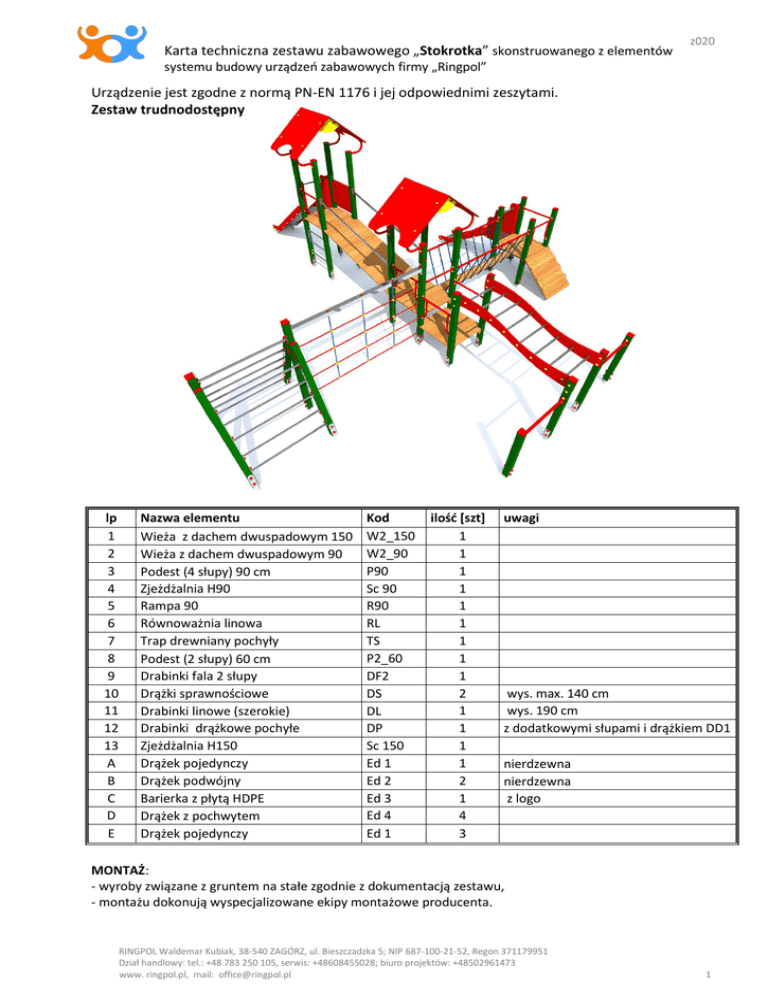 Karta techniczna zestawu zabawowego „Stokrotka” skonstruowanego z elementów z020 systemu budowy urządzeń zabawowych firmy „Ringpol” Urządzenie jest zgodne z normą PN-EN 1176 i jej odpowiednimi zeszytami. Zestaw trudnodostępny lp 1 2 3 4 5 6 7 8 9 10 11 12 13 A B C D E Nazwa elementu Wieża z dachem dwuspadowym 150 Wieża z dachem dwuspadowym 90 Podest (4 słupy) 90 cm Zjeżdżalnia H90 Rampa 90 Równoważnia linowa Trap drewniany pochyły Podest (2 słupy) 60 cm Drabinki fala 2 słupy Drążki sprawnościowe Drabinki linowe (szerokie) Drabinki drążkowe pochyłe Zjeżdżalnia H150 Drążek pojedynczy Drążek podwójny Barierka z płytą HDPE Drążek z pochwytem Drążek pojedynczy Kod W2_150 W2_90 P90 Sc 90 R90 RL TS P2_60 DF2 DS DL DP Sc 150 Ed 1 Ed 2 Ed 3 Ed 4 Ed 1 ilość [szt] 1 1 1 1 1 1 1 1 1 2 1 1 1 1 2 1 4 3 uwagi wys. max. 140 cm wys. 190 cm z dodatkowymi słupami i drążkiem DD1 nierdzewna nierdzewna z logo MONTAŻ: - wyroby związane z gruntem na stałe zgodnie z dokumentacją zestawu, - montażu dokonują wyspecjalizowane ekipy montażowe producenta. RINGPOL Waldemar Kubiak, 38-540 ZAGÓRZ, ul. Bieszczadzka 5; NIP 687-100-21-52, Regon 371179951 Dział handlowy: tel.: +48 783 250 105, serwis: +48608455028; biuro projektów: +48502961473 www. ringpol.pl, mail: [email protected] 1 Karta techniczna zestawu zabawowego „Stokrotka” skonstruowanego z elementów z020 systemu budowy urządzeń zabawowych firmy „Ringpol” MATRIAŁY: Drewno – iglaste klejone warstwowo o przekroju kwadratowym 90x90 mm impregnowane środkami zapobiegającymi gniciu i łatwopalności, w opcji pokryte mieszanką gumowo-poliuretanową (opcja wykończenia „FLEXICOAT”). Pozostałe elementy drewniane pokryte warstwą impregnatu typu DREWNOLIT. Elementy stalowe, ocynkowane (w opcji malowane); drabinki wykonane ze stali nierdzewnej. Ślizgi zjeżdżalni z blachy nierdzewnej. Daszki i osłony wykonane z płyty HDPE. Elementy linowe wykonane z liny Ø16 nylonowej z rdzeniem stalowym, montowane przy pomocy specjalnych zacisków. Posadowienie – stopy stalowe, ocynkowane zakotwione w gruncie przez zabetonowanie. DANE TECHNICZNE: - Grupa wiekowa do 13 lat - Gabaryty urządzenia 7,8 x 9,26 m - Strefa funkcjonowania 10,8 x 11,74 m - Wysokość maksymalna ~ 3,9 m - Wysokość podestów 0,6; 0,9; 1,5 m - Głębokość posadowienia -0,7 m - Wysokość swobodnego upadku ≤ 1,9 m Uwaga: należy unikać południowej ekspozycji zjeżdżalni metalowych. INSTRUKCJA UŻYTKOWANIA: Urządzenie przeznaczone jest do montażu na przestrzeni ogólnodostępnej. Zestaw zabawowy jest trudnodostępny dla wszystkich grup wiekowych Wiek użytkowników mogących korzystać samodzielnie z urządzenia powyżej 3 lat. Korzystanie z urządzenia powinno odbywać się pod nadzorem osoby dorosłej. Liczba dzieci mogących jednocześnie przebywać na urządzeniu nie powinna przekraczać 17. Urządzenie powinno być użytkowane zgodnie z przeznaczeniem. RINGPOL Waldemar Kubiak, 38-540 ZAGÓRZ, ul. Bieszczadzka 5; NIP 687-100-21-52, Regon 371179951 Dział handlowy: tel.: +48 783 250 105, serwis: +48608455028; biuro projektów: +48502961473 www. ringpol.pl, mail: [email protected] 2