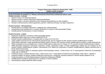 3 czerwca 2015 r. Program Operacyjny Inteligentny Rozwój 2014 - 2020 Kryteria wyboru projektów IV oś priorytetowa PO IR ZWIĘKSZENIE POTENCJAŁU NAUKOWO-BADAWCZEGO Kryteria formalne dla działania 4.2. Rozwój nowoczesnej infrastruktury badawczej sektora nauki Kryteria formalne - wniosek: Złożenie wniosku we właściwej instytucji; Złożenie wniosku w ramach właściwego działania/poddziałania; Złożenie wniosku w terminie wskazanym przez instytucję odpowiedzialną za nabór projektów; Wniosek o dofinansowanie został przygotowany zgodnie z właściwą instrukcją i wymogami regulaminu. Kryteria formalne - Wnioskodawca: Wnioskodawca nie podlega wykluczeniu z ubiegania się o dofinansowanie; Wnioskodawca jest zarejestrowany i prowadzi działalność na terytorium Rzeczypospolitej Polskiej; Kwalifikowalność Wnioskodawcy w ramach działania. Kryteria formalne - projekt: Projekt jest realizowany na terytorium Rzeczypospolitej Polskiej; Realizacja projektu mieści się w ramach czasowych PO IR; Wartość kosztów kwalifikowalnych w projekcie jest nie niższa niż 30 mln PLN; Część projektu przeznaczona do wykorzystania gospodarczego jest nie mniejsza niż 40% wartości kosztów kwalifikowalnych projektu; Udział wkładu własnego w części gospodarczej projektu stanowi minimum 50% wartości kosztów kwalifikowalnych projektu w części gospodarczej; Wkład przedsiębiorcy lub przedsiębiorców w koszty kwalifikowalne projektu jest nie mniejszy niż 10% wartości kosztów kwalifikowalnych projektu; Wkład jednostek naukowych, konsorcjów naukowych, uczelni, konsorcjów uczelni w koszty kwalifikowalne projektu jest nie mniejszy niż 5% wartości kosztów kwalifikowalnych projektu i jednocześnie 2,5% wkładu tych podmiotów w kosztach kwalifikowalnych projektu ponoszone jest w formie wkładu finansowego; Projekt ma pozytywny wpływ na realizację zasady zrównoważonego rozwoju, o której mowa w art. 8 rozporządzenia Parlamentu Europejskiego i Rady (UE) nr 1303/2013; Projekt jest zgodny z polityką równości szans, o której mowa w art. 7 rozporządzenia Parlamentu Europejskiego i Rady (UE) nr 1303/2013; Przedmiot projektu nie dotyczy rodzajów działalności wykluczonych z możliwości uzyskania wsparcia w ramach danego działania PO IR; Projekt jest wpisany na Polską Mapę Drogową Infrastruktury Badawczej (PMDIB); Kwalifikowalność wydatków zaplanowanych w projekcie w ramach działania; Wnioskodawca wykazał spełnienie efektu zachęty. 1 3 czerwca 2015 r. Kryteria merytoryczne dla działania 4.2. Rozwój nowoczesnej infrastruktury badawczej sektora nauki Kryteria merytoryczne (ocena TAK/NIE): Projekt obejmuje wsparcie dla infrastruktury badawczej; Projekt jest zgodny z celami POIR i opisem działania w Szczegółowym opisie osi priorytetowych POIR; Projekt służy realizacji agendy badawczej, która wpisuje się w Krajową Inteligentną Specjalizację; Zasadność planowanych wydatków w stosunku do przedmiotu i zakresu projektu; Harmonogram projektu umożliwia prawidłową i terminową realizację przedsięwzięcia; Potencjał Wnioskodawcy umożliwia realizację projektu zgodnie z przyjętymi celami i zasadami wsparcia; Infrastruktura B+R wsparta w ramach projektu nie powiela istniejących zasobów oraz uzupełnia wcześniej wytworzoną infrastrukturę badawczorozwojową; Wnioskodawca przedstawił realny plan dot. wykorzystania infrastruktury B+R w okresie co najmniej 5 lat po zakończeniu projektu; Wnioskodawca przedstawił realny plan pokrywania kosztów utrzymania infrastruktury z przychodów innych niż dotacja celowa lub dotacja podmiotowa z budżetu państwa; Powstała w wyniku projektu infrastruktura B+R będzie dostępna dla podmiotów spoza jednostki otrzymującej wsparcie; W projekcie zaplanowano finansowanie kosztów utrzymania i użytkowania przedmiotu inwestycji z udziałem środków własnych i środków pochodzących od przedsiębiorstw. Kryteria merytoryczne punktowane: Poziom współfinansowania projektu ze środków prywatnych, pochodzących z budżetów przedsiębiorców (skala od 0 do 5 pkt); Udział części gospodarczej w całkowitych kosztach kwalifikowalnych projektu (skala od 0 do 6 pkt); Ocena przedłożonej agendy badawczej (planowanych do realizacji projektów B+R) w stosunku do aktualnego stanu wiedzy i techniki (skala od 0 do 5 pkt); Ocena planu wykorzystania infrastruktury badawczej powstałej w ramach projektu (skala od 0 do 5 pkt); Współpraca w ramach konsorcjów naukowych lub naukowo-przemysłowych (skala od 0 do 5 pkt); Projekt ma charakter ponadregionalny (skala 0 lub 1 punkt). Maksymalna liczba punktów do zdobycia w ramach projektu – 27 pkt. Minimalna liczba punktów konieczna dla uzyskania dofinansowania wynosi 12 pkt. 2 3 czerwca 2015 r. Opis kryteriów wyboru projektów w ramach Priorytetu IV ZWIĘKSZENIE POTENCJAŁU NAUKOWO-BADAWCZEGO Działanie 4.2. Rozwój nowoczesnej infrastruktury badawczej sektora nauki KRYTERIA OCENY FORMALNEJ Lp. Nazwa kryterium Opis kryterium Ocena Kryteria formalne - wniosek: 1. 2. 3. 4. Złożenie wniosku we właściwej instytucji Złożenie wniosku w ramach właściwego działania/poddziałania Złożenie wniosku w terminie wskazanym przez instytucję odpowiedzialną za nabór projektów Wniosek o dofinansowanie został przygotowany zgodnie z właściwą instrukcją i wymogami regulaminu Kryteria formalne - Wnioskodawca: Wnioskodawca nie podlega wykluczeniu z ubiegania się o dofinansowanie 1. Wniosek o dofinansowanie został złożony w instytucji wskazanej w ogłoszeniu o konkursie. Wniosek złożono w ramach właściwego działania/poddziałania. Wniosek o dofinansowanie został złożony w terminie określonym przez Instytucję wskazaną w ogłoszeniu o konkursie. TAK/NIE TAK/NIE TAK/NIE Wniosek o dofinansowanie wraz z załącznikami jest kompletny i został złożony zgodnie ze wzorem określonym przez instytucję odpowiedzialną za ocenę projektu oraz wymogami zawartymi w Instrukcji wype