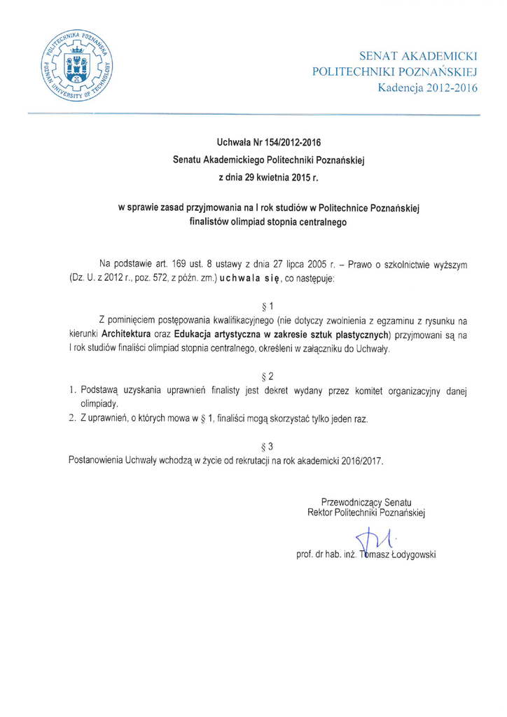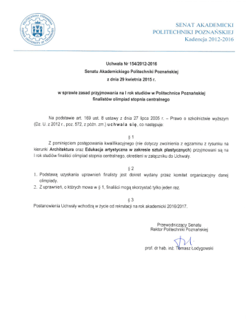 * rekrutacja Fizyka Techniczna Informatyka Inżynieria bezpieczeństwa Inżynieria biomedyczna Inżynieria chemiczna i procesowa Inżynieria materiałowa Inżynieria zarządzania Inżynieria środowiska Logistyka Lotnictwo i kosmonautyka* Matematyka/Matematyka stosowana* Mechanika i budowa maszyn Mechatronika Technologia chemiczna Technologie ochrony środowiska Teleinformatyka* Transport Zarządzanie i inżynieria produkcji 6. 7. 8. 9. 10. 11. 12. 13. 14. 15. 16. 17. 18. 19. 20. 21. 22. 23. 24. 25. 26. 27. F F F F F F F F F F F F F F F F F F F F F F F F F F F F F F F F F F F F F F F F F F F F F F F F F F F F F F F F F F F F F F F F F F F F F F F F F F F F F F F F F F F F F F F F F F F F F F F F F F F F F F F F F F F F F F F F F F F F F F F F F F F F F F F F F F F F F F F F F kandydatów odbędzie się w przypadku sfinalizowania procedury uruchomienia kierunku Legenda: F – finalista 5. F Energetyka 4. Elektrotechnika 3. Elektronika i telekomunikacja 2. Edukacja techniczno-informatyczna 1. F Edukacja artystyczna w zakresie sztuk plastycznych Olimpiada Artystyczna Olimpiada z Astronomii i Astrofizyki Olimpiada Biologiczna Olimpiada Chemiczna Olimpiada Elektryczna i Elektroniczna „Euroelektra” Olimpiada Fizyczna Olimpiada Geograficzna Ogólnopolska Olimpiada Historyczna Ogólnopolska Olimpiada Wiedzy Geodezyjnej i Kartograficznej Olimpiada Informatyczna Olimpiada Innowacji Technicznych i Wynalazczości Ogólnopolska Olimpiada Języka Angielskiego Olimpiada Języka Francuskiego Olimpiada Języka Hiszpańskiego Ogólnopolska Olimpiada Języka Niemieckiego Olimpiada Języka Rosyjskiego Olimpiada Literatury i Języka Polskiego Olimpiada Matematyczna Olimpiada Wiedzy Ekologicznej Olimpiada Wiedzy Ekonomicznej Ogólnopolska Olimpiada Wiedzy Elektrycznej i Elektronicznej Olimpiada Wiedzy Technicznej Olimpiada Techniki Samochodowej Olimpiada Wiedzy i Umiejętności Budowlanych Olimpiada Wiedza o Polsce i Świecie Współczesnym Ogólnopolska Olimpiada „Wiedzy o Prawie” Olimpiada Wiedzy o Państwie i Prawie Olimpiada Przedsiębiorczości Olimpiada z Wiedzy o Planowaniu i Zarządzaniu Karierą Zawodową Ogólnopolska Olimpiada Logistyczna Budownictwo 1. 2. 3. 4. 5. 6. 7. 8. 9. 10. 11. 12. 13. 14. 15. 16. 17. 18. 19. 20. 21. 22. 23. 24. 25. 26. 27. 28. 29. 30. Bioinformatyka Nazwa olimpiady Architektura Lp. Automatyka i robotyka Załącznik do Uchwały Nr 154/2012-2016 Senatu Akademickiego Politechniki Poznańskiej z dnia 29 kwietnia 2015 r. F F F F F F F F F F F F F F F F F F F F F F F F F F F F F F F F F F F F F F F F F F F F F F F F F F F F F F F F F F F F F F F F F F F F F F F F F F