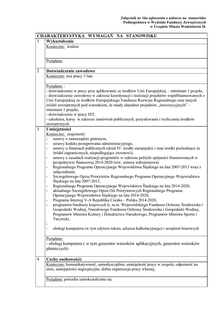 Załącznik nr 1do ogłoszenia o naborze na stanowisko Podinspektora w Wydziale Funduszy Zewnętrznych w Urzędzie Miasta Wodzisławia Śl. CHARAKTERYSTYKA WYMAGAŃ NA STANOWISKU 1 Wykształcenie Konieczne: średnie Pożądane: 2 Doświadczenie zawodowe Konieczne: staż pracy 3 lata Pożądane: : - doświadczenie w pracy przy aplikowaniu ze środków Unii Europejskiej – minimum 1 projekt, - doświadczenie zawodowe w zakresie koordynacji i realizacji projektów współfinansowanych z Unii Europejskiej ze środków Europejskiego Funduszu Rozwoju Regionalnego oraz innych źródeł zewnętrznych pod warunkiem, że miały charakter projektów „inwestycyjnych” – minimum 1 projekt, - doświadczenie w pracy JST, - szkolenia, kursy w zakresie zamówień publicznych, pozyskiwania i rozliczania środków zewnętrznych. 3 Umiejętności Konieczne: znajomość: - ustawy o samorządzie gminnym, - ustawy kodeks postępowania administracyjnego, - ustawy o finansach publicznych (dział IV: środki europejskie i inne środki pochodzące ze źródeł zagranicznych, niepodlegające zwrotowi), - ustawy o zasadach realizacji programów w zakresie polityki spójności finansowanych w perspektywie finansowej 2014-2020 (tzw. ustawa wdrożeniowa) - Regionalnego Programu Operacyjnego Województwa Śląskiego na lata 2007-2013 wraz z załącznikami, - Szczegółowego Opisu Priorytetów Regionalnego Programu Operacyjnego Województwa Śląskiego na lata 2007-2013, - Regionalnego Programu Operacyjnego Województwa Śląskiego na lata 2014-2020, - aktualnego Szczegółowego Opisu Osi Priorytetowych Regionalnego Programu Operacyjnego Województwa Śląskiego na lata 2014-2020, - Programu Interreg V-A Republika Czeska – Polska 2014-2020, - programów/funduszy krajowych tj. m.in. Wojewódzkiego Funduszu Ochrony Środowiska i Gospodarki Wodnej, Narodowego Funduszu Ochrony Środowiska i Gospodarki Wodnej, Programów Ministra Kultury i Dziedzictwa Narodowego, Programów Ministra Sportu i Turystyki, - obsługi komputera (w tym edytora tekstu, arkusza kalkulacyjnego) i urządzeń biurowych Pożądane: - obsługi komputera ( w tym generator wniosków aplikacyjnych, generator wniosków płatniczych) 4 Cechy osobowości: Konieczne: komunikatywność, samodyscyplina, umiejętność pracy w zespole, odporność na stres, umiejętności negocjacyjne, dobra organizacja pracy własnej, Pożądane: potrzeba samokształcenia się.