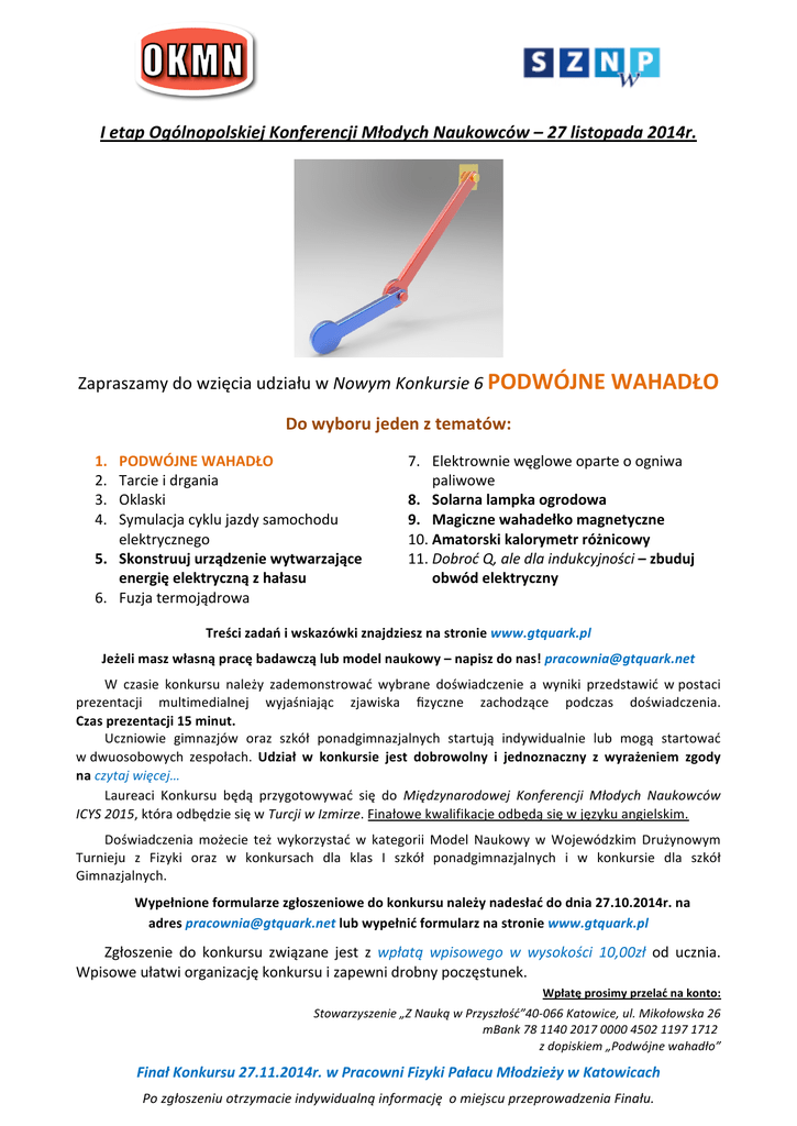 I etap Ogólnopolskiej Konferencji Młodych Naukowców – 27 listopada 2014r. Zapraszamy do wzięcia udziału w Nowym Konkursie 6 PODWÓJNE WAHADŁO Do wyboru jeden z tematów: 1. 2. 3. 4. PODWÓJNE WAHADŁO Tarcie i drgania Oklaski Symulacja cyklu jazdy samochodu elektrycznego 5. Skonstruuj urządzenie wytwarzające energię elektryczną z hałasu 6. Fuzja termojądrowa 7. Elektrownie węglowe oparte o ogniwa paliwowe 8. Solarna lampka ogrodowa 9. Magiczne wahadełko magnetyczne 10. Amatorski kalorymetr różnicowy 11. Dobroć Q, ale dla indukcyjności – zbuduj obwód elektryczny Treści zadań i wskazówki znajdziesz na stronie www.gtquark.pl Jeżeli masz własną pracę badawczą lub model naukowy – napisz do nas! [email protected] W czasie konkursu należy zademonstrować wybrane doświadczenie a wyniki przedstawić w postaci prezentacji multimedialnej wyjaśniając zjawiska fizyczne zachodzące podczas doświadczenia. Czas prezentacji 15 minut. Uczniowie gimnazjów oraz szkół ponadgimnazjalnych startują indywidualnie lub mogą startować w dwuosobowych zespołach. Udział w konkursie jest dobrowolny i jednoznaczny z wyrażeniem zgody na czytaj więcej… Laureaci Konkursu będą przygotowywać się do Międzynarodowej Konferencji Młodych Naukowców ICYS 2015, która odbędzie się w Turcji w Izmirze. Finałowe kwalifikacje odbędą się w języku angielskim. Doświadczenia możecie też wykorzystać w kategorii Model Naukowy w Wojewódzkim Drużynowym Turnieju z Fizyki oraz w konkursach dla klas I szkół ponadgimnazjalnych i w konkursie dla szkół Gimnazjalnych. Wypełnione formularze zgłoszeniowe do konkursu należy nadesłać do dnia 27.10.2014r. na adres [email protected] lub wypełnić formularz na stronie www.gtquark.pl Zgłoszenie do konkursu związane jest z wpłatą wpisowego w wysokości 10,00zł od ucznia. Wpisowe ułatwi organizację konkursu i zapewni drobny poczęstunek. Wpłatę prosimy przelać na konto: Stowarzyszenie „Z Nauką w Przyszłość”40-‐066 Katowice, ul. Mikołowska 26 mBank 78 1140 2017 0000 4502 1197 1712 z dopiskiem „Podwójne wahadło” Finał Konkursu 27.11.2014r. w Pracowni Fizyki Pałacu Młodzieży w Katowicach Po zgłoszeniu otrzymacie indywidualną informację o miejscu przeprowadzenia Finału.