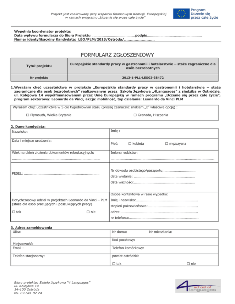Projekt jest realizowany przy wsparciu finansowym Komisji Europejskiej w ramach programu „Uczenie się przez całe życie” Wypełnia koordynator projektu: Data wpływu formularza do Biura Projektu ………………………………………podpis………………………………………………… Numer identyfikacyjny Kandydata: LEO/PLM/2013/Ostróda/…………………….. FORMULARZ ZGŁOSZENIOWY Tytuł projektu Europejskie standardy pracy w gastronomii i hotelarstwie – staże zagraniczne dla osób bezrobotnych Nr projektu 2013-1-PL1-LEO02-38472 1. Wyrażam chęć uczestnictwa w projekcie „Europejskie standardy pracy w gastronomii i hotelarstwie – staże zagraniczne dla osób bezrobotnych” realizowanym przez Szkołę Językową „4Languages” z siedzibą w Ostródzie, ul. Kolejowa 14 współfinansowanym przez Unię Europejską w ramach programu „Uczenie się przez całe życie”, program sektorowy: Leonardo da Vinci, akcja: mobilność, typ działania: Leonardo da Vinci PLM Wyrażam chęć uczestnictwa w 5-cio tygodniowym stażu (proszę zaznaczyć znakiem „x” właściwą opcję) : Plymouth, Wielka Brytania Granada, Hiszpania 2. Dane kandydata: Imię : Nazwisko: Data i miejsce urodzenia: Płeć: kobieta mężczyzna Wiek na dzień złożenia dokumentów rekrutacyjnych: Imiona rodziców: ………………………………………………………………………..…….. …………………………………………………………………………………………….. PESEL: …………………………………………………………………… Nr dowodu osobistego/paszportu;…………………………… data wydania: ……………………………………………………… data ważności:……………………………………………………… Osoba kontaktowa w razie wypadku: Dotychczasowy udział w projektach Leonardo da Vinci – PLM Imię i nazwisko:………………………………………………………. (staże dla osób pracujących i poszukujących pracy) stopień pokrewieństwa:……………………………………………. tak nie adres:…………………………………………………………………….. nr telefonu:……………………………………………………………… 3. Adres zameldowania Ulica: Miejscowość: Email : Telefon stacjonarny: Nr domu: Kod pocztowy: Telefon komórkowy: powiat ostródzki: tak Biuro projektu: Szkoła Językowa “4 Languages” ul. Kolejowa 14 14-100 Ostróda tel. 89 641 02 24 Nr mieszkania: nie Projekt jest realizowany przy wsparciu finansowym Komisji Europejskiej w ramach programu „Uczenie się przez całe życie” 4. Wykształcenie oraz doświadczenie Wykształcenie (proszę zaznaczyć znakiem „x” właściwą opcję) : brak podstawowe gimnazjalne ponadgimnazjalne (średnie lub zawodowe) pomaturalne wyższe (policealne) Zawód wyuczony: ………………………………………………………………………………………………………………………………………………………………………………….. Jestem absolwentem: tak nie Data ukończenia szkoły/uczelni: ………………………… Odbyte kursy i szkolenia z zakresu turystyki, hotelarstwa, gastronomii lub pokrewnych: ………………………………………………………………………………………………………………………………………………………………………………… ………………………………………………………………………………………………………………………………………………………………………………… ………………………………………………………………………………………………………………………………………………………………………………… ………………………………………………………………………………………………………………………………………………………………………………… ………………………………………………………………………………………………………………………………………………………………………………… ………………………………………………………………………………………………………………………………………………………………………………… ………………………………………………………………………………………………………………………………………………………………………………… ………………………………………………………………………………………………………………………………………………………………………………… ………………………………………………………………………………………………………………………………………………………………………………… ………………………………………………………………………………………………………………………………………………………………………………… ………………………………………………………………………………………………………………………………………………………………………………… ………………………………………………………………………………………………………………………………………………………………………………… Okres i miejsce zatrudnienia w obszarze turystyki, hotelarstwa, gastronomii lub pokrewnych ………………………………………………………………………………………………………………………………