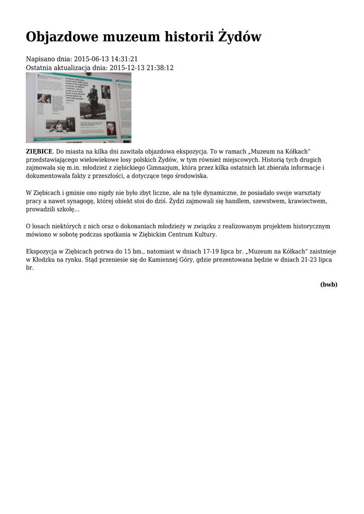 Objazdowe muzeum historii Żydów Napisano dnia: 2015-06-13 14:31:21 Ostatnia aktualizacja dnia: 2015-12-13 21:38:12 ZIĘBICE. Do miasta na kilka dni zawitała objazdowa ekspozycja. To w ramach „Muzeum na Kółkach” przedstawiającego wielowiekowe losy polskich Żydów, w tym również miejscowych. Historią tych drugich zajmowała się m.in. młodzież z ziębickiego Gimnazjum, która przez kilka ostatnich lat zbierała informacje i dokumentowała fakty z przeszłości, a dotyczące tego środowiska. W Ziębicach i gminie ono nigdy nie było zbyt liczne, ale na tyle dynamiczne, że posiadało swoje warsztaty pracy a nawet synagogę, której obiekt stoi do dziś. Żydzi zajmowali się handlem, szewstwem, krawiectwem, prowadzili szkołę… O losach niektórych z nich oraz o dokonaniach młodzieży w związku z realizowanym projektem historycznym mówiono w sobotę podczas spotkania w Ziębickim Centrum Kultury. Ekspozycja w Ziębicach potrwa do 15 bm., natomiast w dniach 17-19 lipca br. „Muzeum na Kółkach” zaistnieje w Kłodzku na rynku. Stąd przeniesie się do Kamiennej Góry, gdzie prezentowana będzie w dniach 21-23 lipca br. (bwb)