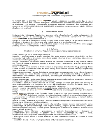 Regulamin organizacji świadczenia Usługi prawnej W ramach pomocy prawnej usługi świadczone są przez: Availo Sp. z o.o. z siedzibą w Jasionce 954, wpisaną do Rejestru Przedsiębiorców prowadzonego przez Sąd Rejonowy w Rzeszowie, XII Wydział Gospodarczy Krajowego Rejestru Sądowego pod numerem KRS 0000416198, REGON 180831218, NIP 8133671973, z kapitałem zakładowym w wysokości 8500,00 zł opłaconym w całości. § 1. Postanowienia ogólne Postanowienia niniejszego Regulaminu (zwanego dalej „Regulaminem”) mają zastosowanie do wszystkich umów o organizację świadczenia usług prawnych zawieranych w ramach z zastrzeżeniem ust. 2. Umowa o organizację świadczenia Usługi prawnej może zostać zawarta na warunkach innych niż określone w Regulaminie, o ile umowa taka została zawarta w formie pisemnej. W sprawach nieuregulowanych w Regulaminie zastosowanie mają powszechnie obowiązujące przepisy prawa – w szczególności kodeksu cywilnego. § 2. Definicje Określeniom użytym w Regulaminie nadaje się następujące znaczenia: Availo - Availo Sp. z o.o. z siedzibą w Jasionce Prawnik - współpracujący z Availo adwokat lub radca prawny wpisany odpowiednio na listę adwokatów lub radców prawnych prowadzoną przez właściwe organy samorządu zawodowego adwokatów i radców prawnych, Usługa - organizacja świadczenia Usługi prawnej na zasadach określonych w Regulaminie. Usługa nie obejmuje pokrycia kosztów sądowych, egzekucyjnych, notarialnych, kosztów postępowania administracyjnego, Klient - osoba, która zawarła z Availo umowę o organizację świadczenia Usługi prawnej. Przez Klienta rozumie się również osobę na rzecz której osoba trzecia zawarła umowę o organizację świadczenia Usługi prawnej, Usługa Abonamentowa - Usługa świadczona na podstawie umowy zawartej przez Klienta lub przez osobę trzecią na rzecz Klienta, której przedmiotem jest świadczenie Usługi w jednym z oferowanych abonamentów usług prawnych, zawierających określoną liczbę usług prawnych o określonym zakresie, Usługa Jednorazowa - pojedyncza Usługa świadczona poprzez połączenie ze wskazanym numerem telefonu lub z wykorzystaniem poczty elektronicznej, Call center - centrum odbioru zlecenia od Klienta, którego zadaniem jest przekazać sprawę do właściwego prawnika – w zależności od stopnia skomplikowania sprawy i życzenia Klienta. Call center to także system porozumiewania się prawników z Klientem, Cennik - rozumie się przez to Cennik wyszczególniający należne kwoty za usługi prawne, Strony - rozumie się przez to oraz Klienta zawierających Umowę o świadczenie Usługi, Usługa prawna - udzielane przez Prawnika Porady prawne lub inne usługi prawne określone przez , świadczone zgodnie z przepisami ustawy o radcach prawnych lub ustawy prawo o adwokaturze, w zakresie określonym w Regulaminie, których organizację, w ramach Usługi, zapewnia AVAILO, Porada prawna - wskazanie zgodnego z polskim prawem postępowania w przedstawionym przez Klienta stanie faktycznym (okolicznościach). Dokument - przez poradę prawną rozumie się ponadto, miedzy innymi: sporządzenie pisma procesowego lub przedprocesowego, albo projektu umowy, projektu pisma urzędowego, analiza dokumentów oraz inne usługi prawne zgodne z katalogiem określonym w ustawach o adwokaturze oraz o radcach prawnych, Indywidualne Konto Klienckie - prowadzone w systemie informatycznym i dostępne za pośrednictwem sieci Internet, po podaniu przez Klienta przyznanego mu loginu i hasła, indywidualne konto przypisane do każdego Klienta, służące w szczególności do: - korzystania przez Klienta z Usługi Prawnej, w tym zapisywania historii korzystania z Usług prawnych, - kontaktów Klienta i Availo, w tym przesyłania faktur i składania reklamacji. POSTANOWIENIA WSPÓLNE DLA WSZYSTKICH TYPÓW USŁUG § 3. Zakres Usługi Usługa obejmuje zorganizowanie i zapewnienie Usługi prawnej świadczonej przez współpracujących z Availo Prawników. W zakres Usługi wchodzi: zapewnienie Usługi prawnej świadczonej przez współpracujących z AVAILO Prawników, zapewnienie infrastruktury umożliwiającej kontakt z Prawnikiem (linia telefoniczna, strona internetowa umożliwiająca utworzenie Indywidualnego Konta Klienckiego), pokrycie i rozliczenie kosztów porady prawnej świadczonej przez Prawnika, skoordynowanie udzielenia porady prawnej przez Prawnika. Availo zarządza świadczeniem i organizacją Usługi. § 4. Sposób świadczenia Usługi prawnej W zależności od wariantu Usługi, Availo organizuje świadczenie Usługi prawnej przez Prawnika w następujący sposób: udzielenie porady prawnej telefonicznej, zaopiniowanie, sporządzenie projektu pisma procesowego lub przedprocesowego, urzędowego, analiza dokumentów sporządzenie opinii prawnej/wzoru umowy, projektu umowy i przesłanie jej w formie elektronicznej lub faksem na wskazany przez Klienta odpowiednio adres e-mail lub numer faksu, reprezentacja przed sądami i organami administracji - na zasadach ustalonych indywidualnie do danej sprawy. § 5. Termin świadczenia Usługi prawnej W zależności od zakresu Usługi, Usługa prawna świadczona jest: w przypadku porady telefonicznej – niezwłocznie po rozpoczęciu rozmowy telefonicznej między Klientem a Prawnikiem, w czasie trwania rozmowy telefonicznej, w przypadku sporządzenia projektu pisma procesowego lub przedprocesowego, projektu umowy opinii prawnej/projektu umowy i przesłania jej w formie elektronicznej lub faksem na wskazany przez Klienta odpowiednio adres e-mail lub numer faksu – niezwłocznie po rozwiązaniu problemu przez Prawnika. W przypadku konieczności uzupełnienia przez Klienta opisu sprawy, w szczególności przesłania dokumentów niezbędnych do świadczenia pomocy prawnej, ulega zawieszeniu do momentu otrzymania przez Prawnika odpowiedniego uzupełnienia opisu sprawy/dokumentów. § 6. Języki Availo zapewnia organizację Usługi prawnej w języku pols
