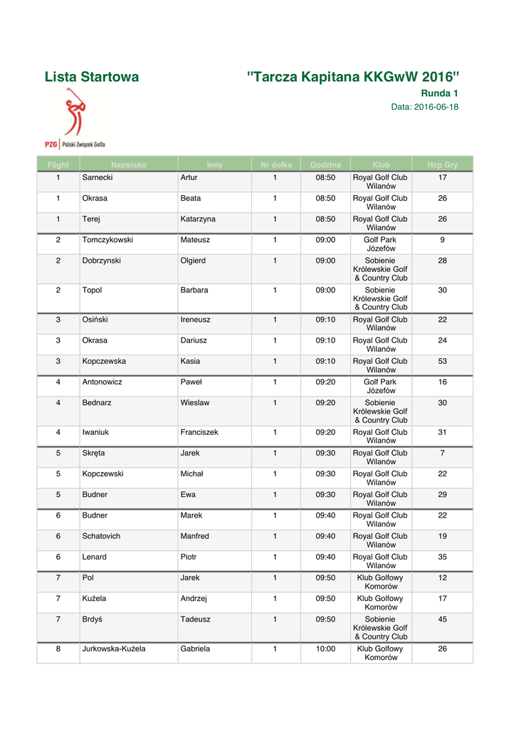 Lista Startowa ''Tarcza Kapitana KKGwW 2016'' Runda 1 Data: 2016-06-18 Nr dołka Godzina Klub Hcp Gry 1 Sarnecki Artur 1 08:50 Royal Golf Club Wilanów 17 1 Okrasa Beata 1 08:50 Royal Golf Club Wilanów 26 1 Terej Katarzyna 1 08:50 Royal Golf Club Wilanów 26 2 Tomczykowski Mateusz 1 09:00 Golf Park Józefów 9 2 Dobrzynski Olgierd 1 09:00 Sobienie Królewskie Golf & Country Club 28 2 Topol Barbara 1 09:00 Sobienie Królewskie Golf & Country Club 30 3 Osiński Ireneusz 1 09:10 Royal Golf Club Wilanów 22 3 Okrasa Dariusz 1 09:10 Royal Golf Club Wilanów 24 3 Kopczewska Kasia 1 09:10 Royal Golf Club Wilanów 53 4 Antonowicz Paweł 1 09:20 Golf Park Józefów 16 4 Bednarz Wieslaw 1 09:20 Sobienie Królewskie Golf & Country Club 30 4 Iwaniuk Franciszek 1 09:20 Royal Golf Club Wilanów 31 5 Skręta Jarek 1 09:30 Royal Golf Club Wilanów 7 5 Kopczewski Michał 1 09:30 Royal Golf Club Wilanów 22 5 Budner Ewa 1 09:30 Royal Golf Club Wilanów 29 6 Budner Marek 1 09:40 Royal Golf Club Wilanów 22 6 Schatovich Manfred 1 09:40 Royal Golf Club Wilanów 19 6 Lenard Piotr 1 09:40 Royal Golf Club Wilanów 35 7 Pol Jarek 1 09:50 Klub Golfowy Komorów 12 7 Kużela Andrzej 1 09:50 Klub Golfowy Komorów 17 7 Brdyś Tadeusz 1 09:50 Sobienie Królewskie Golf & Country Club 45 8 Jurkowska-Kużela Gabriela 1 10:00 Klub Golfowy Komorów 26 Flight Imię Nazwisko Nr dołka Godzina Klub Hcp Gry 8 Gregotowicz Agnieszka 1 10:00 Royal Golf Club Wilanów 38 8 Stańczak Monika 1 10:00 Royal Golf Club Wilanów 25 9 Zabłocka Anna 1 10:10 Klub Golfowy Lisia Polana 21 9 Kuna Marcin 1 10:10 Royal Golf Club Wilanów 33 9 Kuna Matylda 1 10:10 Royal Golf Club Wilanów 38 10 Podkański Rafał 1 10:20 Royal Golf Club Wilanów 14 10 Depiński Marcin 1 10:20 Royal Golf Club Wilanów 21 10 Górko Adam 1 10:20 Klub Golfowy Lisia Polana 29 11 Olesiński Waldemar 1 10:30 Klub Golfowy Lisia Polana 17 11 Radziszewski Jan 1 10:30 Royal Golf Club Wilanów 24 11 Szczypa Grzegorz 1 10:30 Royal Golf Club Wilanów 34 12 Świerczyński Robert 1 10:40 Klub Golfowy Lisia Polana 11 12 Borowski Krzysztof 1 10:40 Klub Golfowy Lisia Polana 26 12 Knapik Dariusz 1 10:40 First Warsaw Golf & Country Club 29 13 Jakubowski Przemysław 1 10:50 Modry Las Golf Club 12 13 Tyszka Paweł 1 10:50 Play Golf Club 17 13 Błędziński Piotr 1 10:50 Sobienie Królewskie Golf & Country Club 36 14 du Château Piotr 1 11:00 Royal Golf Club Wilanów 20 14 Mach Gunther 1 11:00 Royal Golf Club Wilanów 19 14 Mizieliński Bogdan 1 11:00 Royal Golf Club Wilanów 27 15 Markitan Andrey 1 11:10 Royal Golf Club Wilanów -1 15 Mazurkiewicz Piotr 1 11:10 Royal Golf Club Wilanów 19 15 Leonardi Grzegorz 1 11:10 Olympic Golf Club 21 16 Markitan Gregori 1 11:20 Royal Golf Club Wilanów -5 16 Kondej Jerzy 1 11:20 Royal Golf Club Wilanów 24 16 Jankowski Krzysztof 1 11:20 Royal Golf Club Wilanów 25 17 Firych Przemysław 1 11:30 Royal Golf Club Wilanów 26 Flight Imię Nazwisko Nr dołka Godzina Klub Hcp Gry 17 Zmarzliński Robert 1 11:30 Sobienie Królewskie Golf & Country Club 20 17 Hofman Piotr 1 11:30 Royal Golf Club Wilanów 26 18 Chorąży Dariusz 1 11:40 Royal Golf Club Wilanów 17 18 Tłuściak Anna 1 11:40 Sobienie Królewskie Golf & Country Club 22 18 Szadkowski Józef 1 11:40 Klub Golfowy Lisia Polana 24 Flight Imię Nazwisko