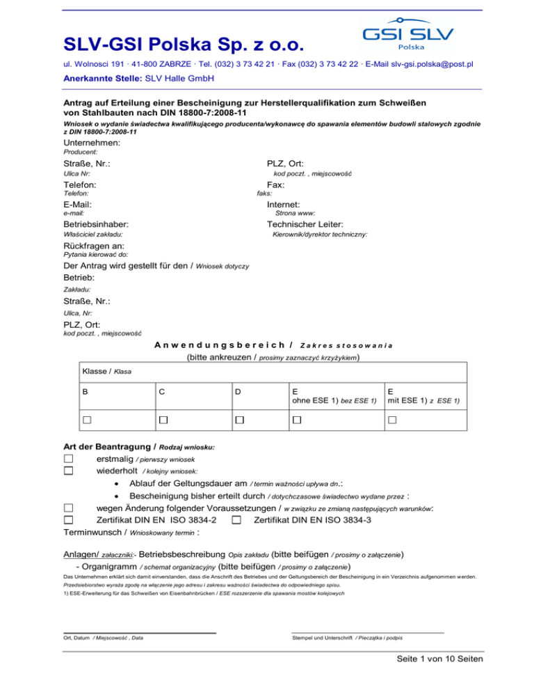 SLV-GSI Polska Sp. z o.o. ul. Wolnosci 191 41-800 ZABRZE Tel. (032) 3 73 42 21 Fax (032) 3 73 42 22 E-Mail [email protected] Anerkannte Stelle: SLV Halle GmbH Antrag auf Erteilung einer Bescheinigung zur Herstellerqualifikation zum Schweißen von Stahlbauten nach DIN 18800-7:2008-11 Wniosek o wydanie świadectwa kwalifikującego producenta/wykonawcę do spawania elementów budowli stalowych zgodnie z DIN 18800-7:2008-11 Unternehmen: Producent: Straße, Nr.: PLZ, Ort: Ulica Nr: kod poczt. , miejscowość Telefon: Fax: Telefon: faks: E-Mail: Internet: e-mail: Strona www: Betriebsinhaber: Technischer Leiter: Właściciel zakładu: Kierownik/dyrektor techniczny: Rückfragen an: Pytania kierować do: Der Antrag wird gestellt für den / Wniosek dotyczy Betrieb: Zakładu: Straße, Nr.: Ulica, Nr: PLZ, Ort: kod poczt. , miejscowość An w e n d u n g s b e r e i c h / Zakres stosowania (bitte ankreuzen / prosimy zaznaczyć krzyżykiem) Klasse / Klasa B C D E ohne ESE 1) bez ESE 1) E mit ESE 1) z ESE 1) Art der Beantragung / Rodzaj wniosku: erstmalig / pierwszy wniosek wiederholt / kolejny wniosek: Ablauf der Geltungsdauer am / termin ważności upływa dn.: Bescheinigung bisher erteilt durch / dotychczasowe świadectwo wydane przez : wegen Änderung folgender Voraussetzungen / w związku ze zmianą następujących warunków: Zertifikat DIN EN ISO 3834-2 Zertifikat DIN EN ISO 3834-3 Terminwunsch / Wnioskowany termin : Anlagen/ załaczniki:- Betriebsbeschreibung Opis zakładu (bitte beifügen / prosimy o załączenie) - Organigramm / schemat organizacyjny (bitte beifügen / prosimy o załączenie) Das Unternehmen erklärt sich damit einverstanden, dass die Anschrift des Betriebes und der Geltungsbereich der Bescheinigung in ein Verzeichnis aufgenommen werden. Przedsiebiorstwo wyraża zgodę na włączenie jego adresu i zakresu ważności świadectwa do odpowiedniego spisu. 1) ESE-Erweiterung für das Schweißen von Eisenbahnbrücken / ESE rozszerzenie dla spawania mostów kolejowych Ort, Datum / Miejscowość , Data Stempel und Unterschrift / Pieczątka i podpis Seite 1 von 10 Seiten Angaben des Antragstellers / Dane wnioskodawcy Angaben der anerkannten Stelle (bitte nicht ausfüllen) Dane dopuszczonej placówki badawczej (prosimy nie wypełniać) 1 1.1 1.1.1 Anwendungsbereich / Zakres stosowania Umfang der Schweißarbeiten / Zakres prac spawalniczych anzuwendende Normen und Regelwerke / Stosowane normy i uregulowania: DIN 4112, Fliegende Bauten (statisch) / Budowle przenośne (ob- ciążenie statyczne) DIN 4112, Fliegende Bauten (dynamisch) / Budowle przenośne (obciążenie dynamiczne) DIN 4119, Tankbauwerke / Budowle zbiornikowe DIN 4131, Antennentragwerke (statisch) / Konstrukcje antenowe (obciążenie statyczne) DIN 4131, Antennentragwerke (dynamisch) / Konstrukcje antenowe (obciążenie dynamiczne) DIN 4132, Kranbahnen, Stahltragwerke / Tory suwnic, stalowe ustroje nośne DIN 4133, Stahlschornsteine (statisch) / Kominy stalowe (obciążenia satyczne) DIN 4133, Stahlschornsteine (dynamisch) / Kominy stalowe (obcią- żenia dynamiczne) DIN 4420, Arbeits- und Schutzgerüste / Rusztowania robocze i ochronne DIN 4421, Traggerüste / Rusztowania nośne DIN 15018, Krane / Suwnice DIN 18801, Stahlhochbau / Konstrukcje stalowe wysokościowe DIN 18808, Hohlprofiltragwerke / Ustroje nośne z profili zamkniętych DIN 18809, Straßenbrücken / Mosty drogowe DIN 19704, Stahlwasserbau / Konstrukcje stalowe w budownictwie wodnym DIN 22261, Bagger, Absetzer und Zusatzgeräte / Koparki, zwałowarki i urządzenia dodatkowe DIN 24117, Verteilermaste / Maszty rozdzielcze Ril 804, Eisenbahnbrücken (ESE) / Mosty kolejowe andere Bauwerke (unter 1.1.2 erläutern) / inne dziedziny zastosowania ( poniżej 1.1.2 objaśnienie) Erläuterungen / Objaśnienia: 1.2 Schweißprozesse / Procesy spawalnicze (Prozess-Nr. nach DIN EN ISO 4063 / Nr procesu wg DIN EN ISO 4063) 1.3 Grundwerkstoffe; minimale/maximale Dicke / Materiały rodzime; grubości minimalne/maksymalne (z. B. DIN EN 10025-S235JRG2, Dicke 4-20 mm / np. DIN EN 10025-S235JRG2, grubość 4-20 mm) Seite/Strona 2 von/z 10 Seiten/Stron Angaben des Antragstellers / Dane wnioskodawcy Angaben der anerkannten Stelle (bitte nicht ausfüllen) Dane dopuszczonej placówki badawczej (prosimy nie wypełniać) 1.4 Schweißzusätze und –hilfsstoffe mit Bezeichnung nach Norm und/oder Handelsname / Materiały dodatkowe i pomocnicze do spawania z określeniem wg normy i/lub nazwą handlową (z. B. DIN EN ISO 2560 : E 42 4 B / np. DIN EN ISO 2560: E 42 4 B) 1.5 Besonderheiten/Serienfertigung / Cechy szczególne / Produkcja seryjna Serienfertigung / Produkcja seryjna : Ja/ Tak Nein/ Nie Bei „Ja“ Erläuterungen / W przypadku „tak“ wyjaśnienia: Seite/Strona 3 von/z 10 Seiten/Stron Angaben des Antragstellers / Dane wnioskodawcy Angaben der anerkannten Stelle (bitte nicht ausfüllen) Dane dopuszczonej placówki badawczej (prosimy nie wypełniać) 2 2.1 Personal / Personel Anzahl der Mitarbeiter im technischen Büro / Liczba pracowników w biurze technicznym: 2.2 Anzahl der Mitarbeiter in Werkstatt und Montage / Liczba pracowników w warsztacie i na montażu: 2.3 2.3.1 Schweißtechnisches Personal, das dem Betrieb ständig angehört / Personel spawalniczy, zatrudniony na stałe w zakładzie: Verantwortliche Schweißaufsichtsperson(en) 1) 2) / Odpowiedzialna(-e) osoba(-y) nadzoru spawalniczego Name, Vorname / Nazwisko, imię: geboren am / data urodzenia: Verantwortungsbereich / zakres odpowiedzialności: 2.3.1.1 Berufsausbildung / Wykształcenie zawodowe 3) Werksmeister seit / mistrz zakładowy od : Meister, Prüfung am / mistrz egzamin od : Techniker, Prüfung am / technik egzamin od : Ing., seit / inżynier od: Ing. (grad), Prüfung am / magister inżynier, egzamin dn: Dipl.-Ing., Prüfung am / inżynier dyplomowany, egzamin dn: 2.3.1.2 Schweißtechnische Ausbildung / Wykształcenie techniczne w zakresie spawalnictwa 2) Lehrschweißer, Prüfung am / Instruktor spawania, egzami