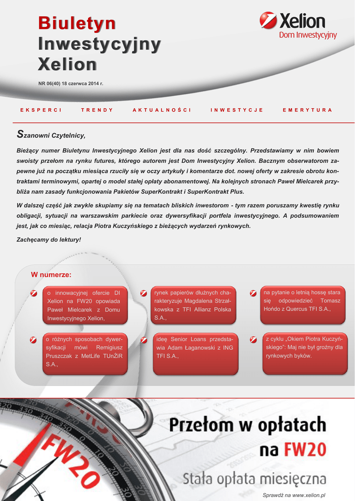 Biuletyn Inwestycyjny Xelion NR 06(40) 18 czerwca 2014 r. E K S P E R C I T R E N D Y A K T U A L N O Ś C I I N W E S T Y C J E E M E R Y T U R A Szanowni Czytelnicy, Bieżący numer Biuletynu Inwestycyjnego Xelion jest dla nas dość szczególny. Przedstawiamy w nim bowiem swoisty przełom na rynku futures, którego autorem jest Dom Inwestycyjny Xelion. Bacznym obserwatorom zapewne już na początku miesiąca rzuciły się w oczy artykuły i komentarze dot. nowej oferty w zakresie obrotu kontraktami terminowymi, opartej o model stałej opłaty abonamentowej. Na kolejnych stronach Paweł Mielcarek przybliża nam zasady funkcjonowania Pakietów SuperKontrakt i SuperKontrakt Plus. W dalszej część jak zwykle skupiamy się na tematach bliskich inwestorom - tym razem poruszamy kwestię rynku obligacji, sytuacji na warszawskim parkiecie oraz dywersyfikacji portfela inwestycyjnego. A podsumowaniem jest, jak co miesiąc, relacja Piotra Kuczyńskiego z bieżących wydarzeń rynkowych. Zachęcamy do lektury! W numerze: o innowacyjnej ofercie DI Xelion na FW20 opowiada rynek papierów dłużnych charakteryzuje Magdalena Strzał- na pytanie o letnią hossę stara się odpowiedzieć Tomasz Paweł Mielcarek z Domu Inwestycyjnego Xelion, kowska z TFI Allianz Polska S.A., Hońdo z Quercus TFI S.A., o różnych sposobach dywersyfikacji mówi Remigiusz ideę Senior Loans przedstawia Adam Łaganowski z ING z cyklu „Okiem Piotra Kuczyńskiego”: Maj nie był groźny dla Pruszczak z MetLife TUnŻiR S.A., TFI S.A., rynkowych byków. Sprawdź na www.xelion.pl Biuletyn Inwestycyjny Xelion Prawdziwy przełom Rynek kapitałowy w Polsce nie należy już do najmłodszych, a przez sporą część inwestorów traktowany jest już jako miejsce pośrednie między rynkami rozwiniętymi, a rozwijającymi się. Wraz z dynamicznym rozwojem warszawskiej giełdy, istotnie zmieniał się też rynek brokerów, którzy poprzez prowadzenie rachunków papierów wartościowych zapewniają dostęp do GPW. Wraz za rozwojem rynku nie specjalnie zmieniała się jednak oferta - bez wątpienia można traktować jako skostniałą, do której wszyscy gracze chcąc nie chcąc się przyzwyczaili. Niezwykle miło jest nam zatem poinfor- ważne jest opłatom ponoszonym przez DI Xelion na rzecz GPW i KDPW. Nowa usługa dostępna jest w dwóch wariantach: SuperKontr@kt oraz SuperKontr@kt Plus. Pierwszy pakiet daje możliwość nieograniczonego obrotu kontraktami terminowymi na indeks za pośrednictwem Internetu za stałą miesięczną opłatę abonamentową w wysokości 299 zł powiększaną o jednostkowe koszty GPW/KDPW w wysokości 3 zł za kontrakt. Jedynym ograniczeniem jest liczba jednocześnie otwartych pozycji, która wynosi 50 szt. Drugi pakiet, czyli SuperKontr@kt Plus, kosztuje 799 zł miesięcznie i również oferuje obrót kontraktami terminowymi na indeks za jedyne 3 zł za kontrakt, przy czym maksymalna liczba otwartych pozycji wynosi 100 szt. lub więcej (ustalana indywidualnie). Jak nowe podejście do opłat sprawdza się w praktyce? Najlepiej koncepcję przedstawić na przykładzie. Załóżmy, że mamy 3 inwestorów, z których każdy wykonuje miesięczny obrót kontraktami w ilości odpowiednio 200 szt., 500 szt. Wykres nr 1: Szacunkowa miesięczna wysokość prowizji dla domu maklerskiego za obrót kontraktami terminowymi na indeks. mować, że Dom Inwestycyjny Xelion jest autorem prawdziwie innowacyjnej oferty – drugiej takiej na całym rodzimym rynku kapitałowym próżno szukać. Owa zmiana dotyczy rynku kontraktów terminowych, czyli obszaru, który dotychczas nie był traktowany priorytetowo przez domy maklerskie. Tytułowy przełom polega na wprowadzeniu do oferty DI Xelion nowego modelu opłat za obrót kontraktami terminowymi na indeks. Standardem rynkowym jest pobieranie prowizji od każdej transakcji w kwocie c.a. od 5 do 9 zł za kontrakt (w zależności od domu maklerskiego). Wobec tego zauważalna jest prawidłowość: im wyższy wykonywany obrót, tym wyższa łączna opłata prowizyjna. Nowy model DI Xelion zakłada, że po opłaceniu stałej miesięcznej opłaty abonamentowej Klient będzie mógł dokonywać za pośrednictwem Internetu nielimitowanego obrotu kontraktami terminowymi na in- Źródło: Opracowanie własne. * Założenia: (1) Prowizja za obrót kontraktami terminowymi w innym domu maklerskim: 6 zł/kontrakt. (2) W DI Xelion: Pakiet SuperKontrakt. Wykres nr 2: Szacunkowa roczna wysokość prowizji dla domu maklerskiego za obrót kontraktami terminowymi na indeks. deks na swoim rachunku maklerskim, płacąc dodatkowo jedynie koszty transakcyjne ponoszone przez dom maklerski na rzecz Giełdy Papierów Wartościowych w Warszawie oraz Krajowego Depozytu Papierów Wartościowych. Mówiąc krótko, po opłaceniu stałej miesięcznej opłaty abonamentowej, inwestor uzyskuje dostęp do prowizji na poziomie 3 zł za kontrakt, co równo- Źródło: Opracowanie własne. * Założenia: (1) Prowizja za obrót kontraktami terminowymi w innym domu maklerskim: 6 zł/kontrakt. (2) W DI Xelion: Pakiet SuperKontrakt. 2 Biuletyn Inwestycyjny Xelion Wykres nr 1: Szacunkowa miesięczna i roczna oszczędność na prowizji dla domu maklerskiego za obrót kontraktami terminowymi na indeks. obrót każdego miesiąca, roczna oszczędność równa się niemal wartości nowego samochodu. Co należy zatem zrobić, aby skorzystać z pakietów SuperKontr@kt lub SuperKontr@kt Plus? Pierwszym krokiem dla nowych inwestorów jest oczywiście standardowe otwarcie rachunku maklerskiego, którego można dokonać osobiście w jednym z Punktów Obsługi Klienta, za pośrednictwem Doradcy Finansowego Xelion oraz oczywiście samodzielnie poprzez wniosek internetowy (LINK). Po Źródło: Opracowanie własne. * Założenia: (1) Prowizja za obrót kontraktami terminowymi w innym domu maklerskim: 6 zł/kontrakt. (2) W DI Xelion: Pakiet SuperKontrakt. oraz 1000 szt. Przyjmijmy, że każdy z nich płaci taką samą prowizję na poziomie