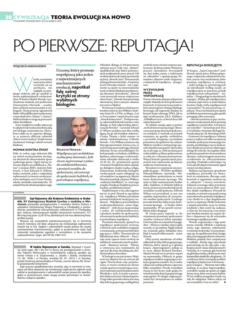 30 CYWILIZACJA TEORIA EWOLUCJI NA NOWO TYGODNIK POWSZECHNY 12 | 24 MARCA 2013 PO PIERWSZE: REPUTACJA! WOJCIECH MIKOŁUSZKO NOWAK KONTRA ŚWIAT Fakt, że wobec jego dokonań tliła się wśród ewolucjonistów niechęć, nie docierał do obserwatorów spoza naukowego grona. Ogień stał się widoczny dopiero po publikacji w „Nature” z sierpnia 2010 r. Autorów było trzech, w tym Edward O. Wilson, badacz mrówek, jeden z najbardziej wpływowych na świecie ewolucjonistów i ekologów, oraz Corina Tarnita, młoda rumuńska matematyczka. To jednak Nowak zebrał największe cięgi. falę ostrej krytyki ze strony wybitnych biologów. ARCHIWUM PRYWATNE W ysoki, roześmiany mężczyzna, który wychodzi mi na spotkanie, nie wygląda na przejętego atakiem, jaki go spotkał ze strony najsłynniejszych ewolucjonistów. W końcu Martin Nowak, z pochodzenia Austriak, jest profesorem Uniwersytetu Harvarda – uczelni, która od lat jest numerem jeden w rankingach. Swoją pozycję ugruntował blisko 300 publikacjami naukowymi, w tym około 40 w „Nature” i „Science”. Nieliczni badacze mogą się poszczycić takim dorobkiem. A już wyjątkowo rzadko zdarza się to adeptom tak trudnej dziedziny, jaką jest biologia matematyczna. Nowakowi udało się to zapewne dlatego, że za pomocą obliczeń odmienił oblicze teorii ewolucji. Dzięki niemu fundament biologii zalśnił nowym blaskiem. Uczony, który promuje współpracę jako jeden z najważniejszych mechanizmów ewolucji, napotkał Martin Nowak: Współpraca jest architektem ewolucyjnej złożoności. Jeśli chcesz się przesunąć z jednodo wielokomórkowości, z prostych owadów do społeczności, od zwierząt do społeczności ludzkich, to potrzebujesz współpracy. OGŁOSZENIA Sąd Rejonowy dla Krakowa-Śródmieścia w Krakowie, XV Zamiejscowy Wydział Cywilny z siedzibą w Miechowie prowadzi postępowanie z wniosku Gminy Gołcza z udziałem Ochotniczej Straży Pożarnej w Chobędzy o stwierdzenie zasiedzenia nieruchomości położonych w Chobędzy, gm. Gołcza, stanowiących działki oznaczone numerami: 75 i 80 o łącznej pow. 0,2610 ha, dla których nie ma założonej Księgi Wieczystej. Wzywa się wszystkich zainteresowanych, by w terminie trzech miesięcy od daty ukazania się niniejszego ogłoszenia stawili się w tut. Sądzie i udowodnili swoje prawa do wyżej wymienionej nieruchomości, gdyż w przeciwnym razie Sąd stwierdzi zasiedzenie zgodnie z wnioskiem, o ile zostanie udowodnione. Sygn. akt XV Ns 248/13/S. W Sądzie Rejonowym w Sanoku, Wydział I Cywilny, pod sygn. akt I Ns 54/13 toczy się postępowanie z wniosku Adama Niemczyka o stwierdzenie nabycia spadku po Irenie Urban z d. Szajnowska, c. Józefa i Józefy, urodzonej 13. 06. 1928 r. w Porażu, zmarłej 02. 01. 2013 r. w Sanoku, przed śmiercią zamieszkałej w Porażu, numer domu 40. Zmarła pozostawiła testament. Sąd wzywa spadkobierców zmarłej, aby w terminie 6 miesięcy od dnia ukazania się niniejszego ogłoszenia zgłosili swój udział w postępowaniu i udowodnili swoje prawa do spadku, gdyż w przeciwnym razie mogą zostać pominięci w stwierdzeniu nabycia spadku. Oficjalnie dlatego, że był pierwszym autorem pracy. Gdy więc „Nature” opublikowało pięć listów polemicznych podpisanych przez ponad 150 ewolucjonistów, jak mantra powtarzała się fraza „Nowak i inni”. Towarzyszyła jej bezpardonowa krytyka: „Uważamy, że ich [Nowaka i innych – red.] argumenty są oparte na niezrozumieniu teorii ewolucji i błędnym przedstawieniu literatury dowodowej”, „Nowak i inni przeoczyli mocne empiryczne obserwacje”, „Nowak i inni prezentują alternatywę, która naszym zdaniem jest wysoce błędna”. W internecie naukowcy byli jeszcze bardziej wylewni. Jon Wilkins z Instytutu Santa Fe w USA, na blogu „Lost in Transcription” umieścił nawet wpis „Nowak kontra świat”: „Podejrzewam, że odpowiedź była tak szeroka i ostra dlatego, że była odpowiedzią skierowaną do Nowaka” – zauważył. Edward O. Wilson podobno jest zbyt wielką figurą, by go tak brutalnie atakować. Corinę Tarnitę z kolei uznano za młodą i niedoświadczoną. A Martin Nowak... Cóż, Wilkins wymienia całą listę jego przewinień. Zarzuca mu, że notorycznie przeceniał wagę własnych dokonań. Że nie cytował kolegów. Że brał pieniądze na badania od Jeffreya Epsteina, oskarżonego o wykorzystywanie seksualne dziewcząt w wieku 14-18 lat. Że przyjmował granty z Fundacji Templetona, która zajmuje się dialogiem między nauką a religią. Zateizowane środowisko biologów ewolucyjnych często odżegnuje się od związków z tą organizacją. Martin Nowak jest jednak, jak pisze Wilkins, „żarliwym katolikiem”, co czyni jego związki z Fundacją Templetona jeszcze bardziej „problematycznymi”. Najdziwniejsze w tej całej nagonce jest to, że prof. Nowak to specjalista od... współpracy. Właśnie jej badaniu poświęcił większość swojej pracy naukowej. – Współpraca jest architektem ewolucyjnej złożoności – mówi „Tygodnikowi”. – Jeśli chcesz się przesunąć z jedno- do wielokomórkowości, z prostych owadów do społeczności, od zwierząt do społeczności ludzkich, to potrzebujesz współpracy. Powstaniu złożonych, opartych na współpracy społeczności zwierząt, w których część osobników rezygnuje z rozmnażania, poświęcona była także jego praca z 2010 r. Towarzyszyło jej kilkadziesiąt stron obliczeń. – Fascynuje mnie oparcie teorii ewolucji na stabilnych matematycznych podstawach – tłumaczy uczony. – Wierzę w ostateczną moc matematyki. Jej opis jest dla mnie decydującym, fundamentalnym dowodem. W biologii to nie jest norma. Większość jej adeptów boi się równań jak ognia. Powszechnie więc przyjmowano, że teoria ewolucji już dawno została oparta na wystarczająco mocnych matematycznych fundamentach. Wynikało z nich, że każdy w przyrodzie działa na korzyść własnych genów. Z 