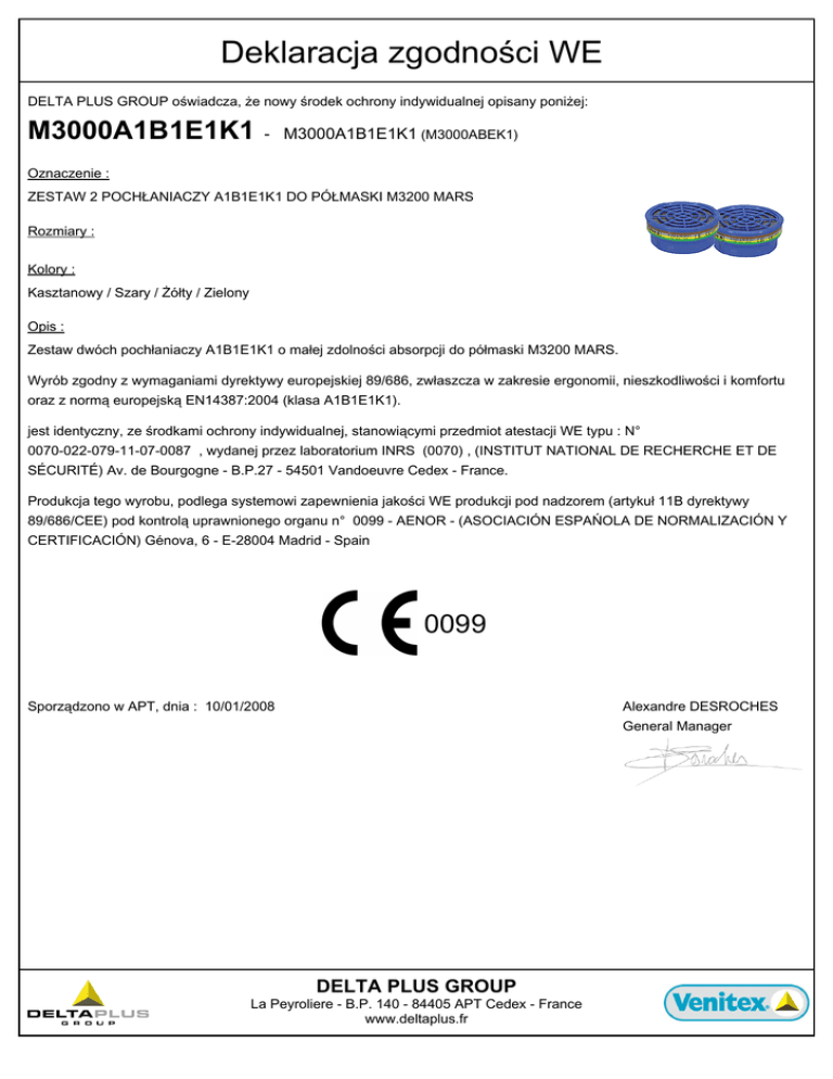 ! A 0 ! "# "!$ M3000A1B1E1K1 & '()))*+**,* -'()))+,*. $ /0 1 234562/7 *+**,* 84',6 '(1)) ' 9 $ , $ ,#: ; ; <=>: ; / "# $ /#: = "> *+**,* 9>! ?#"! "=>9# '(1)) '@ 0=? A 9A9 : "!#! BC;DBD ># # A9 # 9E: 9F "!#F 5*G(BH$1))G - # *+**,*.@ !#: : 9 ! #:F9 "9: :#:! 0 :" $ 5I ))H)&)11&)HC&**&)H&))BH ! " ?:9 65 -))H). -656 565 2323 J2 6J. K@ +AA & +@@1H & LGL)* MK 2N & O@ ! :A ? " A ##:9 " ! 0 "! " 9 -:> **+ : BC;DBD;2. " : F "A A I ))CC & 5 & -262685 P 5'6/2685 7 26O622685. QK D & &1B))G ' & " ))CC "F $ *);)*;1))B N 23 'A DELTA PLUS GROUP La Peyroliere - B.P. 140 - 84405 APT Cedex - France www.deltaplus.fr