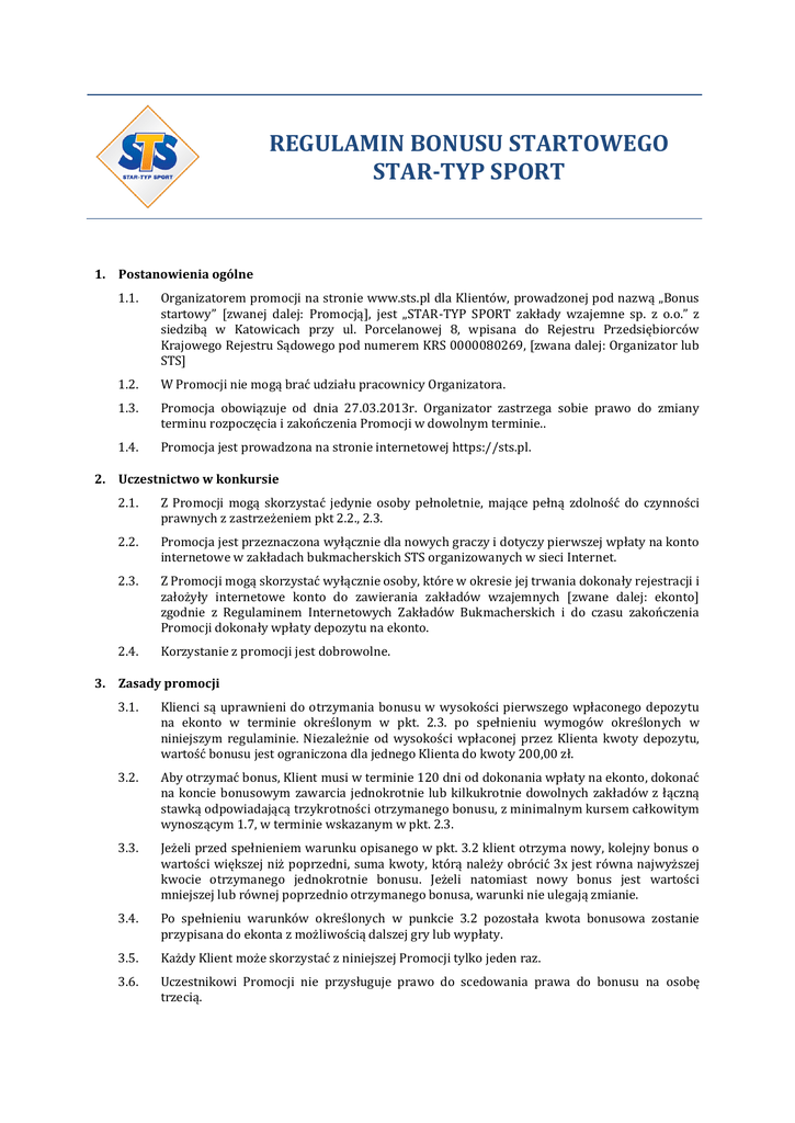 REGULAMIN BONUSU STARTOWEGO STAR-TYP SPORT 1. Postanowienia ogólne 1.1. Organizatorem promocji na stronie www.sts.pl dla Klientów, prowadzonej pod nazwą „Bonus startowy” [zwanej dalej: Promocją], jest „STAR-TYP SPORT zakłady wzajemne sp. z o.o.” z siedzibą w Katowicach przy ul. Porcelanowej 8, wpisana do Rejestru Przedsiębiorców Krajowego Rejestru Sądowego pod numerem KRS 0000080269, [zwana dalej: Organizator lub STS] 1.2. W Promocji nie mogą brać udziału pracownicy Organizatora. 1.3. Promocja obowiązuje od dnia 27.03.2013r. Organizator zastrzega sobie prawo do zmiany terminu rozpoczęcia i zakończenia Promocji w dowolnym terminie.. 1.4. Promocja jest prowadzona na stronie internetowej https://sts.pl. 2. Uczestnictwo w konkursie 2.1. Z Promocji mogą skorzystać jedynie osoby pełnoletnie, mające pełną zdolność do czynności prawnych z zastrzeżeniem pkt 2.2., 2.3. 2.2. Promocja jest przeznaczona wyłącznie dla nowych graczy i dotyczy pierwszej wpłaty na konto internetowe w zakładach bukmacherskich STS organizowanych w sieci Internet. 2.3. Z Promocji mogą skorzystać wyłącznie osoby, które w okresie jej trwania dokonały rejestracji i założyły internetowe konto do zawierania zakładów wzajemnych [zwane dalej: ekonto] zgodnie z Regulaminem Internetowych Zakładów Bukmacherskich i do czasu zakończenia Promocji dokonały wpłaty depozytu na ekonto. 2.4. Korzystanie z promocji jest dobrowolne. 3. Zasady promocji 3.1. Klienci są uprawnieni do otrzymania bonusu w wysokości pierwszego wpłaconego depozytu na ekonto w terminie określonym w pkt. 2.3. po spełnieniu wymogów określonych w niniejszym regulaminie. Niezależnie od wysokości wpłaconej przez Klienta kwoty depozytu, wartość bonusu jest ograniczona dla jednego Klienta do kwoty 200,00 zł. 3.2. Aby otrzymać bonus, Klient musi w terminie 120 dni od dokonania wpłaty na ekonto, dokonać na koncie bonusowym zawarcia jednokrotnie lub kilkukrotnie dowolnych zakładów z łączną stawką odpowiadającą trzykrotności otrzymanego bonusu, z minimalnym kursem całkowitym wynoszącym 1.7, w terminie wskazanym w pkt. 2.3. 3.3. Jeżeli przed spełnieniem warunku opisanego w pkt. 3.2 klient otrzyma nowy, kolejny bonus o wartości większej niż poprzedni, suma kwoty, którą należy obrócić 3x jest równa najwyższej kwocie otrzymanego jednokrotnie bonusu. Jeżeli natomiast nowy bonus jest wartości mniejszej lub równej poprzednio otrzymanego bonusa, warunki nie ulegają zmianie. 3.4. Po spełnieniu warunków określonych w punkcie 3.2 pozostała kwota bonusowa zostanie przypisana do ekonta z możliwością dalszej gry lub wypłaty. 3.5. Każdy Klient może skorzystać z niniejszej Promocji tylko jeden raz. 3.6. Uczestnikowi Promocji nie przysługuje prawo do scedowania prawa do bonusu na osobę trzecią. 3.7. Wypłaty pierwszego wpłaconego depozytu do kwoty 200 zł można dokonać dopiero po jednokrotnym lub kilkukrotnym zawarciu dowolnych zakładów z łączną stawką odpowiadającą jednokrotności kwoty depozytu do 200 zł, z minimalnym kursem całkowitym wynoszącym 1,5. Część kwoty pierwszego wpłaconego depozytu przewyższająca wartość 200 zł z wyłączeniem tej wartości, może być wypłacona w dowolnie wybranym momencie bez konieczności spełnienia warunków zawartych w punkcie 3.6. 4. Postępowanie reklamacyjne i przedawnienie roszczeń 4.1. Ewentualne reklamacje zgłaszać należy drogą elektroniczną na adres e-mail: [email protected], podając dokładny opis i powód reklamacji oraz dane osoby zgłaszającej. 4.2. Reklamacje rozpatrywane będą przez Organizatora na podstawie niniejszego regulaminu w terminie do 30 dni od ich otrzymania. 4.3. W przedmiocie reklamacji ostateczna i wiążąca jest decyzja Organizatora. Uczestnik Promocji zostanie powiadomiony o decyzji drogą elektroniczną. 5. Postanowienia końcowe 5.1. Wszelkie spory wynikłe z tytułu wykonania zobowiązań związanych z niniejszą Promocją będą rozstrzygane przez Sąd właściwy dla siedziby Organizatora. 5.2. Zasady Promocji określa wyłącznie niniejszy regulamin. W kwestiach nie uregulowanych regulaminem stosuje się odpowiednie przepisy Kodeksu cywilnego, ustawy o grach hazardowych oraz Regulamin Internetowych Zakładów Bukmacherskich obowiązujący u Organizatora. 5.3. Wszelkie materiały reklamowe lub promocyjne w związku z Promocją, mają charakter wyłącznie informacyjny. 5.4. Regulamin konkursu dostępny jest na oficjalnej stronie internetowej Organizatora (www.sts.pl). 5.5. Organizator zastrzega sobie prawo do wprowadzenia zmian w niniejszym regulaminie w dowolnym czasie. Zmiany wchodzą w życie w następnym dniu od ich ogłoszenia na stronie www.sts.pl. 5.6. Organizator zastrzega sobie prawo podejmowania indywidualnych decyzji wykluczających poszczególnych Klientów ze Sprzedaży Premiowej lub dopuszczających do Sprzedaży Premiowej. rozpowszechniane