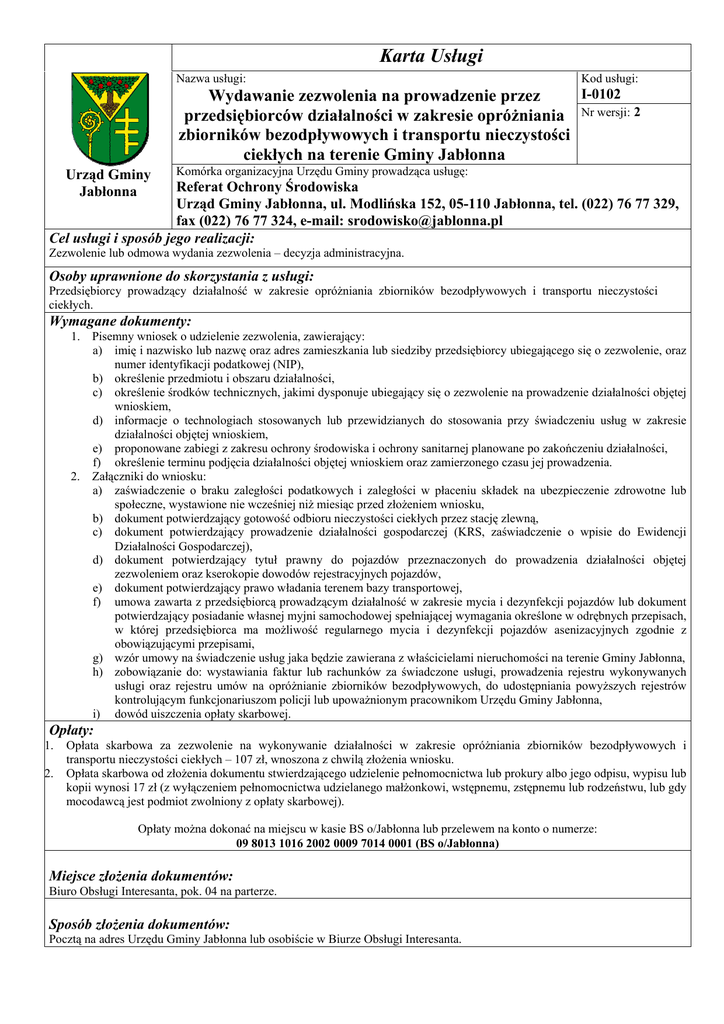 Karta Usługi Nazwa usługi: Kod usługi: I-0102 Wydawanie zezwolenia na prowadzenie przez przedsiębiorców działalności w zakresie opróżniania Nr wersji: 2 zbiorników bezodpływowych i transportu nieczystości ciekłych na terenie Gminy Jabłonna Urząd Gminy Jabłonna Komórka organizacyjna Urzędu Gminy prowadząca usługę: Referat Ochrony Środowiska Urząd Gminy Jabłonna, ul. Modlińska 152, 05-110 Jabłonna, tel. (022) 76 77 329, fax (022) 76 77 324, e-mail: [email protected] Cel usługi i sposób jego realizacji: Zezwolenie lub odmowa wydania zezwolenia – decyzja administracyjna. Osoby uprawnione do skorzystania z usługi: Przedsiębiorcy prowadzący działalność w zakresie opróżniania zbiorników bezodpływowych i transportu nieczystości ciekłych. Wymagane dokumenty: 1. Pisemny wniosek o udzielenie zezwolenia, zawierający: a) imię i nazwisko lub nazwę oraz adres zamieszkania lub siedziby przedsiębiorcy ubiegającego się o zezwolenie, oraz numer identyfikacji podatkowej (NIP), b) określenie przedmiotu i obszaru działalności, c) określenie środków technicznych, jakimi dysponuje ubiegający się o zezwolenie na prowadzenie działalności objętej wnioskiem, d) informacje o technologiach stosowanych lub przewidzianych do stosowania przy świadczeniu usług w zakresie działalności objętej wnioskiem, e) proponowane zabiegi z zakresu ochrony środowiska i ochrony sanitarnej planowane po zakończeniu działalności, f) określenie terminu podjęcia działalności objętej wnioskiem oraz zamierzonego czasu jej prowadzenia. 2. Załączniki do wniosku: a) zaświadczenie o braku zaległości podatkowych i zaległości w płaceniu składek na ubezpieczenie zdrowotne lub społeczne, wystawione nie wcześniej niż miesiąc przed złożeniem wniosku, b) dokument potwierdzający gotowość odbioru nieczystości ciekłych przez stację zlewną, c) dokument potwierdzający prowadzenie działalności gospodarczej (KRS, zaświadczenie o wpisie do Ewidencji Działalności Gospodarczej), d) dokument potwierdzający tytuł prawny do pojazdów przeznaczonych do prowadzenia działalności objętej zezwoleniem oraz kserokopie dowodów rejestracyjnych pojazdów, e) dokument potwierdzający prawo władania terenem bazy transportowej, f) umowa zawarta z przedsiębiorcą prowadzącym działalność w zakresie mycia i dezynfekcji pojazdów lub dokument potwierdzający posiadanie własnej myjni samochodowej spełniającej wymagania określone w odrębnych przepisach, w której przedsiębiorca ma możliwość regularnego mycia i dezynfekcji pojazdów asenizacyjnych zgodnie z obowiązującymi przepisami, g) wzór umowy na świadczenie usług jaka będzie zawierana z właścicielami nieruchomości na terenie Gminy Jabłonna, h) zobowiązanie do: wystawiania faktur lub rachunków za świadczone usługi, prowadzenia rejestru wykonywanych usługi oraz rejestru umów na opróżnianie zbiorników bezodpływowych, do udostępniania powyższych rejestrów kontrolującym funkcjonariuszom policji lub upoważnionym pracownikom Urzędu Gminy Jabłonna, i) dowód uiszczenia opłaty skarbowej. Opłaty: 1. 2. Opłata skarbowa za zezwolenie na wykonywanie działalności w zakresie opróżniania zbiorników bezodpływowych i transportu nieczystości ciekłych – 107 zł, wnoszona z chwilą złożenia wniosku. Opłata skarbowa od złożenia dokumentu stwierdzającego udzielenie pełnomocnictwa lub prokury albo jego odpisu, wypisu lub kopii wynosi 17 zł (z wyłączeniem pełnomocnictwa udzielanego małżonkowi, wstępnemu, zstępnemu lub rodzeństwu, lub gdy mocodawcą jest podmiot zwolniony z opłaty skarbowej). Opłaty można dokonać na miejscu w kasie BS o/Jabłonna lub przelewem na konto o numerze: 09 8013 1016 2002 0009 7014 0001 (BS o/Jabłonna) Miejsce złożenia dokumentów: Biuro Obsługi Interesanta, pok. 04 na parterze. Sposób złożenia dokumentów: Pocztą na adres Urzędu Gminy Jabłonna lub osobiście w Biurze Obsługi Interesanta. Przebieg usługi: 1. Wpłynięcie wniosku, 2. Sprawdzenie kompletności wniosku i ewentualne wezwanie do uzupełnienia braków we wniosku, 3. Protokół z wizji lokalnej (w uzasadnionych przypadkach), 4. Decyzja administracyjna. Tryb odwoławczy: Przysługuje odwołanie od decyzji do Samorzadowego Kolegium Odwoławczego w Warszawie, ul. Senatorska 35 za pośrednictwem Wójta Gminy Jabłonna, w terminie 14 dni od daty odbioru decyzji. Uwagi i uzupełnienia: Formularze wniosku można pobrać w Urzędzie Gminy Jabłonna, pokój 6, I piętro. Termin załatwienia sprawy: W ciągu 30 dni od daty złożenia wniosku, a w sprawie szczególnie skomplikowanej w ciągu 60 dni. Podstawa prawna: 1. Ustawa z dnia 13 września 1996 r. o utrzymaniu czystości i porządku w gminach (Dz. U. z 2005 r. Nr 236, poz. 2008, ze zm.), 2. Ustawa z dnia 14.06.1960r. - Kodeks postępowania administracyjnego (Dz. U.2000r. Nr 98, poz. 1071 - j.t. ze zm.). 3. Zarządzenie Nr 319/I/06 Wójta Gminy Jabłonna z dnia 19 kwietnia 2006 r. w sprawie określenia wymagań, jakie powinien spełniać przedsiębiorca ubiegający się o uzyskanie zezwolenia na prowadzenie działalności w zakresie odbierania odpadów komunalnych od właścicieli nieruchomości oraz opróżniania zbiorników bezodpływowych i transportu nieczystości ciekłych. 4. Część III ust. 42 i część IV załącznika do ustawy z dnia 16 listopada 2006r. o opłacie skarbowej (Dz. U. Nr 225, poz. 1635, ze zm.). Sporządził/-a: Agnieszka Otowska – Inspektor ds. Sprawdził/-a: Hubert Macioch – Kierownik Referatu Ochrony . ochrony środowiska Środowiska Zatwierdził/-a: Olga Muniak – Wójt Gminy Jabłonna Data zatwierdzenia: 8 września 2008r. Zatwierdzono: Zarządzenie Wójta Gminy Jabłonna Nr 104/2008 z dnia 8 września 2008r. Obowiązuje od: 8 września 2008r.