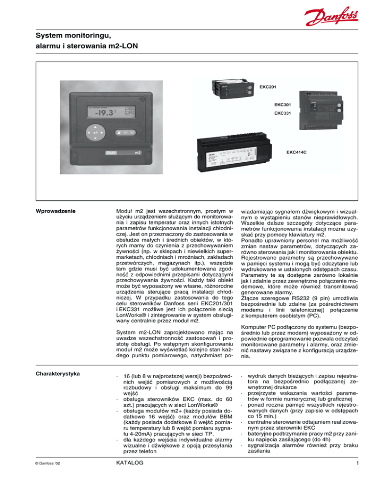 System monitoringu, alarmu i sterowania m2-LON Wprowadzenie Charakterystyka © Danfoss '02 Modu³ m2 jest wszechstronnym, prostym w u¿yciu urz¹dzeniem s³u¿¹cym do monitorowania i zapisu temperatur oraz innych istotnych parametrów funkcjonowania instalacji ch³odniczej. Jest on przeznaczony do zastosowania w obs³udze ma³ych i rednich obiektów, w których mamy do czynienia z przechowywaniem ¿ywnoci (np. w sklepach i niewielkich supermarketach, ch³odniach i mroniach, zak³adach przetwórczych, magazynach itp.), wszêdzie tam gdzie musi byæ udokumentowana zgodnoæ z odpowiednimi przepisami dotycz¹cymi przechowywania ¿ywnoci. Ka¿dy taki obiekt mo¿e byæ wyposa¿ony we w³asne, ró¿norodne urz¹dzenia steruj¹ce prac¹ instalacji ch³odniczej. W przypadku zastosowania do tego celu sterowników Danfoss serii EKC201/301 i EKC331 mo¿liwe jest ich po³¹czenie sieci¹ LonWorks® i zintegrowanie w system obs³ugiwany centralnie przez modu³ m2. wiadamiaj¹c sygna³em dwiêkowym i wizualnym o wyst¹pieniu stanów nieprawid³owych. Wszelkie dalsze szczegó³y dotycz¹ce parametrów funkcjonowania instalacji mo¿na uzyskaæ przy pomocy klawiatury m2. Ponadto uprawniony personel ma mo¿liwoæ zmian nastaw parametrów, dotycz¹cych zarówno sterowania jak i monitorowania obiektu. Rejestrowane parametry s¹ przechowywane w pamiêci systemu i mog¹ byæ odczytane lub wydrukowane w ustalonych odstêpach czasu. Parametry te s¹ dostêpne zarówno lokalnie jak i zdalnie przez zewnêtrzne po³¹czenie modemowe, które mo¿e równie¿ transmitowaæ generowane alarmy. Z³¹cze szeregowe RS232 (9 pin) umo¿liwia bezporednie lub zdalne (za porednictwem modemu i linii telefonicznej) po³¹czenie z komputerem osobistym (PC). System m2-LON zaprojektowano maj¹c na uwadze wszechstronnoæ zastosowañ i prostotê obs³ugi. Po wstêpnym skonfigurowaniu modu³ m2 mo¿e wywietlaæ kolejno stan ka¿dego punktu pomiarowego, natychmiast po- Komputer PC pod³¹czony do systemu (bezporednio lub przez modem) wyposa¿ony w odpowiednie oprogramowanie pozwala odczytaæ monitorowane parametry i alarmy, oraz zmieniæ nastawy zwi¹zane z konfiguracj¹ urz¹dzenia. · 16 (lub 8 w najprostszej wersji) bezporednich wejæ pomiarowych z mo¿liwoci¹ rozbudowy i obs³ugi maksimum do 99 wejæ · obs³uga sterowników EKC (max. do 60 szt.) pracuj¹cych w sieci LonWorks® · obs³uga modu³ów m2+ (ka¿dy posiada dodatkowe 16 wejæ) oraz modu³ów BBM (ka¿dy posiada dodatkowe 8 wejæ pomiaru temperatury lub 8 wejæ pomiaru sygna³u 4-20mA) pracuj¹cych w sieci TP. · dla ka¿dego wejcia indywidualne alarmy wizualne i dwiêkowe z opcj¹ przesy³ania przez telefon · wydruk danych bie¿¹cych i zapisu rejestratora na bezporednio pod³¹czanej zewnêtrznej drukarce · przejrzyste wskazania wartoci parametrów w formie numerycznej lub graficznej · ponad roczna pamiêæ wszystkich rejestrowanych danych (przy zapisie w odstêpach co 15 min.) · centralne sterowanie odtajaniem realizowanym przez sterowniki EKC · bateryjne podtrzymanie pracy m2 przy zaniku napiêcia zasilaj¹cego (do 4h) · sygnalizacja alarmów równie¿ przy braku zasilania KATALOG 1 System monitoringu, alarmu i sterowania m2-LON Przegl¹d systemu System m2-LON sk³ada siê z centralnej jednostki monitoruj¹cej, do której mo¿na bezporednio pod³¹czyæ max. 16 (lub 8 w najprostszej wersji) czujników temperatury lub innych sygna³ów (w tym sygna³y analogowe pr¹dowe lub napiêciowe, sygna³y ON/OFF) oraz max. 60 sterowników EKC 201/301/331 pracuj¹cych w sieci LON, a tak¿e modu³y rozszerzaj¹ce m2+ lub BBM (ka¿dy posiada dodatkowe wejcia pomiarowe) pracuj¹ce w sieci TP. Maksymalna iloæ wejæ obs³ugiwanych przez system m2 wynosi 99 (wliczaj¹c w to zarówno wejcia pomiarowe jak i sterowniki EKC). Dok³adne rozmieszczenie i typy czujników, sterowników i modu³ów rozszerzaj¹cych okrelane s¹ indywidualnie dla ka¿dej instalacji uwzglêdniane przy konfiguracji modu³u m2. Znajomoæ szczegó³ów z tym zwi¹zanych nie jest konieczna do póniejszej codziennej obs³ugi systemu. Alarmy Urz¹dzenie m2 zapewnia dwiêkowe i wizualne alarmy, je¿eli wartoæ sygna³u przekroczy uprzednio zaprogramowany poziom. System mo¿na ustawiæ na zdalne sygnalizowanie stanów alarmowych przez po³¹czenie telefoniczne (zewnêtrzne urz¹dzenie wybieraj¹ce) lub przez modem, a tak¿e za pomoc¹ wiadomoci tekstowych SMS, o ile pod³¹czono odpowiedni modem GSM. Mo¿liwe jest zró¿nicowanie sposobu alarmowania w zale¿noci od pory doby i wejcia pomiarowego, dla którego wyst¹pi³ alarm. Zabezpieczenia Bezpieczeñstwo dzia³ania jest zagwarantowane przez zastosowanie kodu dostêpu do nastaw zwi¹zanych z konfiguracj¹ systemu, uniemo¿liwiaj¹c tym samym ich zmianê przez osoby niepowo³ane. W przypadku awarii zasilania, po ustalonym czasie opónienia, uruchamiany jest alarm. W razie alarmu system mo¿e równie¿ uruchomiæ zewnêtrzne urz¹dzenie wybieraj¹ce ustalony numer telefonu. System m2 zawsze zapewnia bezpieczeñstwo w razie zaniku napiêcia zasilaj¹cego (za wyj¹tkiem po³¹czenia modemowego). Podtrzymanie bateryjne Urz¹dzenie m2 posiada podtrzymanie bateryjne, pozwalaj¹ce kontynuowaæ zapis parametrów w razie awarii zasilania (czas podtrzymania jest ograniczony). W takim przypadku 2 KATALOG podwietlenie ekranu jest wy³¹czone, ale wywietlanie parametrów nadal funkcjonuje. W razie wyst¹pienia w tym czasie alarmu zarówno sygna³ dwiêkowy jak i migaj¹cy na czerwono ekran bêd¹ sygnalizowaæ alarm. Ekran miga na czerwono co 5 sekund, a¿ do skasowania alarmu. Uwaga: W przypadku zaniku zasilania trwaj¹cego ponad 1 godzinę urz¹dzenie przerwie zapis parametrów i wykrywanie stanów alarmowych. Jednak wszystkie zapisane w pamiêci dane zostan¹ zachowane i nie s¹ w takiej sytuacji tracone. Po³¹czenia zewnêtrzne Do modu³u m2 mo¿na pod³¹czyæ bezporednio: · Elementy pomiarowe pod³¹czane na listwie zaciskowej max. 16 (8) szt. · Sieæ sterowników 