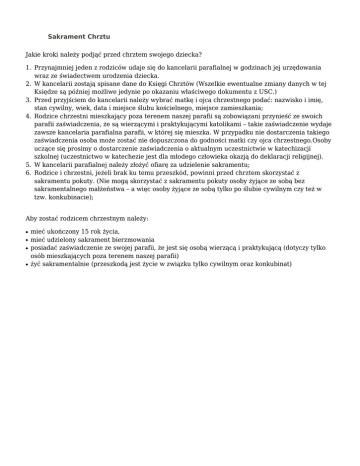 Sakrament Chrztu Jakie kroki należy podjąć przed chrztem swojego dziecka? 1. Przynajmniej jeden z rodziców udaje się do kancelarii parafialnej w godzinach jej urzędowania wraz ze świadectwem urodzenia dziecka. 2. W kancelarii zostają spisane dane do Księgi Chrztów (Wszelkie ewentualne zmiany danych w tej Księdze są później możliwe jedynie po okazaniu właściwego dokumentu z USC.) 3. Przed przyjściem do kancelarii należy wybrać matkę i ojca chrzestnego podać: nazwisko i imię, stan cywilny, wiek, data i miejsce ślubu kościelnego, miejsce zamieszkania; 4. Rodzice chrzestni mieszkający poza terenem naszej parafii są zobowiązani przynieść ze swoich parafii zaświadczenia, że są wierzącymi i praktykującymi katolikami – takie zaświadczenie wydaje zawsze kancelaria parafialna parafii, w której się mieszka. W przypadku nie dostarczenia takiego zaświadczenia osoba może zostać nie dopuszczona do godności matki czy ojca chrzestnego.Osoby uczące się prosimy o dostarczenie zaświadczenia o aktualnym uczestnictwie w katechizacji szkolnej (uczestnictwo w katechezie jest dla młodego człowieka okazją do deklaracji religijnej). 5. W kancelarii parafialnej należy złożyć ofiarę za udzielenie sakramentu; 6. Rodzice i chrzestni, jeżeli brak ku temu przeszkód, powinni przed chrztem skorzystać z sakramentu pokuty. (Nie mogą skorzystać z sakramentu pokuty osoby żyjące ze sobą bez sakramentalnego małżeństwa – a więc osoby żyjące ze sobą tylko po ślubie cywilnym czy też w tzw. konkubinacie); Aby zostać rodzicem chrzestnym należy: ● ● ● ● mieć ukończony 15 rok życia, mieć udzielony sakrament bierzmowania posiadać zaświadczenie ze swojej parafii, że jest się osobą wierzącą i praktykującą (dotyczy tylko osób mieszkających poza terenem naszej parafii) żyć sakramentalnie (przeszkodą jest życie w związku tylko cywilnym oraz konkubinat)