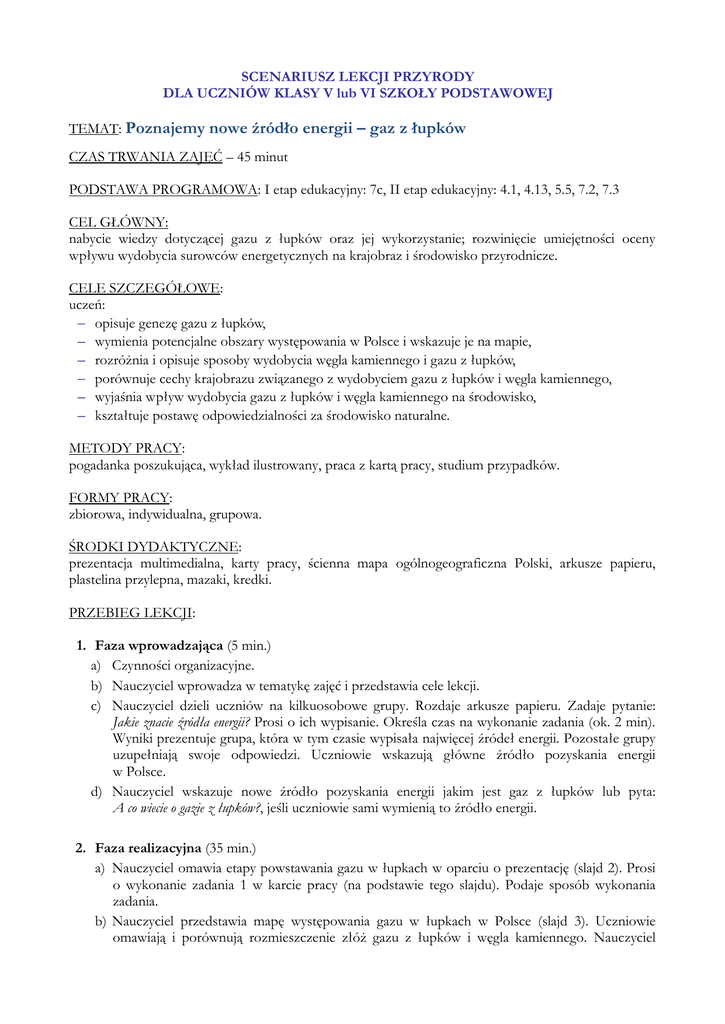 SCENARIUSZ LEKCJI PRZYRODY DLA UCZNIÓW KLASY V lub VI SZKOŁY PODSTAWOWEJ TEMAT: Poznajemy nowe źródło energii – gaz z łupków CZAS TRWANIA ZAJĘĆ – 45 minut PODSTAWA PROGRAMOWA: I etap edukacyjny: 7c, II etap edukacyjny: 4.1, 4.13, 5.5, 7.2, 7.3 CEL GŁÓWNY: nabycie wiedzy dotyczącej gazu z łupków oraz jej wykorzystanie; rozwinięcie umiejętności oceny wpływu wydobycia surowców energetycznych na krajobraz i środowisko przyrodnicze. CELE SZCZEGÓŁOWE: uczeń: opisuje genezę gazu z łupków, wymienia potencjalne obszary występowania w Polsce i wskazuje je na mapie, rozróżnia i opisuje sposoby wydobycia węgla kamiennego i gazu z łupków, porównuje cechy krajobrazu związanego z wydobyciem gazu z łupków i węgla kamiennego, wyjaśnia wpływ wydobycia gazu z łupków i węgla kamiennego na środowisko, kształtuje postawę odpowiedzialności za środowisko naturalne. METODY PRACY: pogadanka poszukująca, wykład ilustrowany, praca z kartą pracy, studium przypadków. FORMY PRACY: zbiorowa, indywidualna, grupowa. ŚRODKI DYDAKTYCZNE: prezentacja multimedialna, karty pracy, ścienna mapa ogólnogeograficzna Polski, arkusze papieru, plastelina przylepna, mazaki, kredki. PRZEBIEG LEKCJI: 1. Faza wprowadzająca (5 min.) a) Czynności organizacyjne. b) Nauczyciel wprowadza w tematykę zajęć i przedstawia cele lekcji. c) Nauczyciel dzieli uczniów na kilkuosobowe grupy. Rozdaje arkusze papieru. Zadaje pytanie: Jakie znacie źródła energii? Prosi o ich wypisanie. Określa czas na wykonanie zadania (ok. 2 min). Wyniki prezentuje grupa, która w tym czasie wypisała najwięcej źródeł energii. Pozostałe grupy uzupełniają swoje odpowiedzi. Uczniowie wskazują główne źródło pozyskania energii w Polsce. d) Nauczyciel wskazuje nowe źródło pozyskania energii jakim jest gaz z łupków lub pyta: A co wiecie o gazie z łupków?, jeśli uczniowie sami wymienią to źródło energii. 2. Faza realizacyjna (35 min.) a) Nauczyciel omawia etapy powstawania gazu w łupkach w oparciu o prezentację (slajd 2). Prosi o wykonanie zadania 1 w karcie pracy (na podstawie tego slajdu). Podaje sposób wykonania zadania. b) Nauczyciel przedstawia mapę występowania gazu w łupkach w Polsce (slajd 3). Uczniowie omawiają i porównują rozmieszczenie złóż gazu z łupków i węgla kamiennego. Nauczyciel prosi uczniów o wykonanie zadania 2 w karcie pracy (na podstawie tego slajdu). Podaje sposób wykonania zadania. c) Nauczyciel omawia etapy wydobycia gazu z łupków (slajd 4), a następnie przedstawia sposoby wydobycia węgla brunatnego, kamiennego i gazu z łupków (slajd 5). d) Uczniowie porównują sposoby wydobycia węgla kamiennego i gazu z łupków i wskazują różnice (slajd 6). e) Następnie nauczyciel zadaje pytanie: Jakie zmiany w krajobrazie wywołuje wydobycie węgla? (Jakie cechy ma krajobraz wokół kopalni wągla?). Uczniowie wymieniają antropogeniczne składniki krajobrazu przemysłowego. Nauczyciel prezentuje slajdy 7 i 8, przedstawiające krajobrazy wokół kopalni węgla kamiennego i gazu z łupków. Uczniowie porównują krajobrazy związane z dwoma sposobami wytwarzania energii: z węgla i gazu z łupków oraz formułują wniosek, w którym z krajobrazów zachowało się więcej cech krajobrazu naturalnego. Nauczyciel prosi o wykonanie zadania 3 i 4 w karcie pracy, kontroluje prace uczniów, pomaga im oraz wyjaśnia pojawiające się wątpliwości. 3. Faza podsumowująca: (4 min.) a) Nauczyciel sprawdza stopień opanowania omówionych zagadnień (Czego nowego dowiedzieliście się na tej lekcji?). b) Ocenia pracę uczniów na lekcji. 4. Zadanie domowe (1 min.) Zadanie 5 w karcie pracy. SLAJDY: 1) 2) 3) 4) 5) 6) 7) 8) Temat prezentacji Jak powstał gaz w łupkach? Występowanie gazu w łupkach w Polsce - mapa Jak wydobywa się gaz z łupków? Sposoby wydobycia: węgla brunatnego, węgla kamiennego, gazu z łupków Porównanie wydobycia węgla kamiennego i gazu z łupków Krajobrazy wokół kopalni węgla kamiennego i gazu z łupków Krajobraz wokół wiertni gazu z łupków KARTA PRACY POZNAJEMY NOWE ŹRÓDŁO ENERGII – GAZ Z ŁUPKÓW 1) Uporządkuj etapy powstawania gazu łupkowego dobierając do rysunku poprawny opis (od 1 do 4) wydarzeń. A B C D 1 - obumarłe szczątki zwierząt i roślin zasypuje muł i piasek niesiony przez rzeki wpadające do morza 2 - przed milionami lat w morzu żyły różne organizmy i pierwotne ryby 3 - współcześnie możemy korzystać z pokładów gazu z łupków 4 - kolejne warstwy osadów przykrywają szczątki organiczne na dnie. Pod wpływem temperatury z głębi ziemi i wysokiego ciśnienia powstaje skała łupkowa z uwięzionym gazem. A - …….. B - …….. C - …….. D - …….. 2) Na mapie konturowej Polski zaznacz kolorem żółtym obszar występowania gazu z łupków, a kolorem czarnym występowania węgla kamiennego. 3) Zaznacz rysunek przedstawiający sposób wydobycia gazu z łupków. A B C 4) Wpisz pod rysunkami po cztery cechy krajobrazu, który jest wokół kopalni węgla kamiennego (A) i gazu z łupków (B). A B ………………………………………………….. ……………………………………………….. ………………………………………………….. ……………………………………………….. ………………………………………………….. ……………………………………………….. ………………………………………………….. ……………………………………………….. Wierci się otwory pionowe i poziome. Po wykonaniu szczelinowania surowiec wydostaje się samoczynnie. W pokładach tego surowca drąży się szyby pionowe i chodniki. Wydobywa się go na powierzchnię za pomocą pracy wielu ludzi i urządzeń. W miejscu wydobywania tego surowca widać tylko niewielką rurę i ogrodzenie. Krajobraz przyrodniczy jest nieznacznie przekształcony. Krajobraz przyrodniczy jest silnie przekształcony. W kra