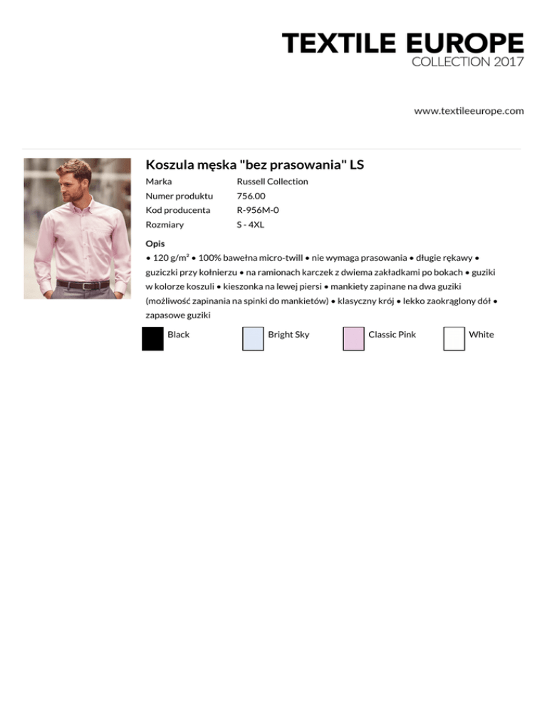 Koszula męska "bez prasowania" LS Marka Russell Collection Numer produktu 756.00 Kod producenta R-956M-0 Rozmiary S - 4XL Opis • 120 g/m² • 100% bawełna micro-twill • nie wymaga prasowania • długie rękawy • guziczki przy kołnierzu • na ramionach karczek z dwiema zakładkami po bokach • guziki w kolorze koszuli • kieszonka na lewej piersi • mankiety zapinane na dwa guziki (możliwość zapinania na spinki do mankietów) • klasyczny krój • lekko zaokrąglony dół • zapasowe guziki Black Bright Sky Classic Pink White
