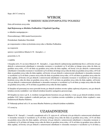 Sygn. akt I C 2109/14 WYROK W IMIENIU RZECZYPOSPOLITEJ POLSKIEJ Dnia 28 kwietnia 2015 roku Sąd Rejonowy w Bielsku Podlaskim I Wydział Cywilny w składzie następującym : Przewodniczący: SSR Anatol Ławrynowicz Protokolant: Radosław Niewiński po rozpoznaniu w dniu 23 kwietnia 2015 roku w Bielsku Podlaskim na rozprawie sprawy z powództwa Miasta S. W. Zarządu (...) przeciwko A. N. o zapłatę I Zasądza od A. N. na rzecz Miasta S. W. Zarządu (...) 1352 złotych ( jednej tysiąc pięćdziesiąt dwa ), od kwoty 270,40 złotych z ustawowymi odsetkami w stosunku rocznym w wysokości 13 % od dnia 13 lutego 2014 roku do dnia 22 grudnia 2014 roku, z 8 % od dnia 23 grudnia 2014 roku do dnia zapłaty, od kwoty 270,40 złotych z ustawowymi odsetkami w stosunku rocznym w wysokości 13 % od dnia 26 lutego 2014 roku do dnia 22 grudnia 2014 roku, z 8 % od dnia 23 grudnia 2014 roku do dnia zapłaty, od kwoty 270,40 złotych z ustawowymi odsetkami w stosunku rocznym w wysokości 13 % od dnia 4 marca 2014 roku do dnia 22 grudnia 2014 roku, z 8 % od dnia 23 grudnia 2014 roku do dnia zapłaty, od kwoty 270,40 złotych z ustawowymi odsetkami w stosunku rocznym w wysokości 13 % od dnia 23 kwietnia 2014 roku do dnia 22 grudnia 2014 roku, z 8 % od dnia 23 grudnia 2014 roku do dnia zapłaty, od kwoty 270,40 złotych z ustawowymi odsetkami w stosunku rocznym w wysokości 13 % od dnia 31 maja 2014 roku do dnia 22 grudnia 2014 roku, z 8 % od dnia 23 grudnia 2014 roku do dnia zapłaty. II Zasądza od pozwanej na rzecz powoda kwotę 30 złotych tytułem zwrotu opłaty sądowej od pozwu, 221,40 złotych tytułem zwrotu wydatków i 197 złotych tytułem kosztów zastępstwa procesowego. III Zasądza na rzecz r.pr K. A. tytułem wynagrodzenie kuratora 221,40 złotych, w tym 41,40 złotych tytułem zwrotu podatku VAT, które wypłacić z zaliczki pod poz. 121c i tytułem zwrotu wydatków 31 złotych, które wypłacić z sum budżetowych Skarbu Państwa. IV Nakazuje pobrać od A. N. na rzecz Skarbu Państwa 31 złotych tytułem wydatków. I C 2109/14 UZASADNIENIE Miasto S. W. Zarząd (...) wnosił o zasądzenie od A. N. 1352,00 zł , od kwoty 270,40 złotych z ustawowymi odsetkami w stosunku rocznym w wysokości 13 % od dnia 13 lutego 2014 roku do dnia 22 grudnia 2014 roku, z 8 % od dnia 23 grudnia 2014 roku do dnia zapłaty, od kwoty 270,40 złotych z ustawowymi odsetkami w stosunku rocznym w wysokości 13 % od dnia 26 lutego 2014 roku do dnia 22 grudnia 2014 roku, z 8 % od dnia 23 grudnia 2014 roku do dnia zapłaty, od kwoty 270,40 złotych z ustawowymi odsetkami w stosunku rocznym w wysokości 13 % od dnia 4 marca 2014 roku do dnia 22 grudnia 2014 roku, z 8 % od dnia 23 grudnia 2014 roku do dnia zapłaty, od kwoty 270,40 złotych z ustawowymi odsetkami w stosunku rocznym w wysokości 13 % od dnia 23 kwietnia 2014 roku do dnia 22 grudnia 2014 roku, z 8 % od dnia 23 grudnia 2014 roku do dnia zapłaty, od kwoty 270,40 złotych z ustawowymi odsetkami w stosunku rocznym w wysokości 13 % od dnia 31 maja 2014 roku do dnia 22 grudnia 2014 roku, z 8 % od dnia 23 grudnia 2014 roku do dnia zapłaty i obciążenie pozwanej kosztami procesu. W uzasadnieniu pozwu podano, iż pozwana pięciokrotnie korzystała z komunikacji miejskiej nie posiadając ważnego dokumentu przewozu. Kurator reprezentujący nieznaną z miejsca pobytu pozwaną w odpowiedzi na pozew wnosił o oddalenie powództwa, przyznanie wynagrodzenia i zwrot poniesionych wydatków kwestionując okoliczności podane w pozwie zarówno istnienie jak i wysokość roszczenia powoda . Sąd Rejonowy ustalił i zważył co następuje: Pozwana A. N. w dniach 29 stycznia 2014 roku, 11 lutego 2014 roku, 16 lutego 2014 roku, 08 kwietnia 2014 roku i 16 maja 2014 roku korzystała z komunikacji miejskiej na terenie W. nie posiadając ważnego dokumentu przewozu. Kontrolerzy Zarządu (...) w W., którzy stwierdzili tę okoliczność za każdym razem na urzędowym numerowanym druku oznaczyli dzień i godzinę zatrzymania pozwanej bez biletu, miejsce, strefę, numer pojazdu, dokładne dane personalne pozwanej, jej numer PESEL a także dokument potwierdzający jej tożsamość. Na potwierdzeniu widnieje podpis pozwanej na dowód zapoznania się z treścią wezwania, numer i podpis kontrolera. Za każdym razem zatrzymanie realizował inny kontroler. Powyższe ustalenia znajdują potwierdzenie w dokumentach k 4-8 ( wezwanie do zapłaty ) k 25, k 28 ( dane personalne pozwanej ), k 66 (informacja z Posterunku Policji w D.), k 68 – 80 ( Uchwała LXVI /1807 /2013 Rady Miasta Stołecznego W. z dnia 03 października 2013 roku zmieniającą uchwałę w sprawie opłat za usługi przewozowe środkami lokalnego transportu zbiorowego w W., zmiany uchwały w sprawie ustalenia ulg za usługi przewozowe środkami lokalnego transportu zborowego oraz zmiany uchwały w sprawie regulaminu przewozu osób i bagażu środkami lokalnego transportu zbiorowego w W.) W terminach zakreślonych przez Sąd powód i kurator pozwanej korzystali z prawa zgłaszania wszelkich wniosków dowodowych. Powód w uzasadnieniu pozwu wskazując na podstawę prawną swojego roszczenia odwoływał się do zapisu art. 33 a ust. 3 ustawy Prawo przewozowe z dnia 15 listopada 1984 roku ( Dz. U. 2000.500.601). Przywołanie zaś w uzasadnieniu pozwu nieobowiązującej uchwały nr XVI /301/2011 Rady Miasta W. z dnia 26 maja 2011 roku w sprawie opłat za usługi przewozowe środkami lokalnego transportu zbiorowego nie oznacza że wielkość obciążających pozwaną opłat została niewłaściwie wyliczona. Pozostają te opłaty tj. opłata dodatkowa w kwocie 266 zł oraz należność przewozowa w wysokości 4,40 zł. w zgodzie z obowiązującą podstawą prawną tj. Uchwałą nr LXVI /1807/2013 Rady Miasta Stołecznego W. przedłożoną w sprawie w charakterze dowodu obowiązującego prawa. W punkcie VIII tejże uchwały wskazano iż opłaty dodatkowe za przejazd bez odpowiedniego dokumenty przewozu (tak jak w przypadku przejazd