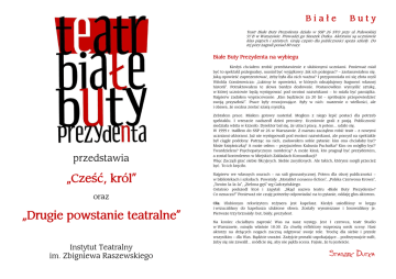 Białe Buty Teatr Białe Buty Prezydenta działa w SSP 26 STO przy ul. Puławskiej 97 B w Warszawie. Prowadzi go Staszek Dutka. Aktorami są uczniowie klas piątych i szóstych. Grają często dla publiczności spoza szkoły. Do tej pory zagrali ponad 80 razy. Białe Buty Prezydenta na wybiegu Kiedyś chciałem zrobić przedstawienie z ulubionymi uczniami. Ponieważ miał być to spektakl pożegnalny, musiał być wyjątkowy. Jak ich pożegnać? – zastanawiałem się. Jaką opowieść zaprezentować, żeby była dla nich ważna? I przypomniała mi się złota myśl Witolda Gombrowicza: „Lubimy te opowieści, w których odnajdujemy fragment własnej historii”. Potraktowałem te słowa bardzo dosłownie. Postanowiłem wymyślić sztukę, w której uczniowie będą występować pod swoimi nazwiskami – to miała być pamiątka. Najpierw zadałem wypracowanie: „Kim będziecie za 20 lat – spróbujcie przepowiedzieć swoją przyszłość”. Prace były emocjonujące. Były w nich: marzenie o wielkości, ale i obawa, że można zostać szarą myszką. Zebrałem prace. Miałem gotowy materiał. Mogłem z niego lepić postaci dla potrzeb spektaklu. I wreszcie nadszedł dzień premiery. Uczniowie grali z pasją. Publiczność siedziała wbita w krzesło. Dyrektor bał się, że utraci pracę. A potem... udało się. W 1999 r. trafiłem do SSP nr 26 w Warszawie. Z marszu zacząłem robić teatr – z nowymi uczniami-aktorami. Już nie występowali pod swoimi nazwiskami, ale pomysł na spektakle był ciągle podobny. Patrząc na nich, zadawałem sobie pytanie: kim ona chciałaby być? Może księżniczką? A może osłem – przyjacielem Kubusia Puchatka? Kim on mógłby być? Twardzielem? Psychopatycznym mordercą? A może kimś, kto pragnął być prezydentem, przedstawia a został kontrolerem w Miejskich Zakładach Komunikacji? Więc Zaczęli grać siebie fikcyjnych. Siebie zmyślonych. Ale takich, którymi mogli przecież być. To ich kręciło. „Cześć, król” Najpierw we własnych murach – na sali gimnastycznej. Potem dla obcej publiczności – w bibliotekach i szkołach. Powstały: „Moralitet nonsens-fiction”, „Polska Czerwona Krowa”, „Tuwim la-la-la”, „Zielona gęś” wg Gałczyńskiego. Ostatnio oraz Ola: „Drugie powstanie teatralne” podszedł ktoś i zapytał: „Skąd nazwa teatru »Białe Buty Prezydenta«? Co oznacza?” Ponieważ nie czuję potrzeby odpowiadać na to pytanie, oddaję głos aktorom. Ulubionym rekwizytem reżysera jest kapelusz. Kiedyś usiedliśmy w kręgu i wrzucaliśmy do kapelusza ulubione słowa. Zostały wymieszane i losowaliśmy je. Pierwsze trzy brzmiały: but, biały, prezydent. Na koniec chciałbym zaprosić Was na nasz występ. Jest 1 czerwca, teatr Studio w Warszawie, minęła właśnie 18:30. Za chwilę reflektory rozproszą mrok sceny. Nasi aktorzy na drżących nogach zaczną odgrywać swoje role. Trochę dla siebie i przede wszystkim – dla Was. Bądźcie uważni. Zażyjcie proszki uspokajające... podtrzymujcie sufit, Instytut Teatralny im. Zbigniewa Raszewskiego żeby się nie zawalił... módlcie się, aby nie pękła scena. Fajnie, że tu jesteście. Staszek Dutka „Drugie powstanie 8 maja 2012 r., godz. 18:30 teatralne” Drugie powstanie teatralne, czyli skecze aktorskie uczniów Centralnym punktem zajęć teatralnych jest zrobienie skeczu na zadany Obsada: temat. Tematów przewija się dziesiątki – spotkanie eleganta z dwoma żulami, robienie halloweenowego żartu babci czy wcielanie się w skórkę od banana. Te zajęcia to popis wyobraźni aktorów. Michał Bartyzel Olga Lenartowicz Karol Cieśluk Zuzanna Mędza Sonia Góral Emilia Narkiewcz-Jodko Izabela Hryciuk Natalia Lach Marcin Jakoniuk Marysia Sanak Kajetan Kosiec Zuzanna Wciślak Łukasz Kremky Anna Wojnar Zosia Piontek Przez dziesięciolecie grałem sztuki własnego autorstwa. Pewnego razu jednak pomyślałem: a może im trzeba dać szansę? Zaczęły spływać do mnie ich własne scenariusze. Oto pytania, przed którymi nas stawiają: O co chodzi jęczącej starej sałacie? Co wyjdzie ze spotkania kloszarda z bogaczką? Czy polska drużyna dotrze na mecz finałowy na czas? Jak się zachować, kiedy przedmioty z twojej osobistej garderoby zaczną do ciebie gadać? Czy wiecie, że istnieje zapach zwycięstwa? Czy chcecie poznać nieznane smaki popularności? Staszek Dutka scenografia Anna Kordys reżyseria Stanisław Dutka autorzy tekstów: Olga Lenartowicz, Emilia Narkiewicz-Jodko, Kajetan Kosiec, Anna Wojnar, Zofia Piontek, Staszek Dutka „C z e ś ć, k r ó l” 11 maja 2012 r., godz. 18:30 Obsada: Król – Kajtek Chlipalski Błazen – Jeremi Chelis Królowa – Ola Tokarska Stylistka 1 – Zuzia Opuchlik Królewna – Natalia Neuber Stylistka 2 – Zosia Holewjusz Smok – Zosia Stachnik Facet 1 – Jan Brochwicz Doradca 1 – Zuzia Czyż Facet 2 – Jan Ciałowicz Doradca 2 – Julian Wąsowski Goniec – Paulina Jastrzębska Młodzieniec – Krystian Kennedy Wodzirej – Anna Gdańska Trubadur – Emma Barska scenografia Anna Kordys, Marta Żydok scenariusz i reżyseria Stanisław Dutka „Cześć, król” to parodia tradycyjnej bajki zainspirowana opowiadaniem Beaty Krupskiej pt. „Bajka o rycerzu i królu”. Zamiast opowiadać, o czym to jest, raczej należałoby zapytać: Czy patrząc na królów, nie przyszła wam nigdy do głowy myśl, że mogą oni nie czuć się dobrze w królewskich rolach? Czy Wy, przyzwyczajeni do widoku księżniczek oglądających z wysokości swych wież trupy połykanych przez smoki rycerzy, pomyśleliście o takich księżniczkach, o których wdzięki żaden waleczny młodzieniec nie ma ochoty walczyć? A co w głębi swego pyska ma bestia, której starość skruszyła kły? O tym i owym w spektaklu pt. „Cześć, król”. Prezydenta Teatr Białe Buty Prezydenta dziękuje: Najważniejsze wspomnienie z Białych Butów Prezydenta? • Zuzia Mędza: Próba „Osła” w teatrze na koniec 5 klasy. Karol 