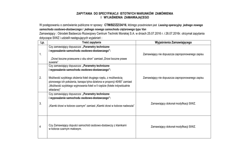 ZAPYTANIA DO SPECYFIKACJI ISTOTNYCH WARUNKÓW ZAMÓWIENIA I WYJAŚNIENIA ZAMAWIAJĄCEGO W postępowaniu o zamówienie publiczne nr sprawy: CTM/BZ/ZZ/24/16, którego przedmiotem jest Leasing operacyjny jednego nowego samochodu osobowo-dostawczego i jednego nowego samochodu ciężarowego typu Van Zamawiający : Ośrodek Badawczo Rozwojowy Centrum Techniki Morskiej S.A. w dniach 25.07.2016 r. i 26.07.2016r. otrzymał zapytania dotyczące SIWZ i udzielił następujących wyjaśnień : Treść zapytania Lp. Wyjaśnienia Zamawiającego Czy zamawiający dopuszcza: „Parametry techniczne i wyposażenie samochodu osobowo-dostawczego”: 1. 1. „Drzwi boczne przesuwne z obu stron” zamiast „Drzwi boczne prawe suwane” Czy zamawiający dopuszcza: „Parametry techniczne i wyposażenie samochodu osobowo-dostawczego”: Możliwość szybkiego złożenia foteli drugiego rzędu, z możliwością pionowego ich położenia, kanapa tylna dzielona w proporcji 40/60” zamiast „Możliwość szybkiego wyjmowania foteli w ll rzędzie (fotele indywidualnie składane)” Czy zamawiający dopuszcza: „Parametry techniczne i wyposażenie samochodu osobowo-dostawczego”: 2. 3. „Klamki drzwi w kolorze czarnym” zamiast „Klamki drzwi w kolorze nadwozia” Czy Zamawiający dopuści samochód osobowo-dostawczy z klamkami w kolorze czarnym matowym. 4 3. Zamawiający nie dopuszcza zaproponowanego zapisu Zamawiający nie dopuszcza zaproponowanego zapisu Zamawiający dokonał modyfikacji SIWZ. Zamawiający dokonał modyfikacji SIWZ. ZMIANA SPECYFIKACJI ISTOTNYCH WARUNKÓW ZAMÓWIENIA . W postępowaniu o zamówienie publiczne nr sprawy: CTM/BZ/ZZ/24/16, którego przedmiotem jest Leasing operacyjny jednego nowego samochodu osobowo-dostawczego i jednego nowego samochodu ciężarowego typu Van Zamawiający : Ośrodek Badawczo Rozwojowy Centrum Techniki Morskiej S.A. w dniu 26.07.2016 r. dokonał zmiany treści SIWZ. Wobec powyższego odpowiednie zapisy SIWZ uległy następującej zmianie: Lp Nr punktu SIWZ 1 Zał. Nr 2 do SIWZ, pkt I, ppkt.28) Treść dotychczasowa Nowa treść Parametry techniczne i wyposażenie samochodu Parametry techniczne osobowo-dostawczego. osobowo-dostawczego. Klamki drzwi w kolorze nadwozia; Data wysłania wykonawcom zmian SIWZ : 26.07.2016 r i wyposażenie samochodu Klamki drzwi w kolorze nadwozia lub w kolorze czarnym lub w czarnym matowym;