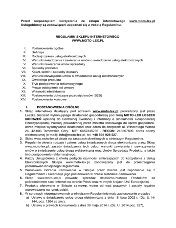 Przed rozpoczęciem korzystania ze sklepu internetowego Usługobiorcy są zobowiązani zapoznać się z treścią Regulaminu. www.moto-lex.pl REGULAMIN SKLEPU INTERNETOWEGO WWW.MOTO-LEX.PL I. II. III. IV. V. VI. VII. VIII. IX. X. XI. XII. XIII. XIV. Postanowienia ogólne Definicje Rodzaj i zakres usług elektronicznych Warunki świadczenia i zawierania umów o świadczenie usług elektronicznych Warunki zawierania umów sprzedaży Sposoby płatności Koszt, termin i sposoby dostawy Warunki rozwiązania umów o świadczenie usług elektronicznych Gwarancja produktu Tryb postępowania reklamacyjnego Prawo odstąpienia od umowy Własność intelektualna Postanowienia dotyczące przedsiębiorców (B2B) Postanowienia końcowe I. POSTANOWIENIA OGÓLNE 1. Sklep internetowy działający pod adresem www.moto-lex.pl prowadzony jest przez Leszka Sierszeń wykonującego działalność gospodarczą pod firmą MOTO-LEX LESZEK SIERSZEŃ wpisaną do Centralnej Ewidencji i Informacji o Działalności Gospodarczej Rzeczypospolitej Polskiej prowadzonej przez ministra właściwego do spraw gospodarki, adres miejsca wykonywania działalności oraz adres do doręczeń: ul. Wincentego Witosa 24, 42-603 Tarnowskie Góry, NIP: 6452348236 , REGON: 243507699, adres poczty elektronicznej (e-mail): [email protected], tel. +48 698 928 527. 2. Sklep www.moto-lex.pl działa na zasadach określonych w niniejszym Regulaminie. 3. Regulamin określa rodzaje i zakres usług świadczonych drogą elektroniczną przez Sklep www.moto-lex.pl, zasady świadczenia tych usług, warunki zawierania i rozwiązywania umów o świadczenie usług drogą elektroniczną oraz Umów Sprzedaży Produktu, a także tryb postępowania reklamacyjnego. 4. Każdy Usługobiorca z chwilą podjęcia czynności zmierzających do korzystania z Usług Elektronicznych Sklepu www.moto-lex.pl, zobowiązany jest do przestrzegania postanowień niniejszego Regulaminu. 5. Warunkiem złożenia Zamówienia w Sklepie przez Klienta jest zapoznanie się z Regulaminem i akceptacja jego postanowień w czasie składania Zamówienia. 6. Sklep www.moto-lex.pl prowadzi sprzedaż detaliczno-hurtową Produktów, za pośrednictwem sieci Internet na terenie Polski oraz w innych krajach Unii Europejskiej. 7. Produkty oferowane w Sklepie są nowe, wolne od wad prawnych i zostały legalnie wprowadzone na rynek polski. 8. W sprawach nieuregulowanych w niniejszym Regulaminie mają zastosowanie przepisy a) Ustawy o świadczeniu usług drogą elektroniczną z dnia 18 lipca 2002 r. (Dz. U. Nr 144, poz. 1204 ze zm.), b) Ustawy o prawach konsumenta z dnia 30 maja 2014 r. (Dz. U. 2014 poz. 827), c) Ustawy Kodeks cywilny z dnia 23 kwietnia 1964 r. (Dz. U. nr 16, poz. 93 ze zm.) oraz inne właściwe przepisy prawa polskiego. II. DEFINICJE 1. DZIEŃ ROBOCZY – jeden dzień od poniedziałku do piątku z wyłączeniem dni ustawowo wolnych od pracy. 2. FORMULARZ REJESTRACJI – formularz dostępny na stronie internetowej www.motolex.pl umożliwiający utworzenie Konta. 3. FORMULARZ ZAMÓWIENIA – formularz dostępny na stronie internetowej www.motolex.pl umożliwiający złożenie Zamówienia. 4. KONSUMENT – osoba fizyczna, która dokonuje z przedsiębiorcą czynności prawnej niezwiązanej bezpośrednio z jej działalnością gospodarczą lub zawodową. 5. KLIENT – Usługobiorca, który zamierza zawrzeć lub zawarł Umowę Sprzedaży ze Sprzedawcą. 6. KONTO – oznaczony indywidualną nazwą (loginem) oraz hasłem, zbiór zasobów w systemie teleinformatycznym Usługodawcy, w którym gromadzone są dane Usługobiorcy w tym informacje o złożonych Zamówieniach. 7. REGULAMIN - niniejszy regulamin Sklepu. 8. SKLEP - Sklep internetowy Usługodawcy działający pod adresem www.moto-lex.pl 9. SPRZEDAWCA, USŁUGODAWCA – Leszek Sierszeń wykonujący działalność gospodarczą pod firmą MOTO-LEX LESZEK SIERSZEŃ, ul. Wincentego Witosa 24, 42603 Tarnowskie Góry, NIP: 6452348236, REGON: 243507699. 10. PRODUKT – dostępna w Sklepie rzecz ruchoma albo usługa, będąca przedmiotem Umowy Sprzedaży między Klientem, a Sprzedawcą. 11. UMOWA SPRZEDAŻY – Umowa Sprzedaży Produktu zawarta między Klientem, a Sprzedawcą za pośrednictwem Sklepu. 12. USŁUGOBIORCA – osoba fizyczna, osoba prawna albo jednostka organizacyjna nieposiadająca osobowości prawnej, której ustawa przyznaje zdolność prawną korzystająca z Usługi Elektronicznej. 13. USŁUGA ELEKTRONICZNA – usługa świadczona drogą elektroniczną przez Usługodawcę na rzecz Usługobiorcy za pośrednictwem Sklepu. 14. ZAMÓWIENIE - oświadczenie woli Klienta stanowiące ofertę zawarcia Umowy Sprzedaży Produktu ze Sprzedawcą. 15. NEWSLETTER – Usługa Elektroniczna pozwalająca Usługobiorcy na subskrybowanie i otrzymywanie na podany przez Usługobiorcę adres e-mail bezpłatnych informacji pochodzących od Usługodawcy, dotyczących Produktów dostępnych w Sklepie. III. RODZAJ I ZAKRES USŁUG ELEKTRONICZNYCH 1. Usługodawca umożliwia za pośrednictwem Sklepu korzystanie z Usług Elektronicznych takich jak: a) zawieranie Umów Sprzedaży Produktu, b) prowadzenie Konta w Sklepie, c) korzystanie z Newslettera. 2. Świadczenie Usług Elektronicznych na rzecz Usługobiorców w Sklepie odbywa się na warunkach określonych w Regulaminie. 3. Usługodawca ma prawo do zamieszczania na stronie internetowej Sklepu treści reklamowych. Treści te, stanowią integralną część Sklepu i prezentowanych w nim materiałów. IV. 1. 2. 3. 4. 5. 6. 1. 2. 3. 4. 5. 6. 7. WARUNKI ŚWIADCZENIIA I ZAWIERANIA UMÓW O ŚWIADCZENIE USŁUG ELEKTRONICZNYCH Świadczenie Usług Elektronicznych określonych w rozdziale III pkt. 1 Regulaminu przez Usługodawcę jest nieodpłatne. Okres na jaki umowa zostaje zawarta: a) umowa o świadczenie Usługi Elektronicznej polegającej na prowadzeniu Konta w Sklepie zawierana jest na czas nieoznaczony. b) umowa o świadczenie Usługi Elektronicznej polegającej na umożliwieniu złożenia Zamówienia w Sklepi