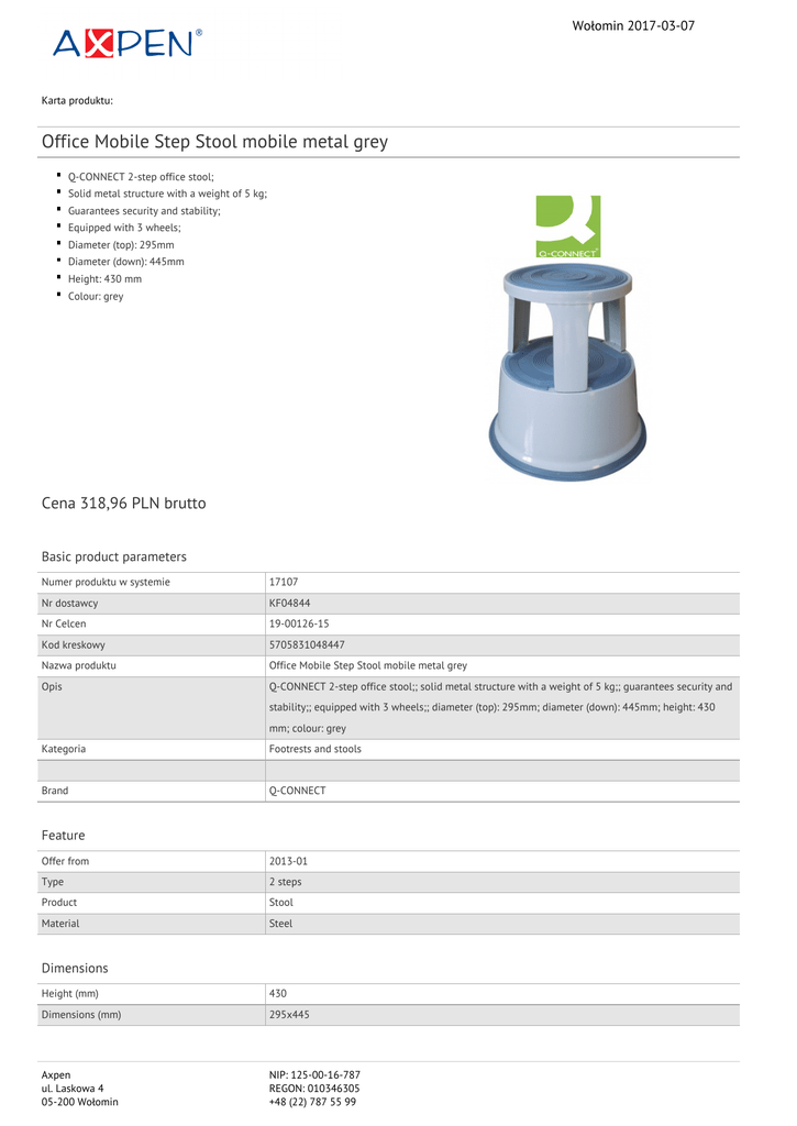 Wołomin 2017-03-07 Karta produktu: Office Mobile Step Stool mobile metal grey Q-CONNECT 2-step office stool; Solid metal structure with a weight of 5 kg; Guarantees security and stability; Equipped with 3 wheels; Diameter (top): 295mm Diameter (down): 445mm Height: 430 mm Colour: grey Cena 318,96 PLN brutto Basic product parameters Numer produktu w systemie 17107 Nr dostawcy KF04844 Nr Celcen 19-00126-15 Kod kreskowy 5705831048447 Nazwa produktu Office Mobile Step Stool mobile metal grey Opis Q-CONNECT 2-step office stool;; solid metal structure with a weight of 5 kg;; guarantees security and stability;; equipped with 3 wheels;; diameter (top): 295mm; diameter (down): 445mm; height: 430 mm; colour: grey Kategoria Footrests and stools Brand Q-CONNECT Feature Offer from 2013-01 Type 2 steps Product Stool Material Steel Dimensions Height (mm) 430 Dimensions (mm) 295x445 Axpen ul. Laskowa 4 05-200 Wołomin NIP: 125-00-16-787 REGON: 010346305 +48 (22) 787 55 99 Wołomin 2017-03-07 Karta katalogowa produktu cd. Office Mobile Step Stool mobile metal grey Procurement vocabulary CPV 39113200-9 Taborety Certifications New product Standard Hit Standard Colour Colour Grey Pozostałe zdjęcia produktu Serdecznie zapraszamy do współpracy Axpen zespół. Axpen ul. Laskowa 4 05-200 Wołomin NIP: 125-00-16-787 REGON: 010346305 +48 (22) 787 55 99