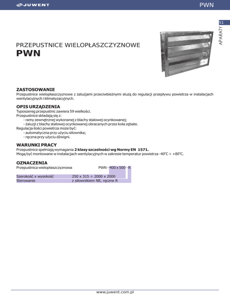 PWN PRZEPUSTNICE WIELOPŁASZCZYZNOWE PWN ZASTOSOWANIE Przepustnice wielopłaszczyznowe z żaluzjami przeciwbieżnymi służą do regulacji przepływu powietrza w instalacjach wentylacyjnych i klimatyzacyjnych. OPIS URZĄDZENIA Typoszereg przepustnic zawiera 59 wielkości. Przepustnice składają się z: - ramy zewnętrznej wykonanej z blachy stalowej ocynkowanej; - żaluzji z blachy stalowej ocynkowanej obracanych przez koła zębate. Regulacja ilości powietrza może być: - automatyczna przy użyciu siłownika; - ręczna przy użyciu dźwigni. WARUNKI PRACY Przepustnice spełniają wymagania 2 klasy szczelności wg Normy EN 1571. Mogą być montowane w instalacjach wentylacyjnych w zakresie temperatur powietrza -400C ÷ +800C. OZNACZENIA Przepustnica wielopłaszczyznowa Szerokość x wysokość Sterowanie PWN - 400 x 500 - R 250 x 315 ÷ 2000 x 2000 z siłownikiem NE, ręczne R www.juwent.com.pl АPARATY 51 52 DANE TECHNICZNE АPARATY PWN Podstawowe wymiary A H 130 Wymiary przepustnic A [mm] 250 315 400 500 630 800 1000 Wymiary przepustnic wzmocnionych H [mm] Masa [kg] 400 500 630 400 500 630 800 400 500 630 800 1000 400 500 630 800 1000 1250 400 500 630 800 1000 1250 1600 400 500 630 800 1000 1250 1600 2000 400 500 630 800 1000 1250 1600 2000 7 7,5 9 7,5 9 10 11,5 9 10 11,5 12,5 16,5 10 11,5 12,5 16 19 22 11,5 13 15 18 24 26 31,5 13 15 18 21,5 26 29,5 37 45 16 18 20 25 29,5 34,5 39,5 52,5 A [mm] 1250 1600 2000 H [mm] Masa [kg] 500 630 800 1000 1250 1600 2000 630 800 1000 1250 1600 2000 800 1000 1250 1600 2000 25 29,5 34,5 40,5 47,5 60 70 34,5 42 43 57,5 71,5 86,5 43 58,5 64 84,5 98 Dobór siłowników do przepustnic Powierzchnia przepustnicy A x H [m2] Siłownik [N/m] do 1 1 ÷ 2,4 2,4 ÷ 4 8 18 30 www.juwent.com.pl PWN Opory przepływu powietrza przez przepustnice w zależności od prędkości napływu powietrza i kątów otwarcia przepustnicy. 15o P [Pa] 30o 45o 1000 500 60o 100 75o 50 90o 10 5 0,5 1 5 10 v [m/s ] P [Pa] - opory przepływu powietrza przez przepustnicę odpowiadające stracie ciśnienia całkowitego v [m/s] - prędkość napływu powietrza na przepustnicę 150 ÷ 900 - kąty otwarcia przepustnicy Szczelność zamknięcia przepustnic 500 P [Pa] 100 50 10 20 50 100 L[l/s x m2] P [Pa] - ciśnienie z obu stron przepustnic L [l/ s×m2 ] - ilość powietrza przepływającego przez całkowicie zamknięte przepustnice www.juwent.com.pl АPARATY 53