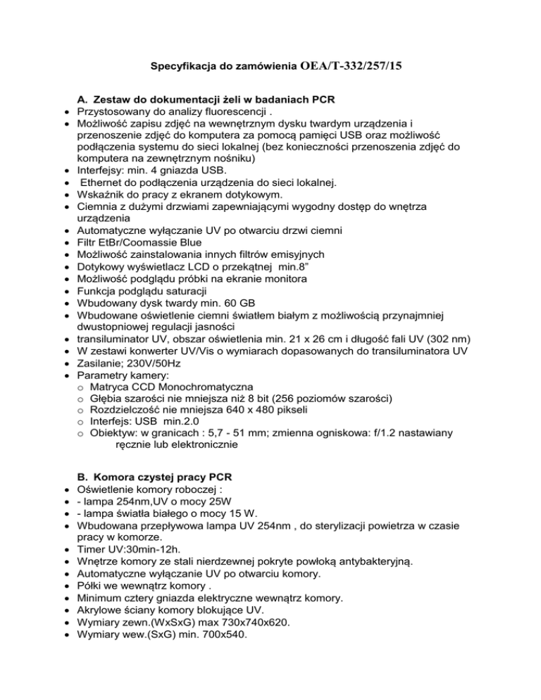 Specyfikacja do zamówienia OEA/T-332/257/15 A. Zestaw do dokumentacji żeli w badaniach PCR Przystosowany do analizy fluorescencji . Możliwość zapisu zdjęć na wewnętrznym dysku twardym urządzenia i przenoszenie zdjęć do komputera za pomocą pamięci USB oraz możliwość podłączenia systemu do sieci lokalnej (bez konieczności przenoszenia zdjęć do komputera na zewnętrznym nośniku) Interfejsy: min. 4 gniazda USB. Ethernet do podłączenia urządzenia do sieci lokalnej. Wskaźnik do pracy z ekranem dotykowym. Ciemnia z dużymi drzwiami zapewniającymi wygodny dostęp do wnętrza urządzenia Automatyczne wyłączanie UV po otwarciu drzwi ciemni Filtr EtBr/Coomassie Blue Możliwość zainstalowania innych filtrów emisyjnych Dotykowy wyświetlacz LCD o przekątnej min.8” Możliwość podglądu próbki na ekranie monitora Funkcja podglądu saturacji Wbudowany dysk twardy min. 60 GB Wbudowane oświetlenie ciemni światłem białym z możliwością przynajmniej dwustopniowej regulacji jasności transiluminator UV, obszar oświetlenia min. 21 x 26 cm i długość fali UV (302 nm) W zestawi konwerter UV/Vis o wymiarach dopasowanych do transiluminatora UV Zasilanie; 230V/50Hz Parametry kamery: o Matryca CCD Monochromatyczna o Głębia szarości nie mniejsza niż 8 bit (256 poziomów szarości) o Rozdzielczość nie mniejsza 640 x 480 pikseli o Interfejs: USB min.2.0 o Obiektyw: w granicach : 5,7 - 51 mm; zmienna ogniskowa: f/1.2 nastawiany ręcznie lub elektronicznie B. Komora czystej pracy PCR Oświetlenie komory roboczej : - lampa 254nm,UV o mocy 25W - lampa światła białego o mocy 15 W. Wbudowana przepływowa lampa UV 254nm , do sterylizacji powietrza w czasie pracy w komorze. Timer UV:30min-12h. Wnętrze komory ze stali nierdzewnej pokryte powłoką antybakteryjną. Automatyczne wyłączanie UV po otwarciu komory. Półki we wewnątrz komory . Minimum cztery gniazda elektryczne wewnątrz komory. Akrylowe ściany komory blokujące UV. Wymiary zewn.(WxSxG) max 730x740x620. Wymiary wew.(SxG) min. 700x540. C. Termostat z wymiennymi blokami Wyświetlacz ciekłokrystaliczny temperatury i czasu Zakres termostatowania: od 25oC (± 2°C) poniżej temperatury otoczenia do maks. 250°C Regulowany zakres temperatury: od 1°C do 100°C Dokładność utrzymywania temperatury: 0,1oC Maksymalna szybkość grzania: Do 100oC ok. 15 minut Do 200oC ok. 30 minut Kontrola elektroniczna (mikroprocesorowa) Sterowanie z klawiatury membranowej Wyświetlacz ciekłokrystaliczny temperatury i czasu Akustyczny alarm timera Dioda sygnalizująca pracę aparatu Moc grzewcza: maks. 750 W Zasilanie: 220 – 240 V, 50 - 60Hz