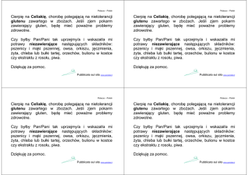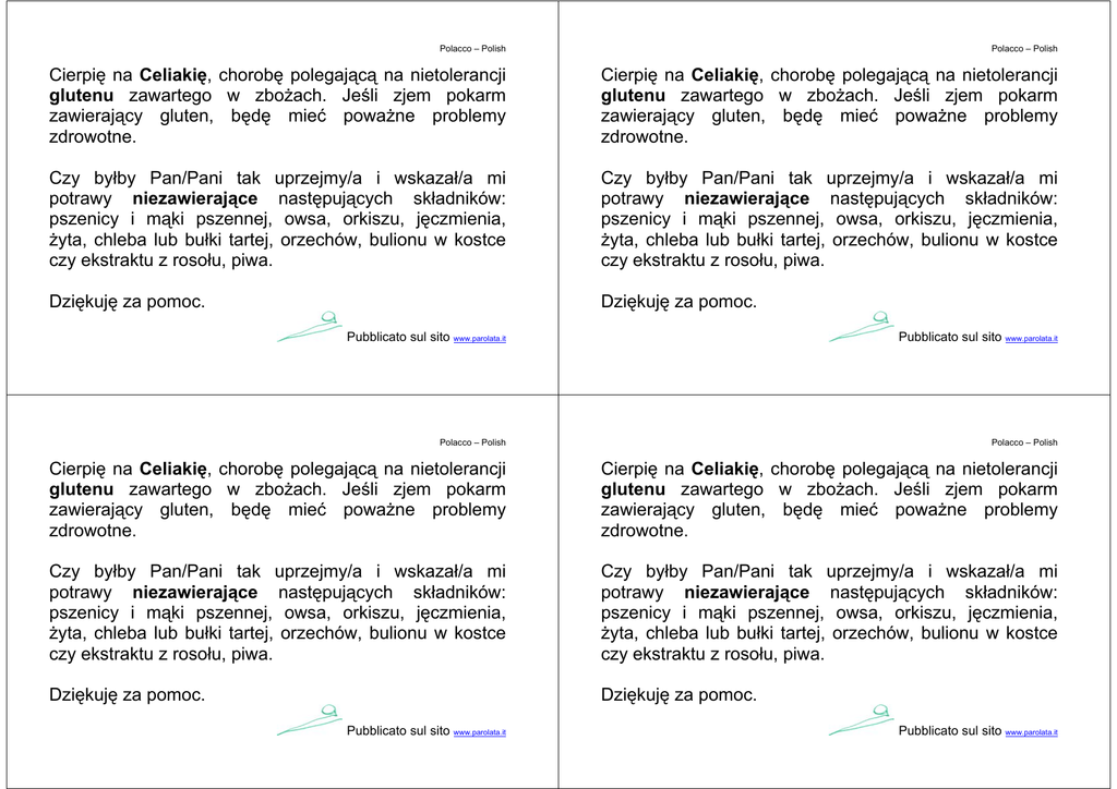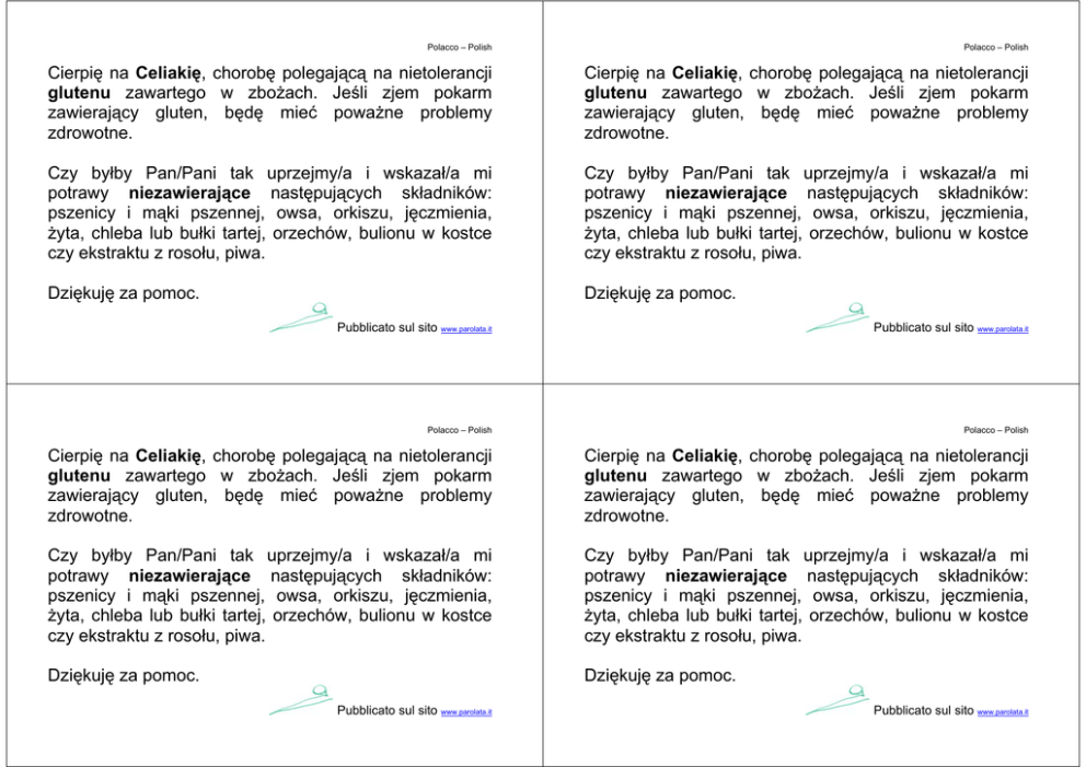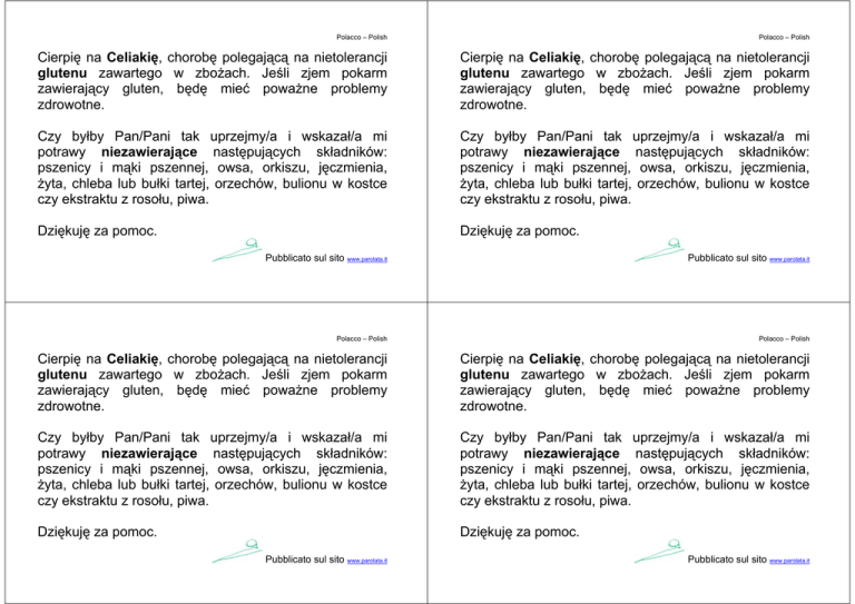 Polacco – Polish Polacco – Polish Cierpię na Celiakię, chorobę polegającą na nietolerancji glutenu zawartego w zbożach. Jeśli zjem pokarm zawierający gluten, będę mieć poważne problemy zdrowotne. Cierpię na Celiakię, chorobę polegającą na nietolerancji glutenu zawartego w zbożach. Jeśli zjem pokarm zawierający gluten, będę mieć poważne problemy zdrowotne. Czy byłby Pan/Pani tak uprzejmy/a i wskazał/a mi potrawy niezawierające następujących składników: pszenicy i mąki pszennej, owsa, orkiszu, jęczmienia, żyta, chleba lub bułki tartej, orzechów, bulionu w kostce czy ekstraktu z rosołu, piwa. Czy byłby Pan/Pani tak uprzejmy/a i wskazał/a mi potrawy niezawierające następujących składników: pszenicy i mąki pszennej, owsa, orkiszu, jęczmienia, żyta, chleba lub bułki tartej, orzechów, bulionu w kostce czy ekstraktu z rosołu, piwa. Dziękuję za pomoc. Dziękuję za pomoc. Pubblicato sul sito www.parolata.it Pubblicato sul sito www.parolata.it Polacco – Polish Polacco – Polish Cierpię na Celiakię, chorobę polegającą na nietolerancji glutenu zawartego w zbożach. Jeśli zjem pokarm zawierający gluten, będę mieć poważne problemy zdrowotne. Cierpię na Celiakię, chorobę polegającą na nietolerancji glutenu zawartego w zbożach. Jeśli zjem pokarm zawierający gluten, będę mieć poważne problemy zdrowotne. Czy byłby Pan/Pani tak uprzejmy/a i wskazał/a mi potrawy niezawierające następujących składników: pszenicy i mąki pszennej, owsa, orkiszu, jęczmienia, żyta, chleba lub bułki tartej, orzechów, bulionu w kostce czy ekstraktu z rosołu, piwa. Czy byłby Pan/Pani tak uprzejmy/a i wskazał/a mi potrawy niezawierające następujących składników: pszenicy i mąki pszennej, owsa, orkiszu, jęczmienia, żyta, chleba lub bułki tartej, orzechów, bulionu w kostce czy ekstraktu z rosołu, piwa. Dziękuję za pomoc. Dziękuję za pomoc. Pubblicato sul sito www.parolata.it Pubblicato sul sito www.parolata.it
