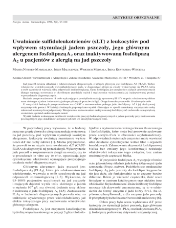 ARTYKU£Y ORYGINALNE97 Alergia Astma Immunologia, 1998, 3(2), 97-100 Uwalnianie sulfidoleukotrienów (sLT) z leukocytów pod wp³ywem stymulacji jadem pszczo³y, jego g³ównym alergenem fosfolipaz¹ A2 oraz inaktywowan¹ fosfolipaz¹ A2 u pacjentów z alergi¹ na jad pszczo³y MARITA NITTNER-MARSZALSKA, JÓZEF MA£OLEPSZY, WOJCIECH MÊDRALA, IRENA KUSTRZEBA-WÓJCICKA Klinika Chorób Wewnêtrznych i Alergologii i Zak³ad Biochemii Akademii Medycznej, 50-417 Wroc³aw, ul. Traugutta 57 Jad pszczó³ zawiera sk³adniki o w³aciwociach alergenowych, z których g³ównym jest fosfolipaza A2 (PLA2). Wobec w³aciwoci cytotoksycznych wielosk³adnikowego jadu, w diagnostyce alergii na owady wykorzystuje siê PLA2, która u osób uczulonych wyzwala siln¹ odpowied¿ immunologiczn¹. Sama fosfolipaza jest enzymem o cechach cytotoksycznych dlatego wymaga stosowania w okrelonym przedziale stê¿eñ i st¹d postulat wykorzystania jej inaktywowanej postaci w procedurach diagnostycznych. Badanie przeprowadzono u 11 osób wykazuj¹cych po u¿¹dleniu reakcjê systemow¹ III i IV stopnia z dodatnim wynikiem testu skórnego z jadem i obecnoci¹ jadospecyficznych przeciwcia³ IgE. Grupê kontroln¹ stanowi³o 10 zdrowych osób. U wszystkich badanych przeprowadzono test CAST z zastosowaniem pe³nego jadu, fosfolipazy A2 i jej nieaktywnej enzymatycznie postaci. W ka¿dej z badanych grup uzyskano wyniki ró¿nicuj¹ce w sposób znamienny statystycznie osoby zdrowe od uczulonych na jad pszczo³y. Wersja testu z zastosowaniem inaktywowanej fosfolipazy A2 cechowa³a siê najwiêksz¹ swoistoci¹ sporód analizowanych metod. Wyniki badania wskazuj¹ na mo¿liwoæ zwiêkszenia precyzji badañ diagnostycznych z jadem pszczo³y przy zastosowaniu posczególnych jego sk³adników alergenowych lub ich zmodyfikowanych form. W poprzedniej pracy wykazano, ¿e w badanej przez nas grupie chorych z alergiczn¹ reakcj¹ systemow¹ na jad pszczo³y, pod wp³ywem stymulacji swoistym alergenem, leukocyty uwalniaj¹ znamiennie wy¿sze iloci sLT ni¿ osoby zdrowe [1]. Mo¿na przypuszczaæ, ¿e pozwoli to na u¿ycie testu uwalniania sLT (CASTELISA) do diagnostyki tej postaci alergii. Wykorzystanie jadu pszczó³ w rozpoznawaniu alergii na owady, czy to w procedurach in vitro czy in vivo, ograniczaj¹ jego cytotoksyczne w³aciwoci wymagaj¹ce precyzyjnego ustalenia stê¿eñ diagnostycznych. G³ównym alergenem jadu pszczó³ jest fosfolipaza A 2 (PLA 2), która jak udokumentowano wielokrotnie, wyzwala u osób uczulonych na jad odpowied immunologiczn¹ [2,3]. Wykazano, ¿e 95-100% pacjentów uczulonych na jad pszczo³y i maj¹cych dodatni wynik testu skórnego z jadem -4 w stê¿eniu 10 g/l, ma równie¿ dodatnie testy skórne z izolowan¹ z jadu fosfolipaz¹ A2 [4,5]. Zastosowanie PLA2 w badaniach diagnostycznych pozwala wiêc na unikniêcie wywieranego przez wielosk³adnikowy jad efektu toksycznego przy zachowaniu w³aciwoci g³ównego alergenu. Fosfolipaza A2 jest enzymem katalizuj¹cym hydrolizê wi¹zania estrowego w pozycji 2-glicerolofosfo- lipidów z wytworzeniem wolnego kwasu t³uszczowego i lizofosfolipidu, który mo¿e byæ ponownie acylowany przez acetylo-CoA w obecnoci acylotransferazy. W odpowiednich stê¿eniach enzym ten mo¿e wywieraæ silne dzia³anie cytotoksyczne wobec b³on i organelli komórkowych. Zahamowanie aktywnoci fosfolipazowej bia³ka bez zmiany jego konformacji redukuje w³aciwoci toksyczne tego zwi¹zku, bez zmian strukturalnych cz¹steczki bia³ka. W przyrodzie fosfolipaza A2 wystêpuje równie¿ m.in. jako nielotny skladnik jadu kobry (Naja naja) i jadu szerszenia (Vespa crabro). Podobieñstwo strukturalne fosfolipazy A2 jadu pszczo³y do fosfolipaz krêgowców nie jest du¿e, ale funkcjonalnie s¹ to enzymy bardzo zbli¿one. Ró¿ni je wielkoæ cz¹steczki, iloæ reszt histydyny w centrum katalitycznym oraz niektóre inne w³aciwoci fizykochemiczne. Znane inhibitory fosfolipaz znosz¹ce ich aktywnoæ enzymatyczn¹, s¹ to w odniesieniu do formy enzymu z jadu kobry Sr+2, Ba+2, p-bromo-phenylbromek, a dla enzymu jadu pszczo³y D-phosphatydylocholina oraz bezwodnik maleinowy [6]. Celem pracy by³o ocena wydzielania sLT przez leukocyty po stymulacji jadem pszczo³y, jego g³ównym sk³adnikiem alergenowym - PLA2 oraz inaktywowan¹ PLA2 tj. fosfolipaz¹ pozbawion¹ aktywnoci enzymatycznej. 98 Alergia Astma Immunologia, 1998, 3(2), 97-100 MATERIA£ I METODY Badanie przeprowadzono w grupie 11 osób, 6 kobiet i 5 mê¿czyzn, w wieku od 18 do 40 lat, uczulonych na jad pszczo³y. Ka¿da z osób badanych mia³a wywiad reakcji systemowej III lub IV stopnia na jad pszczo³y potwierdzony dodatnim wynikiem testu skórnego z jadem -4 w ste¿eniu 10 g/l. Osoby badane nie by³y ¿¹dlone w okresie 6 miesiêcy poprzedzaj¹cych badanie. Grupê kontroln¹ stanowi³o 10 osób bez historii odczynów alergicznych po u¿¹dleniach przez owady i z ujemnymi testami skórnymi z jadem w stê¿eniu 10 3 g/l. Metoda Procedura wykonania testu CAST-ELISA Test stymulacji komórek (CAST) Krew ¿yln¹ pobierano na 0,2 M wersenian sodowy w stosunku objêtociowym 20:1. Nastêpnie mieszano j¹ z dekstranem bêd¹cym sk³adnikiem zestawów firmy Buhlmann Laboratories A.G. w stosunku objêtociowym 4:1 i inkubowano w temperaturze pokojowej przez 90 minut. W kolejnym etapie zbierano górn¹ fazê i odwirowywano przez 15 minut przy 130 g 0 w temperaturze 20 C. Po odwirowaniu odlewano supernatant, a do osadów dodawano bufor stymulacyjny, zawieraj¹cy interleukinê 3 w iloci dok³adnie tej samej, ile wynosi³a objêtoæ krwi. Do oznaczonych probówek dodawano 200 mikrolitrowe porcje zawiesiny komórkowej oraz swoisty alergen w stê¿eniu 100 ng/ml w objêtoci 50 mikrolitrów, a do probówek oznaczonych jako spontaniczne generowanie leukotrienów dodawano 50 mikrolitrów buforu stymulacyjnego. Alergen rozcieñczano w dniu badania w buforze stymulacyjnym tak aby koñcowe jego stê¿enie wynosi³o 100 ng/ml. 0 Próbki inkubowano w temperaturze 37