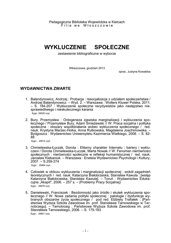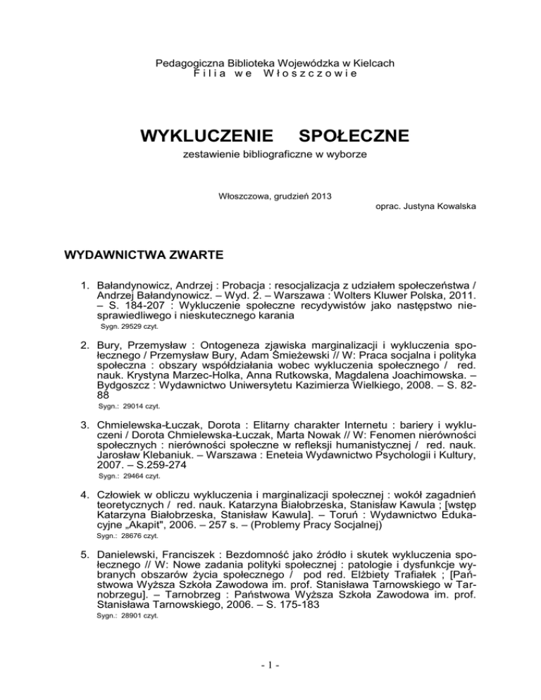 Pedagogiczna Biblioteka Wojewódzka w Kielcach Filia we Włoszczowie WYKLUCZENIE SPOŁECZNE zestawienie bibliograficzne w wyborze Włoszczowa, grudzień 2013 oprac. Justyna Kowalska WYDAWNICTWA ZWARTE 1. Bałandynowicz, Andrzej : Probacja : resocjalizacja z udziałem społeczeństwa / Andrzej Bałandynowicz. – Wyd. 2. – Warszawa : Wolters Kluwer Polska, 2011. – S. 184-207 : Wykluczenie społeczne recydywistów jako następstwo niesprawiedliwego i nieskutecznego karania Sygn. 29529 czyt. 2. Bury, Przemysław : Ontogeneza zjawiska marginalizacji i wykluczenia społecznego / Przemysław Bury, Adam Śmieżewski // W: Praca socjalna i polityka społeczna : obszary współdziałania wobec wykluczenia społecznego / red. nauk. Krystyna Marzec-Holka, Anna Rutkowska, Magdalena Joachimowska. – Bydgoszcz : Wydawnictwo Uniwersytetu Kazimierza Wielkiego, 2008. – S. 8288 Sygn.: 29014 czyt. 3. Chmielewska-Łuczak, Dorota : Elitarny charakter Internetu : bariery i wykluczeni / Dorota Chmielewska-Łuczak, Marta Nowak // W: Fenomen nierówności społecznych : nierówności społeczne w refleksji humanistycznej / red. nauk. Jarosław Klebaniuk. – Warszawa : Eneteia Wydawnictwo Psychologii i Kultury, 2007. – S.259-274 Sygn.: 29464 czyt. 4. Człowiek w obliczu wykluczenia i marginalizacji społecznej : wokół zagadnień teoretycznych / red. nauk. Katarzyna Białobrzeska, Stanisław Kawula ; [wstęp Katarzyna Białobrzeska, Stanisław Kawula]. – Toruń : Wydawnictwo Edukacyjne „Akapit", 2006. – 257 s. – (Problemy Pracy Socjalnej) Sygn.: 28676 czyt. 5. Danielewski, Franciszek : Bezdomność jako źródło i skutek wykluczenia społecznego // W: Nowe zadania polityki społecznej : patologie i dysfunkcje wybranych obszarów życia społecznego / pod red. Elżbiety Trafiałek ; [Państwowa Wyższa Szkoła Zawodowa im. prof. Stanisława Tarnowskiego w Tarnobrzegu]. – Tarnobrzeg : Państwowa Wyższa Szkoła Zawodowa im. prof. Stanisława Tarnowskiego, 2006. – S. 175-183 Sygn.: 28901 czyt. -1- 6. Dąbrowska, Anna : Zagrożenie marginalizacją i wykluczeniem w zespole klasowym dzieci z uszkodzeniem słuchu // W: Praca socjalna i polityka społeczna : obszary współdziałania wobec wykluczenia społecznego / red. nauk. Krystyna Marzec-Holka, Anna Rutkowska, Magdalena Joachimowska. – Bydgoszcz : Wydawnictwo Uniwersytetu Kazimierza Wielkiego, 2008. – S. 242248 Sygn.: 29014 czyt. 7. Dobrołowicz, Justyna : Internet nowym źródłem marginalizacji i wykluczenia // W: Współczesne problemy pedagogiki społecznej i pracy socjalnej : wybrane zagadnienia w świetle analiz i badań / pod red. Bożeny Matyjas. – Kielce : Wszechnica Świętokrzyska, 2007. – S. 37-42 Sygn. 29034 czyt. 8. Faliszek, Krystyna : Wykluczenie w małej społeczności lokalnej – wyzwania dla polityki społecznej i pracy socjalnej // W: Praca socjalna i polityka społeczna : obszary współdziałania wobec wykluczenia społecznego / red. nauk. Krystyna Marzec-Holka, Anna Rutkowska, Magdalena Joachimowska. – Bydgoszcz : Wydawnictwo Uniwersytetu Kazimierza Wielkiego, 2008. – S. 317323 Sygn.: 29014 9. Giddens, Anthony : Socjologia / Anthony Giddens ; tł. Alina Szulżycka. – Wyd. 2 uzup. – Warszawa : Wydaw. Naukowe PWN, 2005. – S. 346-353 : Wykluczenie społeczne Sygn.: 27452 czyt. 10. Guzy-Steinke, Halina : Animacja społeczno-kulturalna jako metoda przeciwdziałająca marginalizacji w środowisku lokalnym // W: Praca socjalna i polityka społeczna : obszary współdziałania wobec wykluczenia społecznego / red. nauk. Krystyna Marzec-Holka, Anna Rutkowska, Magdalena Joachimowska. – Bydgoszcz : Wydawnictwo Uniwersytetu Kazimierza Wielkiego, 2008. – S. 242-248 Sygn.: 29014 czyt. 11. Kamiński, Tadeusz : O pożytku z wykluczonych – parę prowokacyjnych uwag politologa // W: Praca socjalna i polityka społeczna : obszary współdziałania wobec wykluczenia społecznego / red. nauk. Krystyna Marzec-Holka, Anna Rutkowska, Magdalena Joachimowska. – Bydgoszcz : Wydawnictwo Uniwersytetu Kazimierza Wielkiego, 2008. – S. 298-306 Sygn.: 29014 czyt. 12. Kantowicz, Ewa : Teorie pracy socjalnej wobec społecznego wykluczenia // W: Praca socjalna i polityka społeczna : obszary współdziałania wobec wykluczenia społecznego / red. nauk. Krystyna Marzec-Holka, Anna Rutkowska, Magdalena Joachimowska. – Bydgoszcz : Wydawnictwo Uniwersytetu Kazimierza Wielkiego, 2008. – S. 289-297 Sygn.: 29014 czyt. 13. Karwacki, Arkadiusz : Wspólne problemy, wspólne rozwiązania? : sport jako przestrzeń walki z wykluczeniem społecznym w Wielkiej Brytanii w kontekście wyzwań dla Polski // W: Aktywna polityka społeczna z perspektywy Europy socjalnej / red. nauk. Krzysztof Piątek, Arkadiusz Karwacki. – Toruń : Wydawnictwo Edukacyjne „Akapit", 2007. – S. 327-352 Sygn.: 28668 czyt. -2- 14. Kostyło, Piotr : Wykluczanie jako problem filozofii edukacji : komentarz do badań empirycznych / Piotr Kostyło. – Kraków : Oficyna Wydawnicza „Impuls", 2008. – 224 s. Sygn.: 28745 czyt. 15. Królikowska, Sabina : Przeciwdziałanie wykluczeniu społecznemu poznańskich senioróww badaniach studentów // W: Praca socjalna i polityka społeczna : obszary współdziałania wobec wykluczenia społecznego / red. nauk. Krystyna Marzec-Holka, Anna Rutkowska, Magdalena Joachimowska. – Bydgoszcz : Wydawnictwo Uniwersytetu Kazimierza Wielkiego, 2008. – S. 172179 Sygn.: 29014 czyt. 16. Leśniak- Berek, Ewa : Reforma edukacji – możliwości i bariery edukacyjne z perspektywy osób zagrożonych wykluczeniem społecznym // W: Praca socjalna i polityka społeczna : obszary współdziałania wobec wykluczenia społecznego / red. nauk. Krystyna Marzec-Holka, Anna Rutkowska, Magdalena Joachimowska. – Bydgoszcz : Wydawnictwo Uniwersytetu Kazimierza Wielkiego, 2008. – S. 127-135 Sygn.: 29014 czyt. 17. Marginalizacja : w problematyce pedagogiki społecznej i praktyce pracy socjalnej / pod red. Krystyny Marzec-Holki ; przy współprac