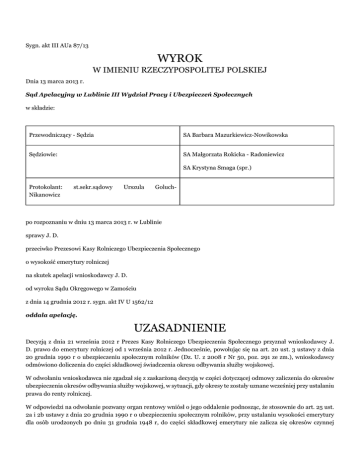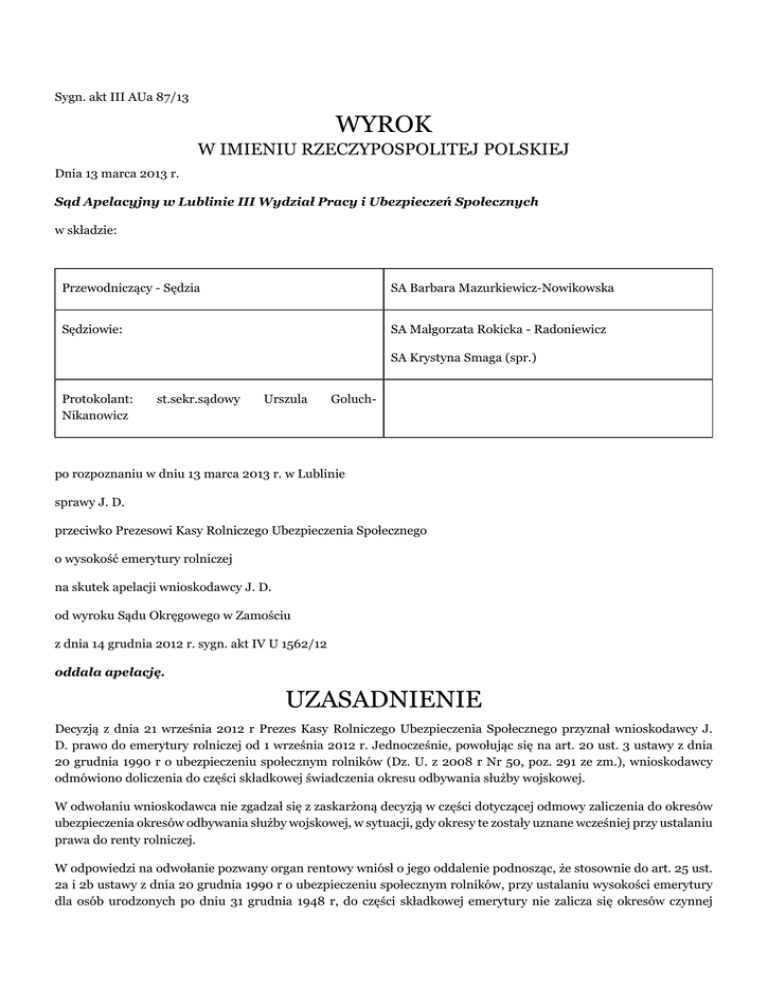 Sygn. akt III AUa 87/13 WYROK W IMIENIU RZECZYPOSPOLITEJ POLSKIEJ Dnia 13 marca 2013 r. Sąd Apelacyjny w Lublinie III Wydział Pracy i Ubezpieczeń Społecznych w składzie: Przewodniczący - Sędzia SA Barbara Mazurkiewicz-Nowikowska Sędziowie: SA Małgorzata Rokicka - Radoniewicz SA Krystyna Smaga (spr.) Protokolant: Nikanowicz st.sekr.sądowy Urszula Goluch- po rozpoznaniu w dniu 13 marca 2013 r. w Lublinie sprawy J. D. przeciwko Prezesowi Kasy Rolniczego Ubezpieczenia Społecznego o wysokość emerytury rolniczej na skutek apelacji wnioskodawcy J. D. od wyroku Sądu Okręgowego w Zamościu z dnia 14 grudnia 2012 r. sygn. akt IV U 1562/12 oddala apelację. UZASADNIENIE Decyzją z dnia 21 września 2012 r Prezes Kasy Rolniczego Ubezpieczenia Społecznego przyznał wnioskodawcy J. D. prawo do emerytury rolniczej od 1 września 2012 r. Jednocześnie, powołując się na art. 20 ust. 3 ustawy z dnia 20 grudnia 1990 r o ubezpieczeniu społecznym rolników (Dz. U. z 2008 r Nr 50, poz. 291 ze zm.), wnioskodawcy odmówiono doliczenia do części składkowej świadczenia okresu odbywania służby wojskowej. W odwołaniu wnioskodawca nie zgadzał się z zaskarżoną decyzją w części dotyczącej odmowy zaliczenia do okresów ubezpieczenia okresów odbywania służby wojskowej, w sytuacji, gdy okresy te zostały uznane wcześniej przy ustalaniu prawa do renty rolniczej. W odpowiedzi na odwołanie pozwany organ rentowy wniósł o jego oddalenie podnosząc, że stosownie do art. 25 ust. 2a i 2b ustawy z dnia 20 grudnia 1990 r o ubezpieczeniu społecznym rolników, przy ustalaniu wysokości emerytury dla osób urodzonych po dniu 31 grudnia 1948 r, do części składkowej emerytury nie zalicza się okresów czynnej służby wojskowej w Wojsku Polskim lub okresów jej równorzędnych albo okresów zastępczych form tej służby, przypadających przed dniem 1 stycznia 1999 r. Dlatego brak podstaw by wnioskodawcy, urodzonemu (...), zaliczyć do części składkowej emerytury okres odbywania zasadniczej służby wojskowej od 25 października 1971 r do 17 października 1973 r i okres czynnej służby wojskowej odbytej podczas stanu wojennego od 17 grudnia 1981 r do 29 marca 1982 r. Sąd Okręgowy w Zamościu wyrokiem z dnia 14 grudnia 2012 r oddalił odwołanie na podstawie następujących ustaleń faktycznych i ich oceny prawnej. Wnioskodawca J. D., urodzony (...), od 1 kwietnia 2004 r do 31 grudnia 2011 r pobierał rentę rolniczą. Z decyzji z dnia 12 maja 2004 r, przyznającej wnioskodawcy prawo do renty wynika, że część składkowa renty wyniosła 38,41% emerytury podstawowej, a do jej ustalenia organ rentowy przyjął między innymi 2,27 lat podlegania innemu ubezpieczeniu społecznemu przypadającemu w okresach od 25 października 1971 r do 17 października 1973 r i od 17 grudnia 1981 r do 29 marca 1982 r. Na wniosek z dnia 5 września 2012 r, decyzją z dnia 21 września 2012 r, organ rentowy przyznał wnioskodawcy prawo do emerytury rolniczej od 1 września 2012 r. Część składkową emerytury organ rentowy ustalił w wysokości 37,75% emerytury podstawowej. Do jej ustalenia przyjęto: 5,21 lat opłacania składki na Fundusz Emerytalny (...) przypadających w okresie od 1 lipca 1977 r do 31 grudnia 1982 r, po 1% emerytury podstawowej za każdy rok, 18,54 lat opłacania składki na Fundusz Ubezpieczenia Społecznego (...) w okresie od 1 stycznia 1983 r do 31 grudnia 1990 r, łącznie po 1% emerytury podstawowej za każdy rok i 14 lat podlegania ubezpieczeniu emerytalno - rentowemu po dniu 31 grudnia 1990 r, po 1% emerytury podstawowej za każdy rok Część uzupełniającą emerytury ustalono w wysokości 91,50 % emerytury podstawowej. Jednocześnie w punkcie III. decyzji organ rentowy wskazał, że do okresów ubezpieczenia nie doliczył okresów odbywania służby wojskowej zgodnie z art. 20 ust. 3 ustawy z dnia 20 grudnia 1990 r o ubezpieczeniu społecznym rolników. Na rozprawie przed Sądem Okręgowym wnioskodawca oświadczył, że nie zgadza się z zaskarżoną decyzją jedynie w zakresie, w jakim nie uwzględniono mu przy ustalaniu wysokości emerytury okresów odbywania służby wojskowej, tym bardziej, że były one uznane przy ustalaniu wysokości renty. Sąd Okręgowy zważył, że odwołanie nie zasługuje na uwzględnienie. Okoliczności faktyczne sprawy nie były sporne. Spór sprowadzał się do interpretacji przepisów ustawy z dnia 20 grudnia 1990 r o ubezpieczeniu społecznym rolników (tekst jedn. Dz. U. z 2008 r Nr 50, poz. 291 ze zm.) w części regulującej zasady ustalania prawa do emerytury rolniczej i jej wysokości, po zmianach wprowadzonych, z dniem 8 stycznia 2009 r ustawą z dnia 21 listopada 2008 r o emeryturach kapitałowych (Dz. U. Nr 228, poz. 1507). Sąd wskazał, że zgodnie z art. 19 ust. 1 ustawy o ubezpieczeniu społecznym rolników, emerytura rolnicza przysługuje ubezpieczonemu mężczyźnie, który spełnia łącznie następujące warunki: osiągnął wiek emerytalny 65 lat i podlegał ubezpieczeniu emerytalno - rentowemu przez co najmniej 25 lat. Emerytura rolnicza przysługuje także rolnikowi, który osiągnął wiek 60 lat, jeżeli podlegał ubezpieczeniu emerytalno - rentowemu przez co najmniej 30 lat i zaprzestał działalności rolniczej (art. 19 ust. 2). W myśl art. 20 ust. 1 ustawy, do okresów ubezpieczenia wymaganych zgodnie z przepisem art. 19, zalicza się okresy: 1) podlegania ubezpieczeniu społecznemu rolników indywidualnych i członków ich rodzin w latach 1983 - 1990; 2) prowadzenia gospodarstwa rolnego lub pracy w gospodarstwie rolnym, po ukończeniu 16 roku życia, przed dniem 1 stycznia 1983 r oraz 3) od których zależy prawo do emerytury zgodnie z przepisami emerytalnymi. Zgodnie z art. 20 ust. 3, dodanym przez ustawę o emeryturach kapitałowych, obowiązującym od 8 stycznia 2009 r, tych ostatnich okresów nie zalicza się osobom urodzonym po dniu 31 grudnia 1948 r. Stosownie do art. 24 ustawy o ubezpieczeniu społecznym