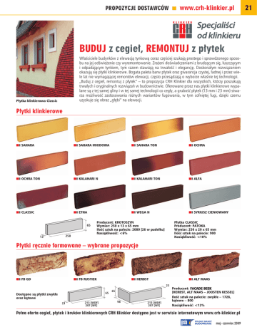 PROPOZYCJE DOSTAWCÓW O www.crh-klinkier.pl BUDUJ z cegieł, REMONTUJ z płytek Właściciele budynków z elewacją tynkową coraz częściej szukają prostego i sprawdzonego sposobu na jej odświeżenie czy wyremontowanie. Zrażeni doświadczeniami z brudzącym się, łuszczącym i odpadającym tynkiem, tym razem stawiają na trwałość i elegancję. Doskonałym rozwiązaniem okazują się płytki klinkierowe. Bogata paleta barw płytek oraz gwarancja czystej, ładnej i przez wiele lat nie wymagającej remontów elewacji, często przesądzają o wyborze właśnie tej technologii. „Buduj z cegieł, remontuj z płytek” – to propozycja CRH Klinkier dla wszystkich, którzy poszukują trwałych i oryginalnych rozwiązań w budownictwie. Oferowane przez nas płytki klinkierowe wypalane są z tej samej gliny i w tej samej technologii co cegły, a grubość płytek (13 mm i 23 mm) stwarza możliwość zastosowania różnych wariantów fugowania, w tym cofniętej fugi, dzięki czemu uzyskuje się obraz „głębi” na elewacji. Płytka klinkierowa Classic Płytki klinkierowe IT SAHARA IT SAHARA MIODOWA IT SAHARA TON IT OCHRA IT OCHRA TON IT KALAHARI N IT KALAHARI TON IT ALFA IT CLASSIC IT ETNA IT WEGA N IT SYRIUSZ CIENIOWANY 65 250 13 Producent: KROTOSZYN Wymiar: 250 x 13 x 65 mm Ilość sztuk na palecie: 2080 [26 w pudełku] Nasiąkliwość: <6% Płytka CLASSIC Producent: PATOKA Wymiar: 250 x 20 x 65 mm Ilość sztuk na palecie: 900 Nasiąkliwość: <10% Płytki ręcznie formowane – wybrane propozycje IT FB GD IT FB RUSTIEK IT HERBST IT ALT MAAS 23 65 Dostępne są płytki zwykłe oraz kątowe 23 213 [WDF] 207 [WF] 65 98 213 [WDF] 207 [WF] Producent: FACADE BEEK [HERBST, ALT MAAS – JOOSTEN KESSEL] Ilość sztuk na palecie: zwykłe – 1728, kątowe – 800 Nasiąkliwość: <12% Pełna oferta cegieł, płytek i bruków klinkierowych CRH Klinkier dostępna jest w serwisie internetowym www.crh-klinkier.pl maj–czerwiec 2009 21