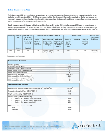 Szkło kwarcowe JGS2 Szkło kwarcowe JGS2 jest produktem powstającym w wyniku topienia naturalnie występującego kwarcu (piasku lub krysz‐ tałów) o wysokiej czystości SiO2 = 99,9%, w procesie obróbki płomieniowej. Materiał ten posiada unikalną kombinację ter‐ micznych, optycznych i mechanicznych własności, które sprawiają, że doskonale nadaje się on do wykorzystania w szerokim spektrum zastosowań przemysłowych i naukowych. Dzięki stosunkowo niskiej zawartości pierwiastków śladowych i jonów OH‐, szkło kwarcowe JGS2 dobrze sprawdza się w zastosowaniach optycznych w zakresie: od UV‐C 220‐280 nm do bliskiej podczerwieni. Niska zawartość zanieczyszczeń me‐ talami alkalicznymi sprawia, że materiał ten nadaje się do stosowania w warunkach wysokich temperatur powyżej 10000 C. Materiał Zawartość Odkształcenie Zawartość pęcherzyków powietrza OH‐ resztkowe (z wył. 10% Liczba Maks. średnica Całkowita powierzchni pęcherzy‐ pęcherzyków powierzchnia obrzeży) ków wg [mm] w masie pęcherzyków w 100 cm3 DIN 58927 szkła [kg] [mm2] [ppm] [nm/cm] JGS2 150 4‐6 2‐3 1/1∙0,63 ≤ 6 kg 0,5 1/2∙1,0 > 6 kg Jednorodność Smugi wg DIN ISO 10110 (na gr. 30 mm) b.d. Smużenie Zmiany w indeksie refrakcji ∆n b.d. b.d. Fluorescencja (HG‐lamp@ λ= 254nm) fioletowo‐ niebieski Parametry techniczne Własności mechaniczne Gęstość [g/cm3] Twardość wg skali Mohs’a Twardość Knoop’a (KHN) [N/mm2] Moduł elastyczności Younga(E)[GPa] Moduł sprężystości (G) [GPa] Współczynnik Poisson’a Wytrzymałość na ściskanie [N/mm2] Wytrzymałość na rozciąganie [N/mm2] Wytrzymałość na zginanie [N/mm2] 2,20 5,5 ~ 6,5 570 72 31 0,14 ~ 0,17 1100 48 67 Własności temperaturowe Współczynnik liniowej rozszerzalności termicznej [K‐1] (200‐3200 C) Przewodność cieplna [W/m ∙ K] (200‐3200 C) 0 5,5 ∙ 10‐7 1,40 0 Ciepło właściwe [J/kg ∙ K] (20 ‐350 C) 670 Lepkość (dPa ∙ s) i temperatura [0 C]: dla lgη = 14.5 (dolna granica odprężania) dla lgη = 13.0 (górna granica odprężania) dla lgη = 7.6 (punkt mięknięcia) Maksymalna temperatura pracy [0 C]: ‐ stała ‐ chwilowa 1120 1215 1683 1100 1250 1 Własności elektryczne 1 ∙ 1018 1 ∙ 1010 6,3 ∙ 106 1,3 ∙ 105 400 0,0001 3,7 ~ 3,9 Oporność elektryczna [Ω ∙ m]: 0 przy T = 20 C przy T = 4000 C 0 przy T = 800 C 0 przy T = 1200 C Wytrzymałość dielektryczna w [kV/cm] (grubość ≥ 5 mm; T=200 C) Kąt strat dielektrycznych [tg δ] (1 MHz): Stała dielektryczna [ε] przy (T=200 C; 1 MHz) Typowa zawartość pierwiastków śladowych [ppm] Al Ca Co Cu Fe K Li Mg Na Ti Całkowite Indeks refrakcji [n] (200 C; 1 bar) 27 0,4 0,1 0,04 0,1 1,0 1,3 0,04 1,5 0,5 20‐40 Wartości transmitancji dla próbki o grubości 2,0 mm λ [μm] 0,200 0,220 0,250 0,300 0,320 0,360 0,400 0,450 0,488 0,500 0,550 0,588 0,600 0,633 0,650 0,700 0,750 0,800 0,850 0,900 n 1,55051 1,52845 1,50745 1,48779 1,48274 1,47529 1,47012 1,46557 1,46302 1,46233 1,46008 1,45860 1,45804 1,45702 1,45653 1,45529 1,45424 1,45332 1,45250 1,45175 λ [μm] 1,000 1,064 1,100 1,200 1,300 1,500 1,600 1,700 1,800 1,900 2,000 2,200 2,400 2,600 2,800 3,000 3,200 3,370 3,507 3,707 n 1,45042 1,44962 1,44920 1,44805 1,44692 1,44462 1,44342 1,44217 1,44087 1,43951 1,43809 1,43501 1,43163 1,42789 1,42377 1,41925 1,41427 1,40990 1,40566 1,39936 Przedstawione informacje zostały opracowane na podstawie danych technicznych producenta i badań własnych oferenta. Zastrzegamy sobie prawo do zmian, jak i ewentualnych nieścisłości w treści. 2