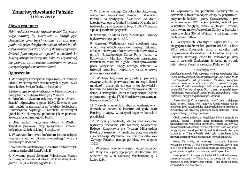 Zmartwychwstanie Pańskie 31 Marca 2013 r. Słowo wstępne: Pełni radości i wesela stajemy wokół Chrystuso-‐ wego ołtarza, by świętować w liturgii Jego chwalebne zmartwychwstanie. To szczytowy punkt nie tylko dziejów zbawienia człowieka, ale całego wszechświata. Chrystus, skruszywszy więzy śmierci, jako zwycięzca wyszedł z otchłani. W świętej liturgii możemy nie tylko to wspominać, ale poprzez sprawowane misterium w sposób rzeczywisty być tego uczestnikami. Ogłoszenia: 1. W dzisiejszą Uroczystość zapraszamy do wzięcia udziału w Nieszporach świątecznych o godz. 16.30, które kończą Święte Triduum Paschalne. 2. Jutro drugie święto wielkanocne. Msze św. będą w porządku niedzielnym. Uroczystą Mszę św. za Parafian z udziałem orkiestry Kopalni „Murcki-‐ Staszic” odprawimy o godz. 10.30. Kolekta w tym dniu będzie przeznaczona na Wydział Teologiczny Uniwersytetu Śląskiego i Katolicki Uniwersytet Lubelski. Na Nieszpory, podobnie jak w pierwsze Święto, zapraszamy o godz. 16.30. 3. „Bóg zapłać” wszystkim, którzy w Wielkim Tygodniu pracowali przy sprzątaniu i strojeniu kościoła, służbie kościelnej i liturgicznej. 4. W zakrystii lub przed kościołem jest do nabycia świąteczny numer „Gościa Niedzielnego” wraz z parafialnym dodatkiem. 5. We wtorek wielkanocny, 2 kwietnia obchodzimy 8 rocznicę śmierci bł. Jana Pawła II. 6. Nowennę przed Świętem Miłosierdzia Bożego będziemy odmawiać od wtorku do końca tygodnia o godz. 15.00, a w sobotę o godz. 16.00. 7. W imieniu naszego Zespołu Charytatywnego serdecznie zapraszamy chorych i starszych Parafian na tradycyjne „Święcone” do domu katechetycznego w środę, 3 kwietnia. Od godz. 9.30 będzie okazja do Spowiedzi św., o 10.00 -‐ Msza św., a po niej spotkanie przy stole. 8. Nowenna do Matki Bożej Nieustającej Pomocy będzie w środę o godz. 16.30. 9. Konwent Wielkanocny czyli spotkanie przy ołtarzu wszystkich kapłanów naszego dekanatu odbędzie się w tym roku w czwartek, 4 kwietnia w parafii Najświętszego Serca Pana Jezusa w Katowicach -‐ Murckach Serdecznie zapraszamy Parafian na Mszę św. o godz. 19.00 sprawowaną przez wszystkich księży naszego dekanatu w intencji zmarłych kapłanów oraz o nowe powołania kapłańskie. 10. W tym tygodniu przypadają: pierwszy czwartek, piątek i pierwsza sobota miesiąca. Dzieci, młodzież i dorosłych zachęcamy do Spowiedzi i Komunii św. Msza św. pierwszopiątkowa w intencji dzieci, a szczególnie dzieci z klasy drugiej będzie odprawiona o godz. 17.00. Młodzież zapraszamy na Mszę św. o godz. 18.30. 11. Chorych i starszych Parafian odwiedzimy w ich domach w sobotę, 6 kwietnia od godz. 8.30. Prosimy o zapisy w zakrystii bądź w kancelarii parafialnej. 12. Przyszłą niedzielę, drugą wielkanocną, będziemy obchodzić jako Niedzielę Miłosierdzia Bożego. Rozpoczyna się Tydzień Miłosierdzia. Kolektę przeznaczymy na cele charytatywne parafii i archidiecezji. Wymiana Tajemnic dla członków „Żywego Różańca nastąpi po Mszy św. o godz. 10.30. 13. Wiosenne liczenie wiernych uczestniczących we Mszy św. i przystępujących do Komunii św. odbędzie się w II Niedzielę Wielkanocną tj. 7 kwietnia br. 14. Zapraszamy na parafialną pielgrzymkę w czwartek 11 kwietnia do Jemielnicy. W programie: -‐ pocysterski kościół -‐ perły Opolszczyzny -‐ p.w. Wniebowzięcia NMP i św. Jakuba, kościół p.w. Wszystkich Świętych, zamek w Starych Tarnowi-‐ cach, zwany małym Wawelem. Zapisy w Kancelarii wraz z wpłatą 35,-‐ zł. Wyjazd z parkingu przed probostwem o 8,oo. 15. Wszystkich chętnych zapraszamy na pielgrzymkę do Ziemi św. i Jordanii od 2 do 11 lipca 2013 roku. Zgłoszenia wraz z zaliczką będą przyjmowane do niedzieli 14 kwietnia włącznie. Bliższych informacji udziela ks. Proboszcz po Mszy św. w zakrystii. Znajdziemy je także na stronie internetowej Parafii w zakładce „Pielgrzymki”. Anioł zaś przemówił do niewiast: «Wy się nie bójcie! Gdyż wiem, że szukacie Jezusa Ukrzyżowanego. Nie ma Go tu, bo zmartwychwstał, jak powiedział. Chodźcie, zobaczcie miejsce, gdzie leżał. A idźcie szybko i powiedzcie Jego uczniom: Powstał z martwych i oto udaje się przed wami do Galilei. Tam Go ujrzycie. Oto, co wam powiedziałem». Pośpiesznie więc oddaliły się od grobu, z bojaźnią i wielką radością, i biegły oznajmić to Jego uczniom. Panie, dziękuję Ci za wspaniałą radość dnia dzisiejszego, którą co roku dajesz tym, którzy w Ciebie wierzą, tak jak niespełna 2000 lat temu dałeś ufającym kobietom. Dziękuję za zwycięstwo nad śmiercią, grzechem, złem, słabością – które przynosi Twoje zmartwychwstanie. Obok wielkiej radości, u Magdaleny i Marii pojawia się jednak… bojaźń – bojaźń Boża, misterium tremendum, zadziwienie nad wielkością tajemnicy… Proszę Cię, aby owa radość zmartwychwstania i ów respekt przed Bożą wielkością mogły się we mnie dopełniać. By radość dodawała otuchy w kroczeniu za Tobą, a bojaźń Boża była strażnikiem, który zatrzymuje mnie przed popełnianiem nowych grzechów. Proszę Cię o siłę do radosnego zanoszenia każdemu wspaniałej nowiny o Twoim zmartwychwstaniu. Abym mógł biec z nią zwłaszcza do swoich bliskich, jak kobiety biegły – gnane jak na skrzydłach – obwieścić radość apostołom. Panie, pozwól mi cieszyć się kiedyś także radością mojego zmartwychwstania w Tobie. A tu na ziemi, daj mi mocną nadzieję, że tych, którzy Ciebie miłują i Tobie służą, na końcu czeka radość wieczna. Amen. Porządek nabożeństw 20.00 Liturgia Wigilii Paschalnej, Uroczysta Rezurekcja ZMARTWYCHWSTANIE PAŃSKIE 31.03.2013 7.00 O błogosławieństwo Boże i opiekę Matki Najświętszej dla Parafian 9.00 Dziękczynna w 30 r. święceń kapłańskich ks. Benedykta Zowady z prośbą o zdrowie i dalszą opiekę 10.30 Za ++ Wiesława i Irenę Pawlik /1 gregoriańska/ 12