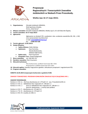 Propozycje Regionalnych i Towarzyskich Zawodów Jeździeckich w Skokach Przez Przeszkody. Wielka Lipa 16-17 maja 2015r. 1. Organizatorzy: 2. 3. 4. 5. 6. 7. 8. 9. 10. 11. Ośrodek Jeździecki ARKADIA, Klub Sportowy Arkadia, Firma „Vital Horse” Miejsce zawodów: Ośrodek Jeździecki ARKADIA, Wielka Lipa 5; 55-120 Oborniki Śląskie, Termin zawodów: 16-17 maja 2015r Zgłoszenia: Zgłoszenia na drukach PZJ z podaniem roku urodzenia zawodnika (M, JM, J, MJ) oraz zaznaczeniem kuc/duży koń e-mail: [email protected] tel.: 0 606 914 528 Termin zgłoszeń: 13.05.2015r. Osoby Oficjalne: Sędzia Główny: Zofia Falińska Sędziowie: Ewa Formicka, Wanda Bonkowska, Elżbieta Dąbrowska, Sędzia stylu: Piotr Krysmann Gospodarz Toru: Paweł Gołygowski Biuro zawodów: tel. 530 305 151 Dyrektor zawodów: Piotr Krysmann Warunki techniczne: Plac konkursowy: podłoże kwarcowe 80 x 50m Rozprężalnia: podłoże kwarcowe 30 x 50m Warunki ogólne: Zawody rozgrywane zgodnie z aktualnymi przepisami i regulaminami PZJ. Program zawodów: SOBOTA 16.05.2015 (rozpoczęcie konkursów o godzinie 9.00) ZAWODY TOWARZYSKIE: PROGRAM KONKURSÓW ZNAJDUJE SIĘ W ZAŁĄCZNIKU NR 1. ZAWODY REGIONALNE: Konkurs nr 3 kl. LL – dla Kucy dwufazowy art. 274 pkt 5.3 - wys. Przeszkód do 80 cm Konkurs nr 4 kl. LL - dokładności bez rozgrywki art. 238 pkt 1.1 Konkurs nr 5 kl. L – Seria A: dokładności bez rozgrywki art. 238 pkt 1.1 Seria B: szkoleniowy – z ocenę stylu jeźdźca Konkurs nr 6 kl. P – dwufazowy art. 274 pkt 5.3 Konkurs nr 7 kl. N – dwufazowy art. 274 pkt 5.3 Konkurs nr 8 kl. N-1 zwykły art.238.2.1 Profesjonalne żywienie koni NIEDZIELA 17.05.2015 (rozpoczęcie konkursów o godzinie 9.00) ZAWODY TOWARZYSKIE: PROGRAM KONKURSÓW ZNAJDUJE SIĘ W ZAŁĄCZNIKU NR 1. ZAWODY REGIONALNE: Konkurs nr 10 kl. LL – dla Kucy dwufazowy art. 274 pkt 5.3 - wys. Przeszkód do 75 cm Konkurs nr 11 kl. LL - dokładności bez rozgrywki art. 238 pkt 1.1 Konkurs nr 12 kl. L –dokładności bez rozgrywki art. 238 pkt 1.1 Konkurs nr 13 kl. L – LICENCYJNY art. 6 Reg. PZJ Konkurs nr 14 kl. P – o wzrastającym stopniu trudności z Jokerem art. 269. Konkurs nr 15 kl. N – zwykły art.238 pkt 2.1 Konkurs nr 16 kl. C – dwufazowy art. 274 pkt 5.3 12. Ostateczne godziny rozpoczęcia konkursów zostaną podane 15.05.2015 (piątek) na stronie http://www.vital-horse.pl– po otrzymaniu ostatecznych zgłoszeń. 13. Dekoracje zwycięzców odbędą się bezpośrednio po zakończeniu konkursów. 14. Opłata organizacyjna: 50 zł od startu. Zamknięcie listy startowej na 1 godz. przed planowanym rozpoczęciem konkursu. Opłatę należy uiścić przed zamknięciem listy. KAŻDA ZMIANA NA LIŚCIE STARTOWEJ PO JEJ ZAMKNIĘCIU PODLEGA OPŁACIE 30 ZŁ. Zgłoszenia po terminie mogą być przyjęte za zdwojoną opłatą organizacyjną. 15. UWAGI: - konkursy nr 3 i 10 odbędą się przy zgłoszeniu minimum 3 kucy, - zgłoszenie się do zawodów jest równoznaczne z zaakceptowaniem propozycji zawodów, - zgłoszenie e-mailem jest ważne po otrzymaniu potwierdzenia o jego przyjęciu, - organizator nie odpowiada za wypadki i kradzieże w czasie zawodów i transportu, - organizator zastrzega sobie prawo do zmian programu zawodów oraz ograniczenia ilości startujących koni – decyduje kolejność zgłoszeń, - informacje dodatkowe pod numerem telefonu: 0 606 914 528, 16. Boksy: Rezerwacja do dnia 11.05.2015r Opłata za całe zawody: 180 zł, 1 dzień 90 zł. Organizator zapewnia pierwsze ścielenie słomą. Boksy będą dostępne od piątku od godziny 18.00 Opłaty za boksy należy przesłać na numer konta: BZ WBK 77 1090 1522 0000 0001 0160 5882 W tytule przelewu należy umieścić imię i nazwisko zawodnika oraz imię konia. Potwierdzenie przelewu należy przesłać wraz ze zgłoszeniami ostatecznymi. Opłaty za boksy nie podlegają zwrotowi w przypadku rezygnacji ze startu w zawodach. 17. W konkursach towarzyskich obowiązuje zgoda rodziców dla osób niepełnoletnich, zaświadczenie lekarskie o zdolności do wzięcia udziału w zawodach, dla konia paszport z aktualnymi szczepieniami . 18. W konkursach bez rozgrywki klasy LL i L (do 105 cm) duży koń w wieku od 6 lat może startować trzykrotnie w ciągu dnia z zachowaniem zasady dwukrotnego startu w konkursie . 19. Nagrody: Organizator przewiduje nagrody rzeczowe, honorowe oraz flot’s dla zwycięzców. Konkurs nr 8: I miejsce – 150 zł, II miejsce – 100 zł, III miejsce – 50 zł Konkurs nr 14: I miejsce – 150 zł, II miejsce – 100 zł, III miejsce – 50 zł Konkurs nr 15: I miejsce – 200 zł, II miejsce – 150 zł, III miejsce – 100 zł Konkurs nr 16: I miejsce – 250 zł, II miejsce – 200 zł, III miejsce – 100 zł Łączna pula nagród: 1600 zł + nagrody rzeczowe i honorowe 20. Na miejscu istnieje możliwość rezerwacji noclegów w Villi Barbara – tel. 504 595 549. 21. Propozycje zatwierdzone przez Dolnośląski Związek Jeździecki Profesjonalne żywienie koni KODEKS POSTĘPOWANIA Z KONIEM Międzynarodowa Federacja Jeździecka (FEI) oczekuje od wszystkich osób zaangażowanych w sport jeździecki respektowania wydanego przez FEI Kodeksu Postępowania z Końmi, jak również przestrzegania zasady, że dobro koni jest najważniejsze. Dobro koni musi być zawsze uwzględniane we współzawodnictwie sportowym oraz nie może być podporządkowane celom komercyjnym. 1. Na każdym etapie przygotowań i treningu konia do zawodów jego dobro musi być stawiane na pierwszym miejscu. Dotyczy to stałej dbałości o konia, stosowanych metod treningowych, kucia i obrządzania oraz transportu. 2. Konie i zawodnicy muszą być dobrze przygotowani, zgrani ze sobą, odznaczać się dobrym zdrowiem, zanim zostaną dopuszczeni do startu w zawodach. Odnosi się to również do pomocy weterynaryjnej, zapewnienia bezpieczeństwa po operacjach , w czasie ciąży oraz interwencji w razie złego traktowania konia. 3. Zawody nie mogą zagrażać dobru konia. Oznacza to, że należy zw