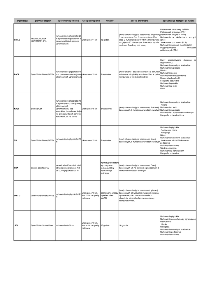 organizacja CMAS PADI NAUI SSI HSA IANTD SDI pierwszy stopień PŁETWONUREK KDP/CMAS* (P1) uprawnienia po kursie wiek przystąpienia nurkowanie do głębokości 20 m z pełnoletnim partnerem o ukończone 14 lat co najmniej takich samych uprawnieniach Open Water Diver (OWD) nurkowanie do głębokości 18 m z partnerem o co najmniej ukończone 15 lat takich samych uprawnieniach Scuba Diver nurkowanie do głębokości 18 m z partnerem o co najmniej takich samych uprawnieniach, pod ukończone 15 lat warunkiem że nurkowanie jes nie głębiej i w takich samych warunkach jak na kursie wykłady zajęcia praktyczne 16 godzin Płetwonurek nitroksowy 1 (PN1) Płetwonurek archeolog (PA1) (wody otwarte i zajęcia basenowe): 24 godziny,Płetwonurek fotograf 1 (PF1) 3 zanurzenia do 5 m, 3 zanurzenia do 10m, Nurkowanie w skafandrach suchych oraz 2 nurkowania na 10-15m i 2 nurkowania (SS1) na głębokość 20 m (w tym 1 nocne) – łącznie Nurkowanie pod lodem (PL1) Nurkowanie wrakowo-morskie (WM1) minimum 2 godziny pod wodą Przygotowywanie mieszanin oddechowych (GB1) 5 wykładów Kursy specjalistyczne dostępne stopniu OWD: Nurkowanie w suchym skafandrze Nurkowanie w prądzie Nitroks (wody otwarte i zajęcia basenowe): 5 zanurzeń Nurkowanie nocne w basenie lub płytkiej wodzie do 10m, 4 pełne Nurkowanie wielopoziomowe nurkowania w wodach otwartych Doskonała pływalność Fotografia podwodna Nurkowania górskie Nurkowania z łodzi i inne brak danych Nurkowanie w suchym skafandrze Nitroks (wody otwarte i zajęcia basenowe): 5 –6 sesji Nurkowanie z łodzi basenowych, 5 nurkowań w wodach otwartych Nurkowanie w prądzie Nurkowanie z komputerem nurkowym Fotografia podwodna i inne Nurkowanie głębokie Nurkowanie nocne Nawigacja Nitrox Nurkowanie w suchym skafandrze (wody otwarte i zajęcia basenowe): 5 sesji Nurkowanie z łodzi Nurkowanie basenowych, 5 nurkowań w wodach otwartych podlodowe Nurkowanie wrakowe Wiedza o sprzęcie Nurkowanie z komputerem Fotografia podwodna Open Water Diver (OWD) nurkowanie do głębokości 18 ukończone 15 lat m 6 wykładów stopień podstawowy samodzielność w zależności od kategorii przyznanej A,B lub C, do głębokości 20 m wykłady prowadzone (wody otwarte i zajęcia basenowe): 7 sesji wg programu basenowych lub na akwenie ograniczonym, 5 federacji, którą nurkowań w wodach otwartych reprezentuje instruktor Open Water Diver (OWD) ukończone 18 lat, nurkowanie do głębokości 21 lub 15 lat za zgodą m rodziców (wody otwarte i zajęcia basenowe): tyle sesji opanowanie wiedzy basenowych aż wszystkie ćwiczenia zostaną opanowane, 4-6 nurkowań w wodach z podręcznika otwartych, minimalny łączny czas denny IANTD nurkowań 80 min. Open Water Scuba Diver nurkowanie do 20 m ukończone 18 lat, lub 14 lat za zgodą rodziców specjalizacje dostępne po kursie 15 godzin 10 godzin po Nurkowanie głębokie Nurkowanie nocne lub przy ograniczonej widoczności Nitroks Nawigacja Nurkowanie w suchym skafandrze Nurkowanie podlodowe Nurkowanie wrakowe