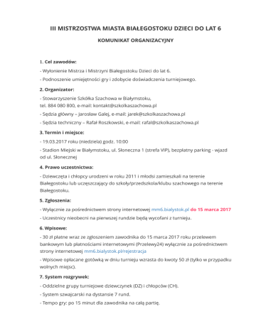 III MISTRZOSTWA MIASTA BIAŁEGOSTOKU DZIECI DO LAT 6 KOMUNIKAT ORGANIZACYJNY 1. Cel zawodów: - Wyłonienie Mistrza i Mistrzyni Białegostoku Dzieci do lat 6. - Podnoszenie umiejętności gry i zdobycie doświadczenia turniejowego. 2. Organizator: - Stowarzyszenie Szkółka Szachowa w Białymstoku, tel. 884 080 800, e-mail: [email protected] - Sędzia główny – Jarosław Galej, e-mail: [email protected] - Sędzia techniczny – Rafał Roszkowski, e-mail: [email protected] 3. Termin i miejsce: - 19.03.2017 roku (niedziela) godz. 10:00 - Stadion Miejski w Białymstoku, ul. Słoneczna 1 (strefa VIP), bezpłatny parking - wjazd od ul. Słonecznej 4. Prawo uczestnictwa: - Dziewczęta i chłopcy urodzeni w roku 2011 i młodsi zamieszkali na terenie Białegostoku lub uczęszczający do szkoły/przedszkola/klubu szachowego na terenie Białegostoku. 5. Zgłoszenia: - Wyłącznie za pośrednictwem strony internetowej mm6.bialystok.pl do 15 marca 2017 - Uczestnicy nieobecni na pierwszej rundzie będą wycofani z turnieju. 6. Wpisowe: - 30 zł płatne wraz ze zgłoszeniem zawodnika do 15 marca 2017 roku przelewem bankowym lub płatnościami internetowymi (Przelewy24) wyłącznie za pośrednictwem strony internetowej mm6.bialystok.pl/rejestracja - Wpisowe opłacane gotówką w dniu turnieju wzrasta do kwoty 50 zł (tylko w przypadku wolnych miejsc). 7. System rozgrywek: - Oddzielne grupy turniejowe dziewczynek (DZ) i chłopców (CH). - System szwajcarski na dystansie 7 rund. - Tempo gry: po 15 minut dla zawodnika na całą partię. - Kojarzenie komputerowe programem ChessArbiter Pro publikowane na www.chessarbiter.com. - Oddzielna klasyfikacja dziewcząt i chłopców. - W przypadku równej liczby punktów o kolejności miejsc decydują kolejno: średni Buchholz, pełny Buchholz, progresja, liczba zwycięstw. - Obowiązują aktualne przepisy Kodeksu Szachowego PZSzach. 8. Nagrody: - Puchary, medale i nagrody (zestawy szachów z zegarem DGT 960) za miejsca I - III w grupach dziewcząt i chłopców. - Puchary za miejsca I - III w roczniku 2012 i młodsi. - Dyplomy i nagrody dla wszystkich startujących. 9. Uwagi dodatkowe: - Warunkiem otrzymania nagród jest obecność na uroczystym zakończeniu. Z powodów organizacyjnych nagrody nie będą wydawane osobno ani przed ani po zakończeniu turnieju. Przewidujemy możliwość przekazania nagród w późniejszym terminie jedynie poprzez instruktorów szachowych. W trakcie zawodów dzieci pozostają pod opieką rodziców/opiekunów. W sprawach nieujętych w regulaminie turnieju lub Kodeksie Szachowym decyduje sędzia główny. Akceptując regulamin uczestnik turnieju wyraża zgodę na wykorzystanie przez organizatora podanych danych osobowych w celu przeprowadzenia turnieju oraz publikacji jego wyników. Akceptując regulamin uczestnik turnieju oraz osoby towarzyszące wyrażają zgodę na wykorzystanie swojego wizerunku na stronach internetowych oraz profilach społecznościowych organizatora (np. do pamiątkowych galerii zdjęć z imprezy) a także do przekazywania zdjęć, informacji i wyników mediom lokalnym i ogólnopolskim. /…/ Jarosław Galej